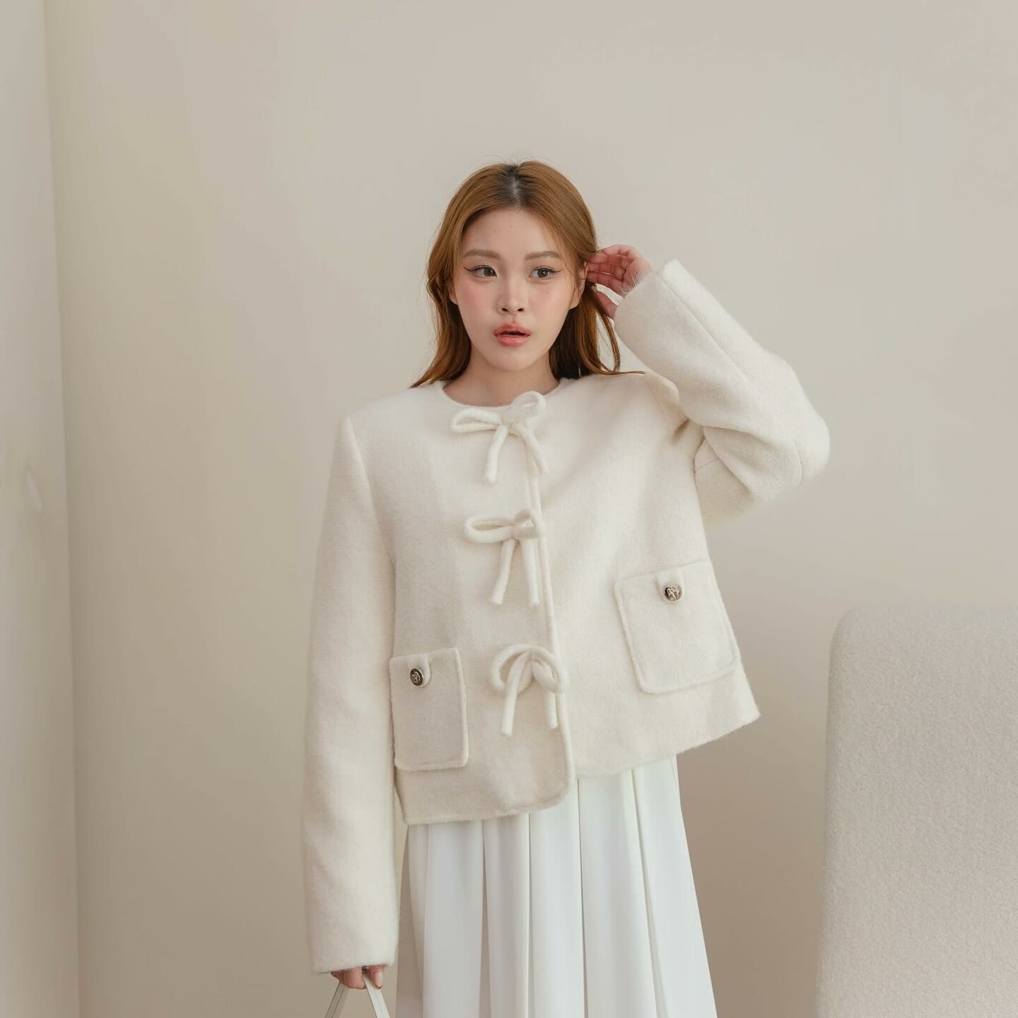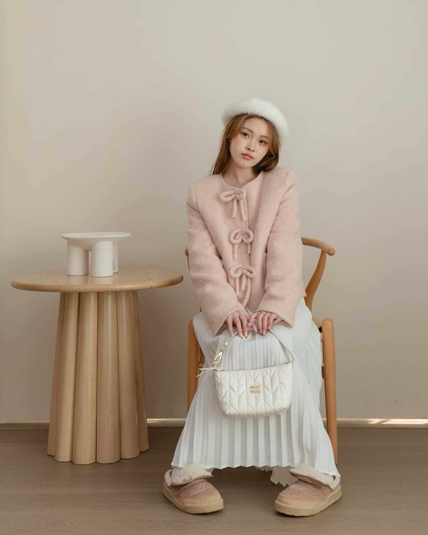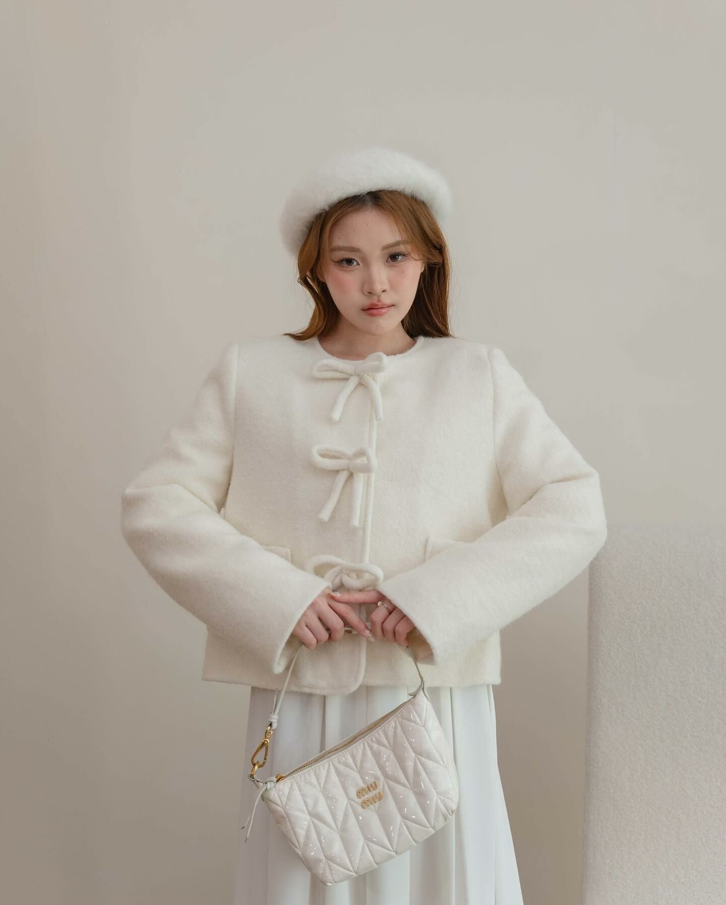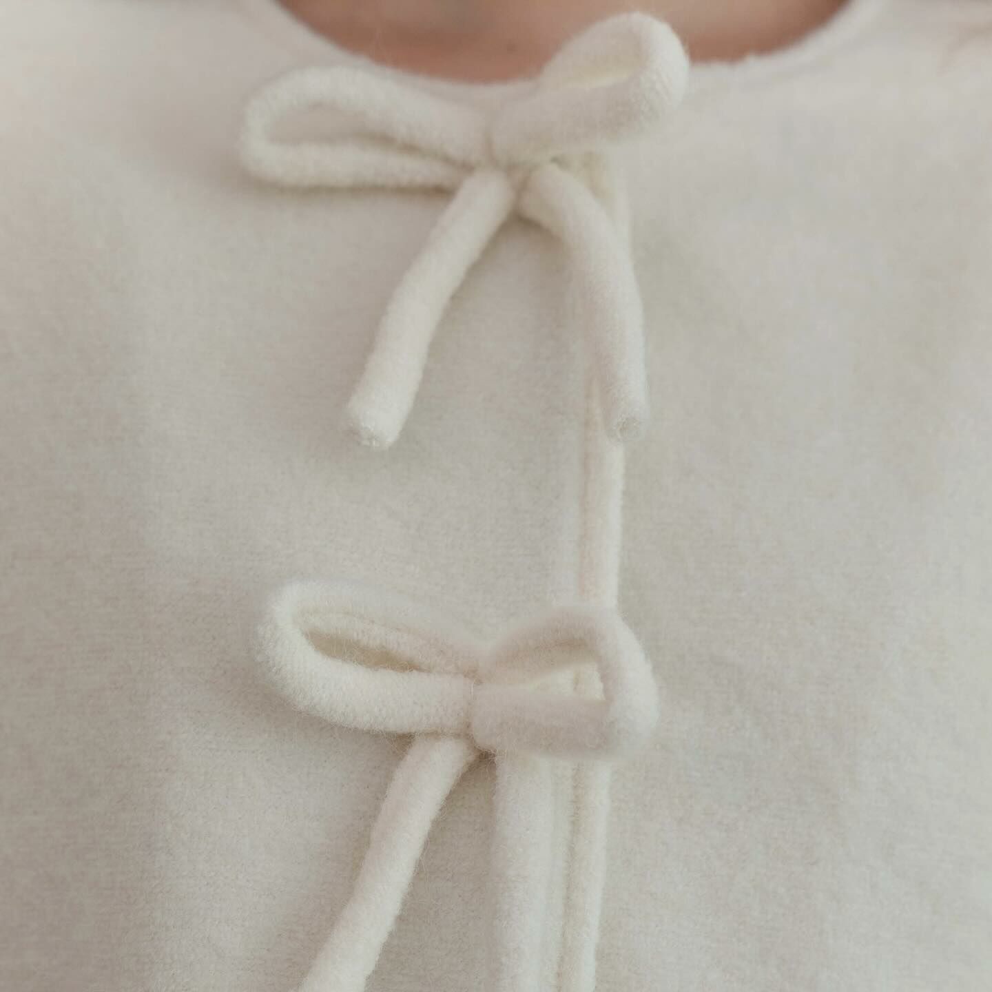 羊毛開襟衫內襯是90%鴨絨,很溫暖。正面有蝴蝶結細節 + 口袋上有蝴蝶結扣。這款非常適合年輕女士。
