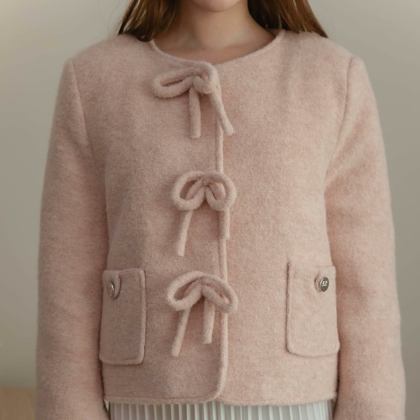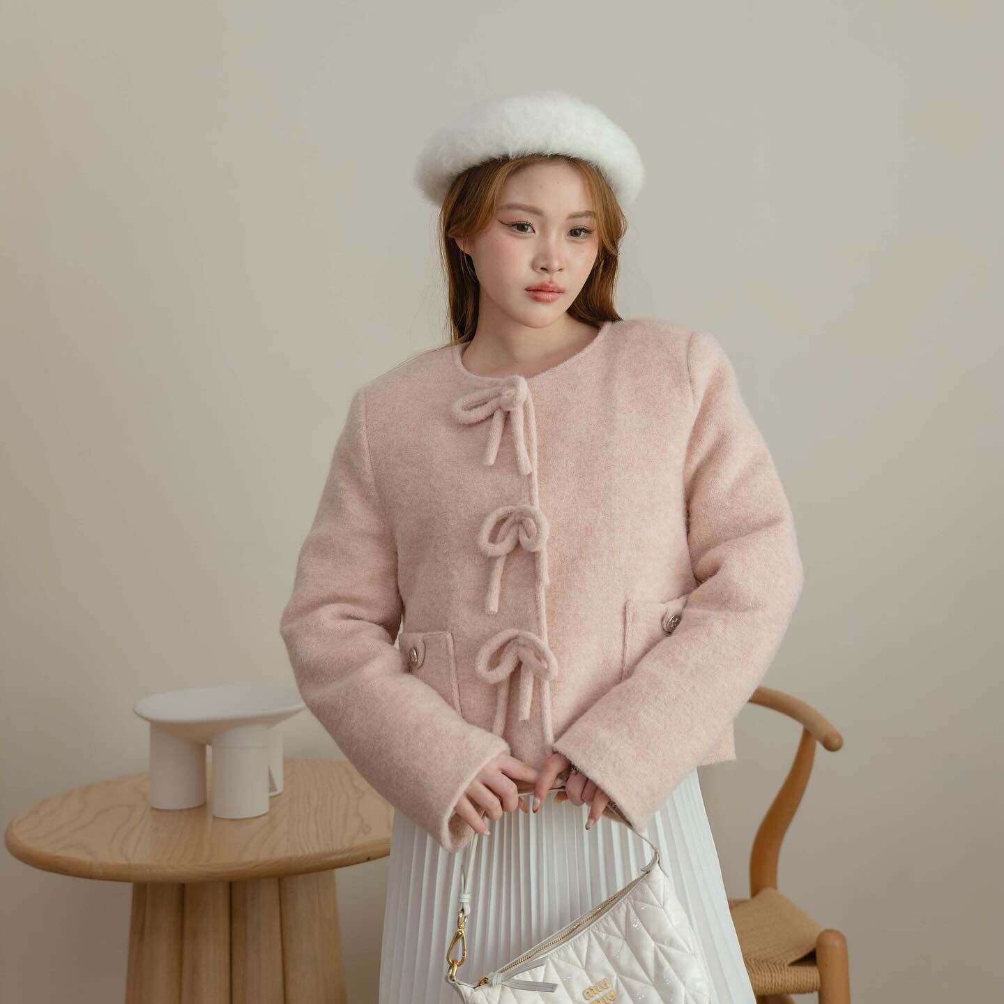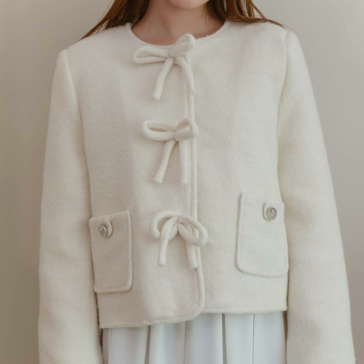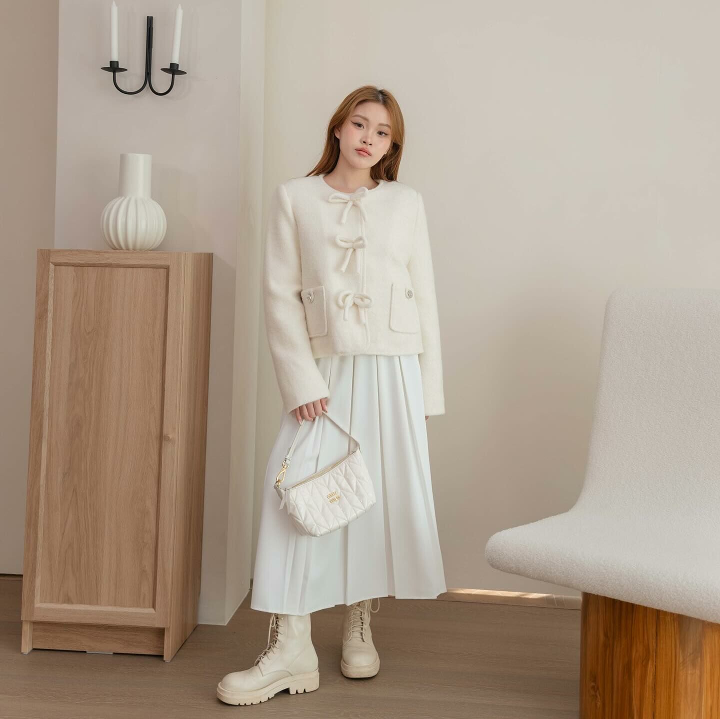 羊毛開襟衫內襯是90%鴨絨,很溫暖。正面有蝴蝶結細節 + 口袋上有蝴蝶結扣。這款非常適合年輕女士。