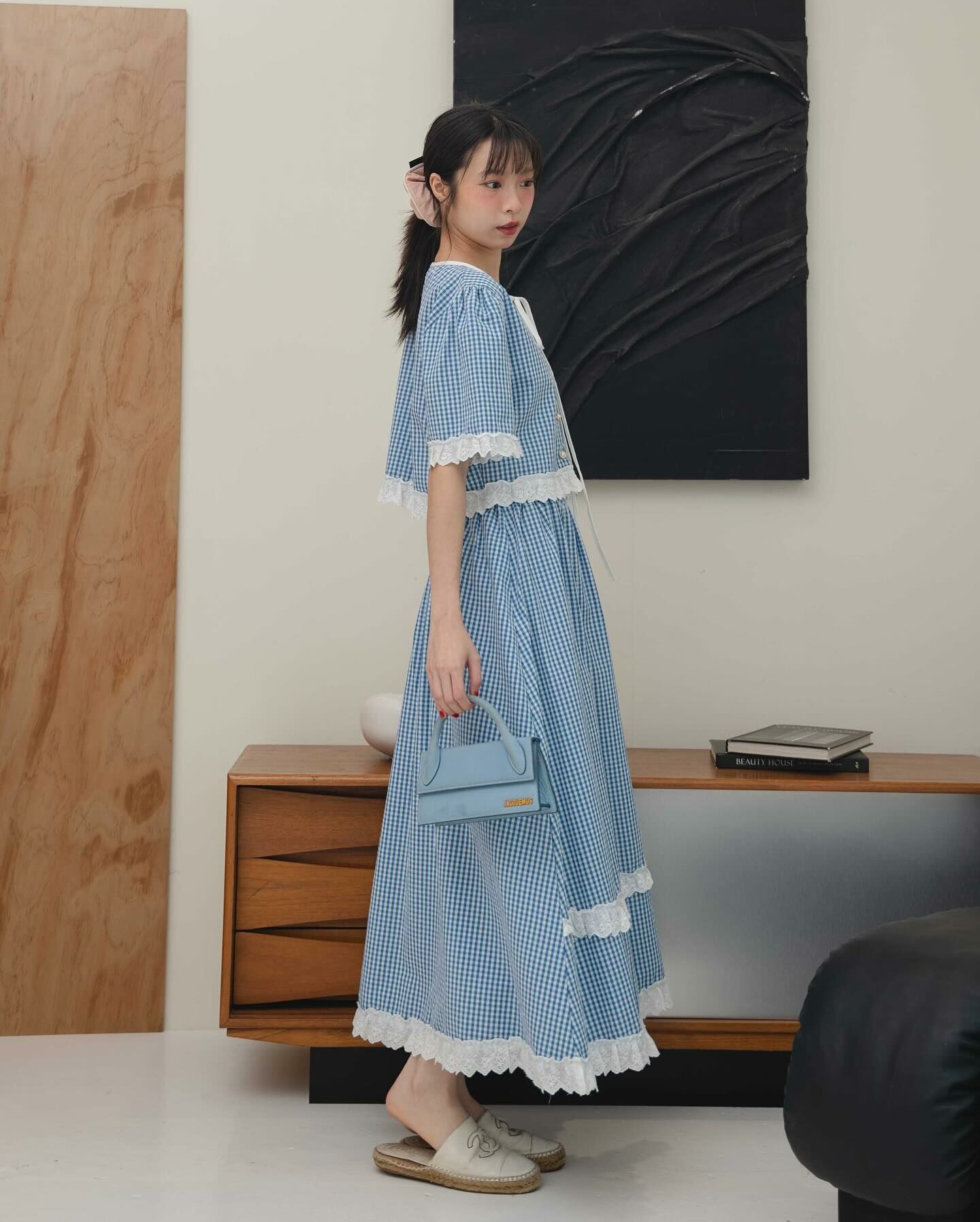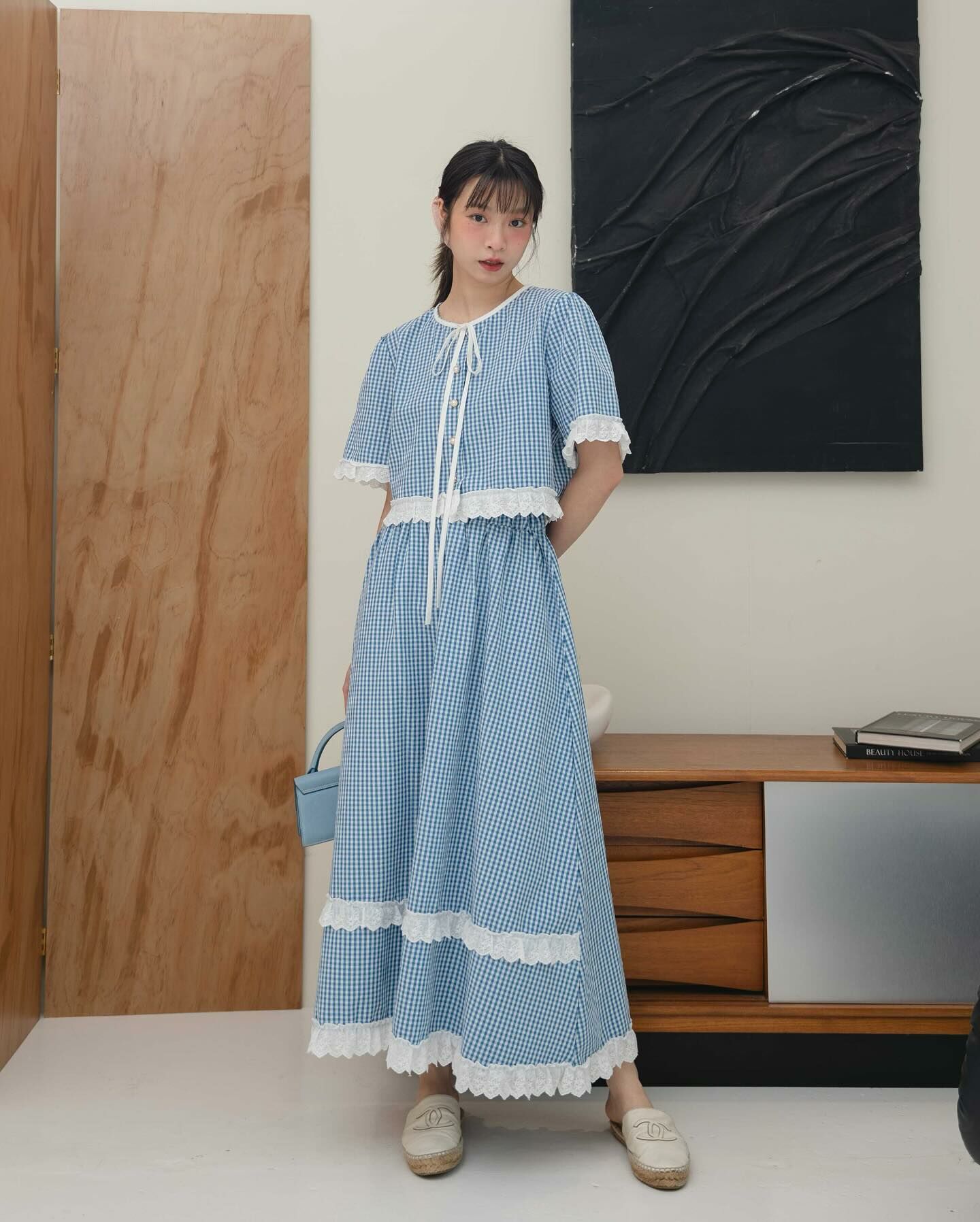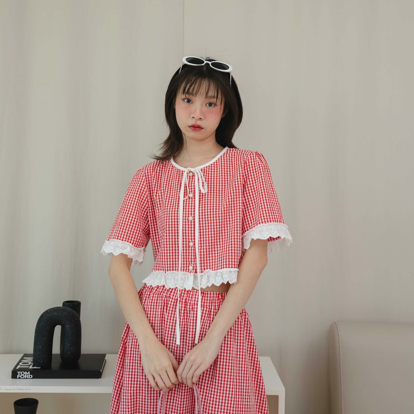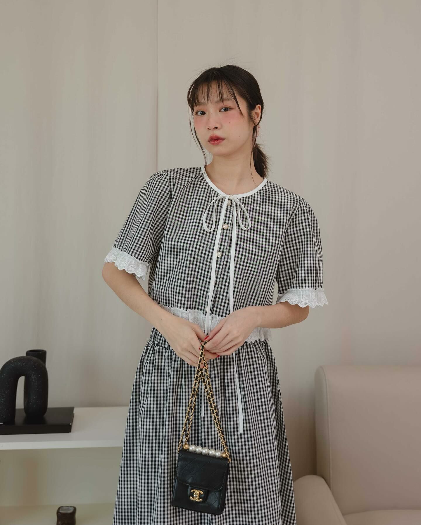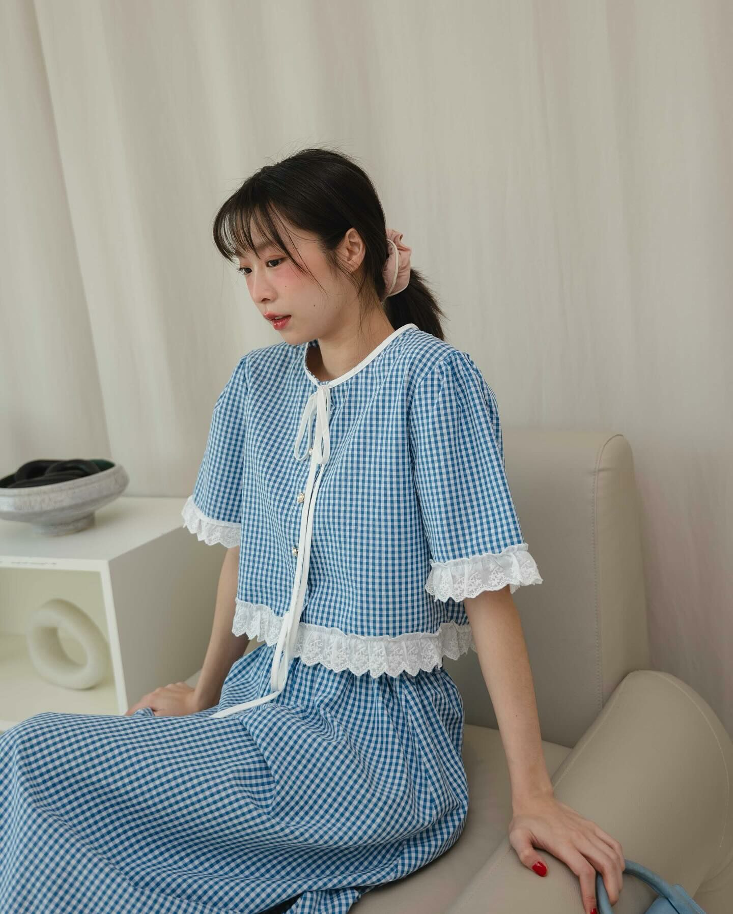 棉質襯衫和裙子套裝,帶有珍珠紐帶細節、蕾絲和蝴蝶結。很可愛。裙子有鬆緊腰帶。