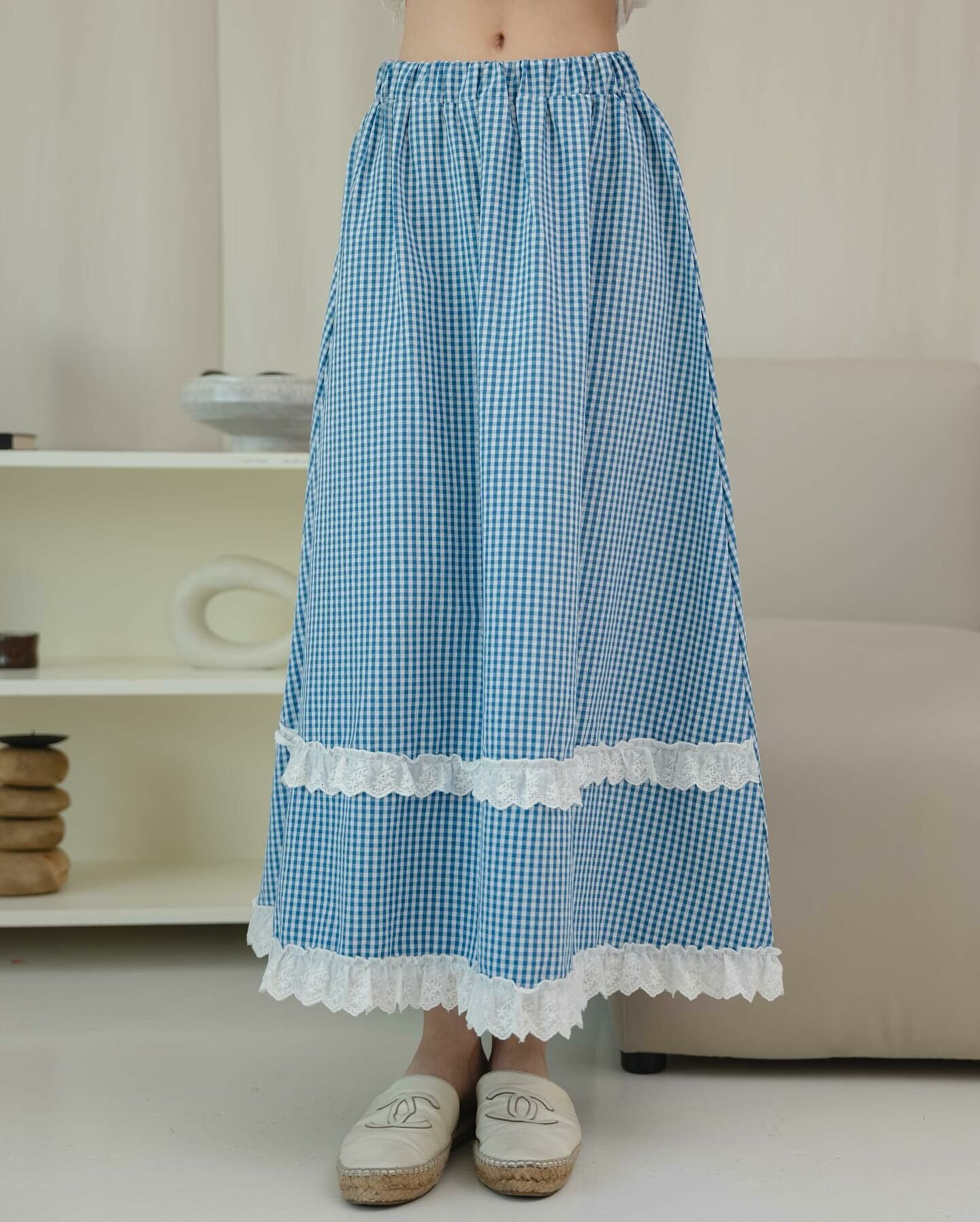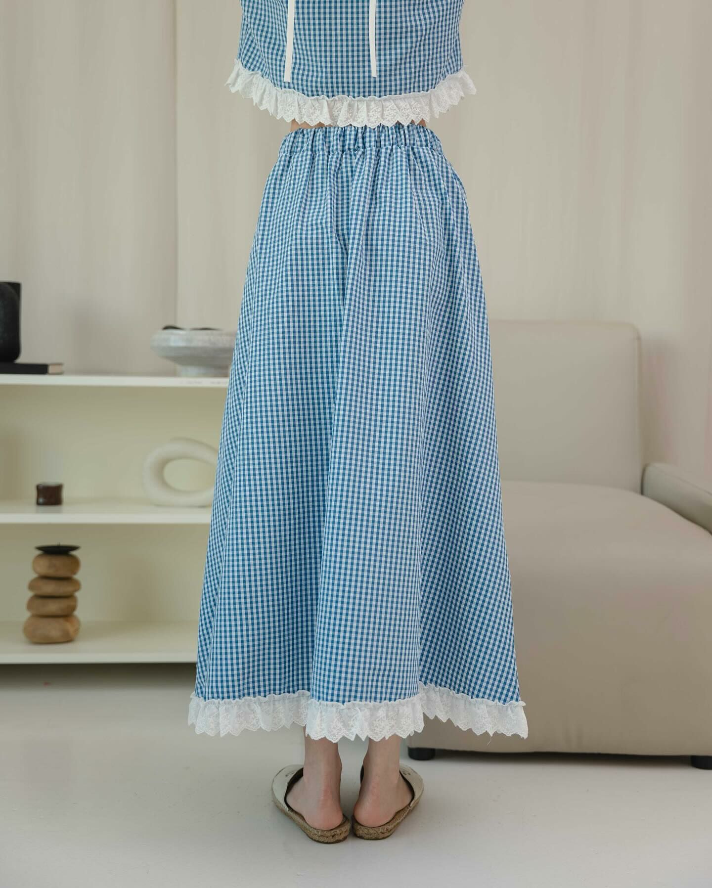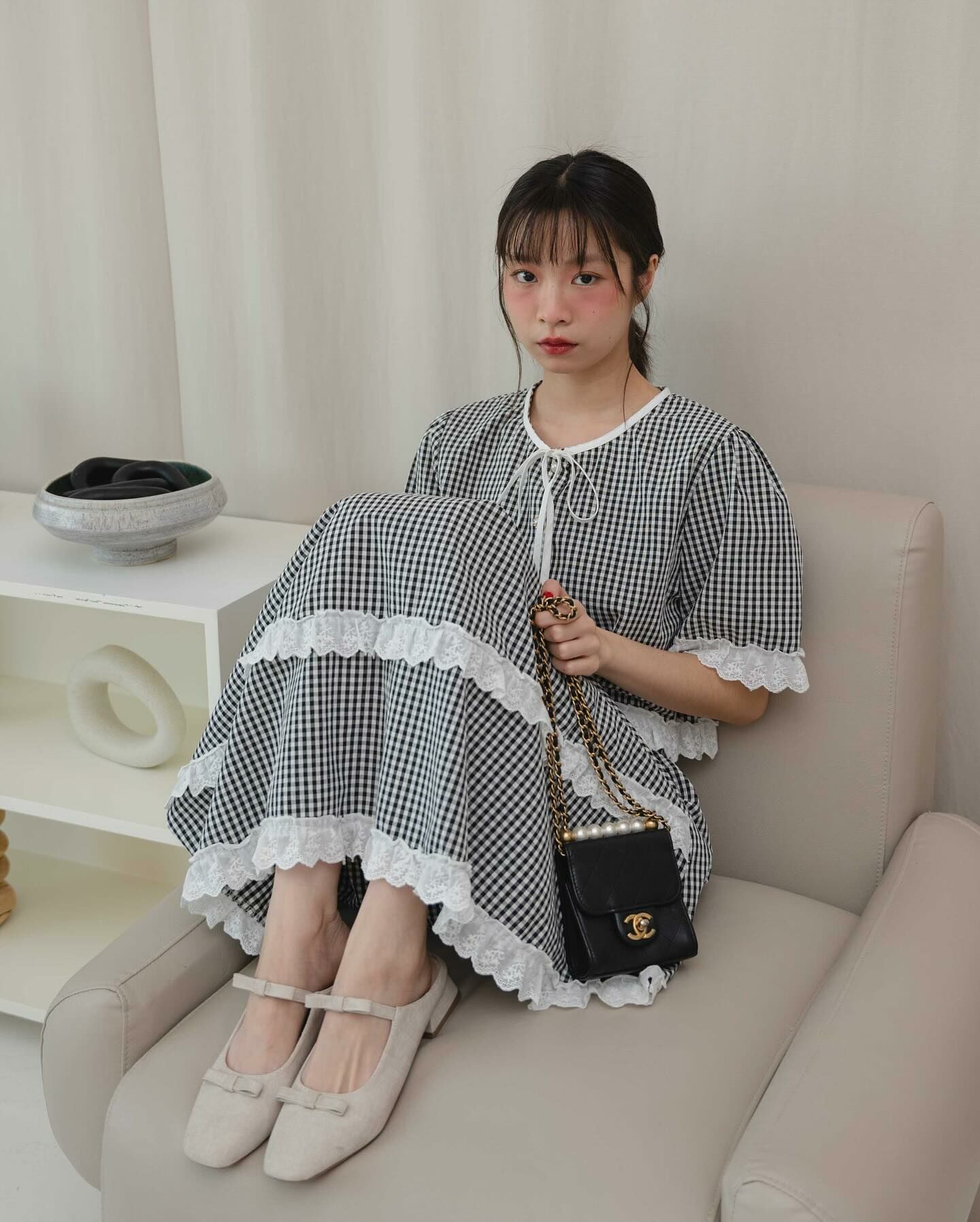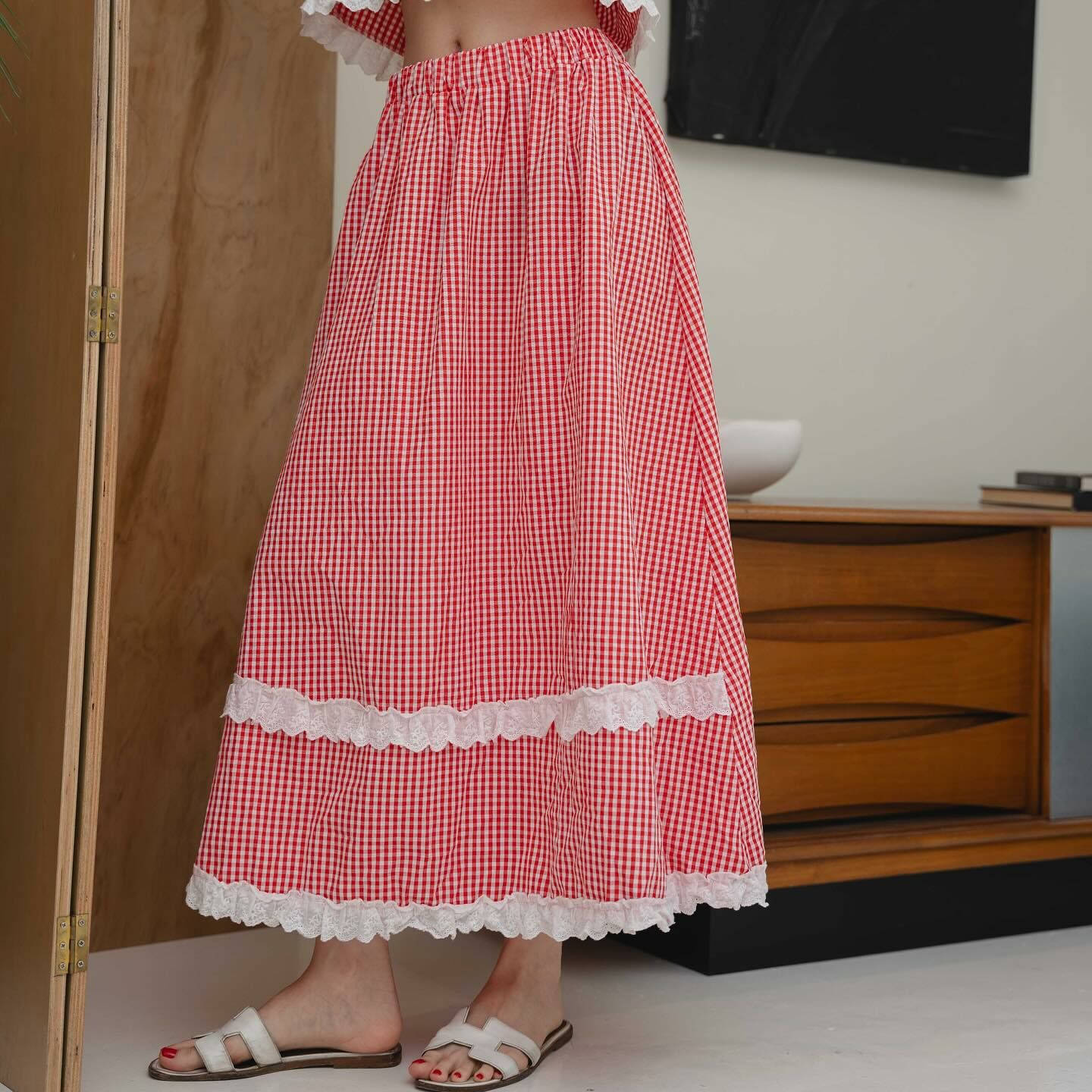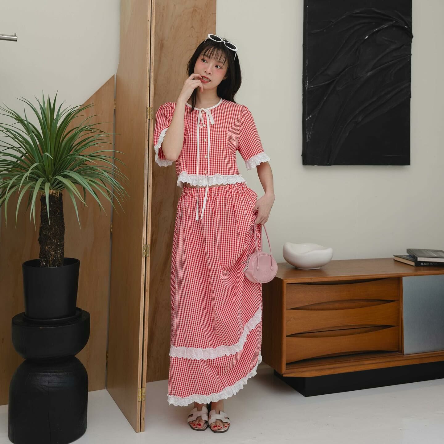 棉質襯衫和裙子套裝,帶有珍珠紐帶細節、蕾絲和蝴蝶結。很可愛。裙子有鬆緊腰帶。