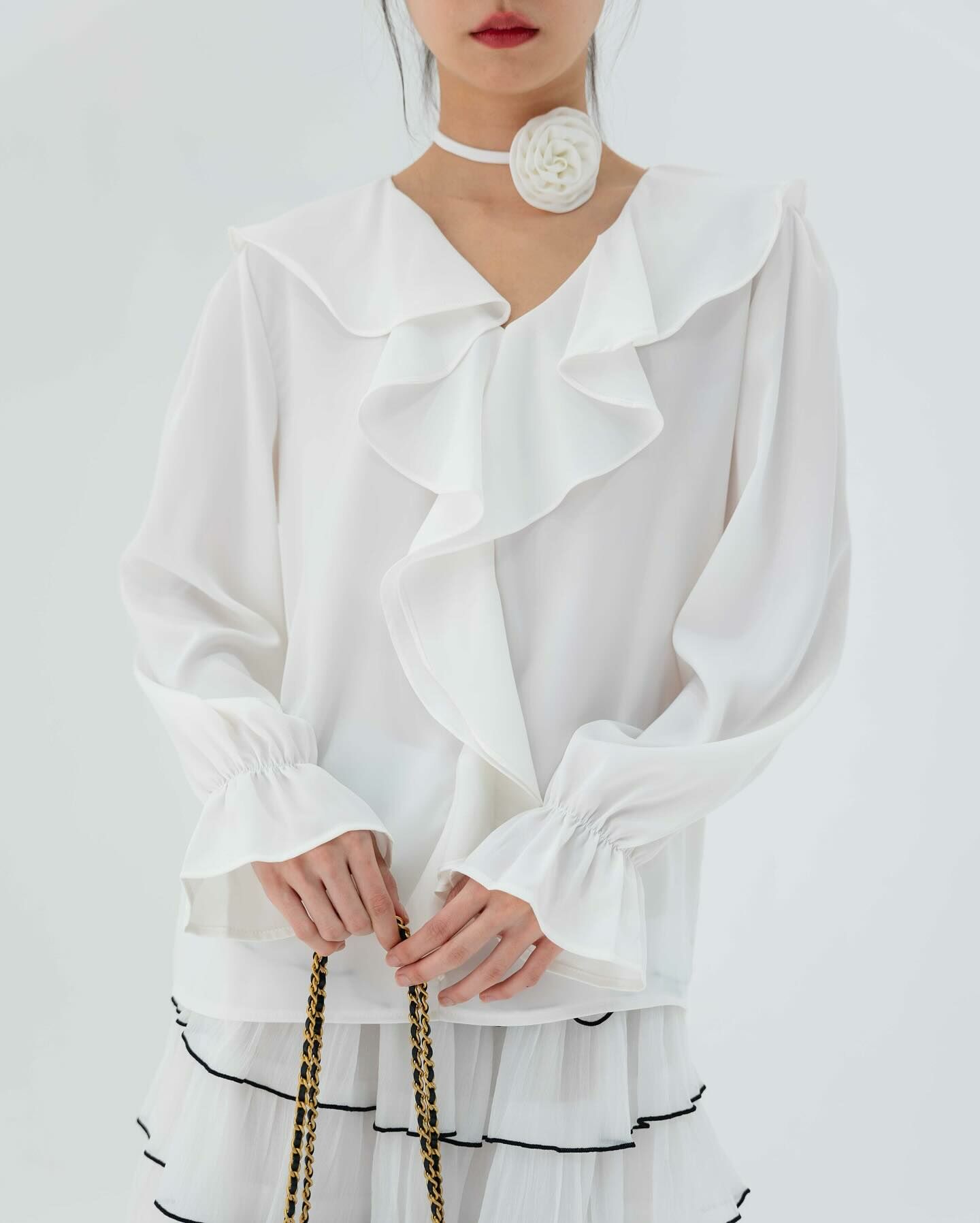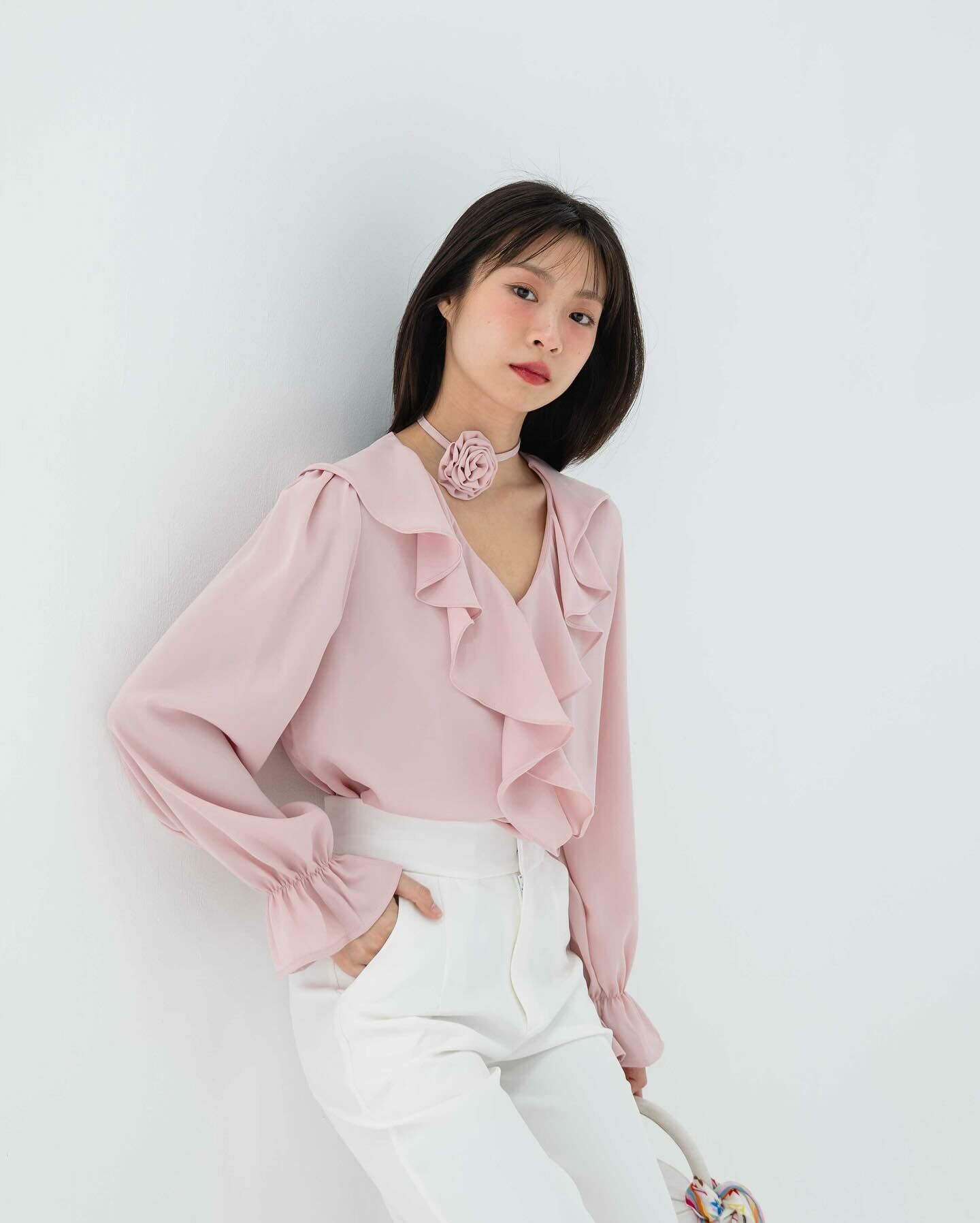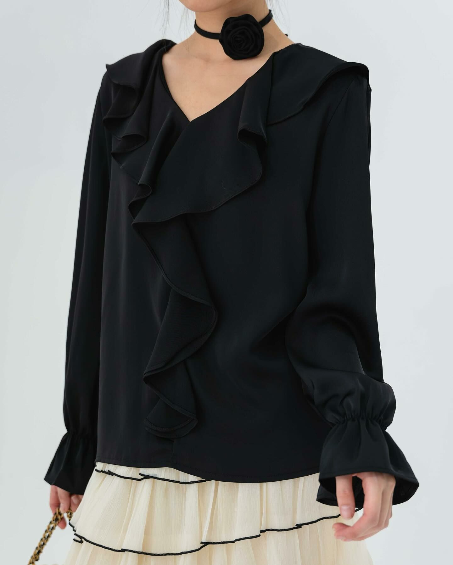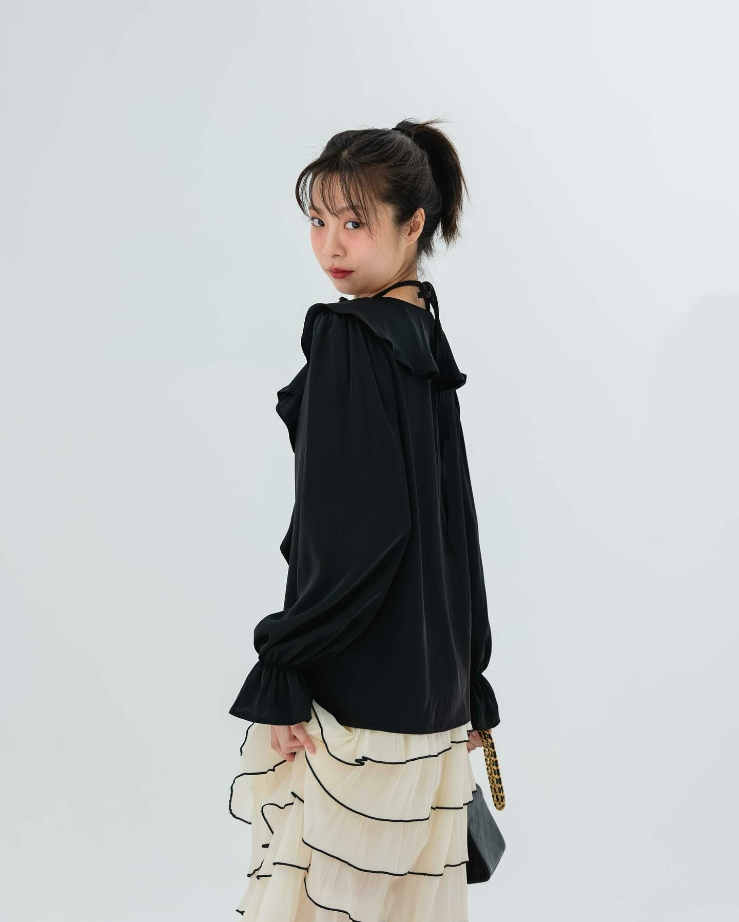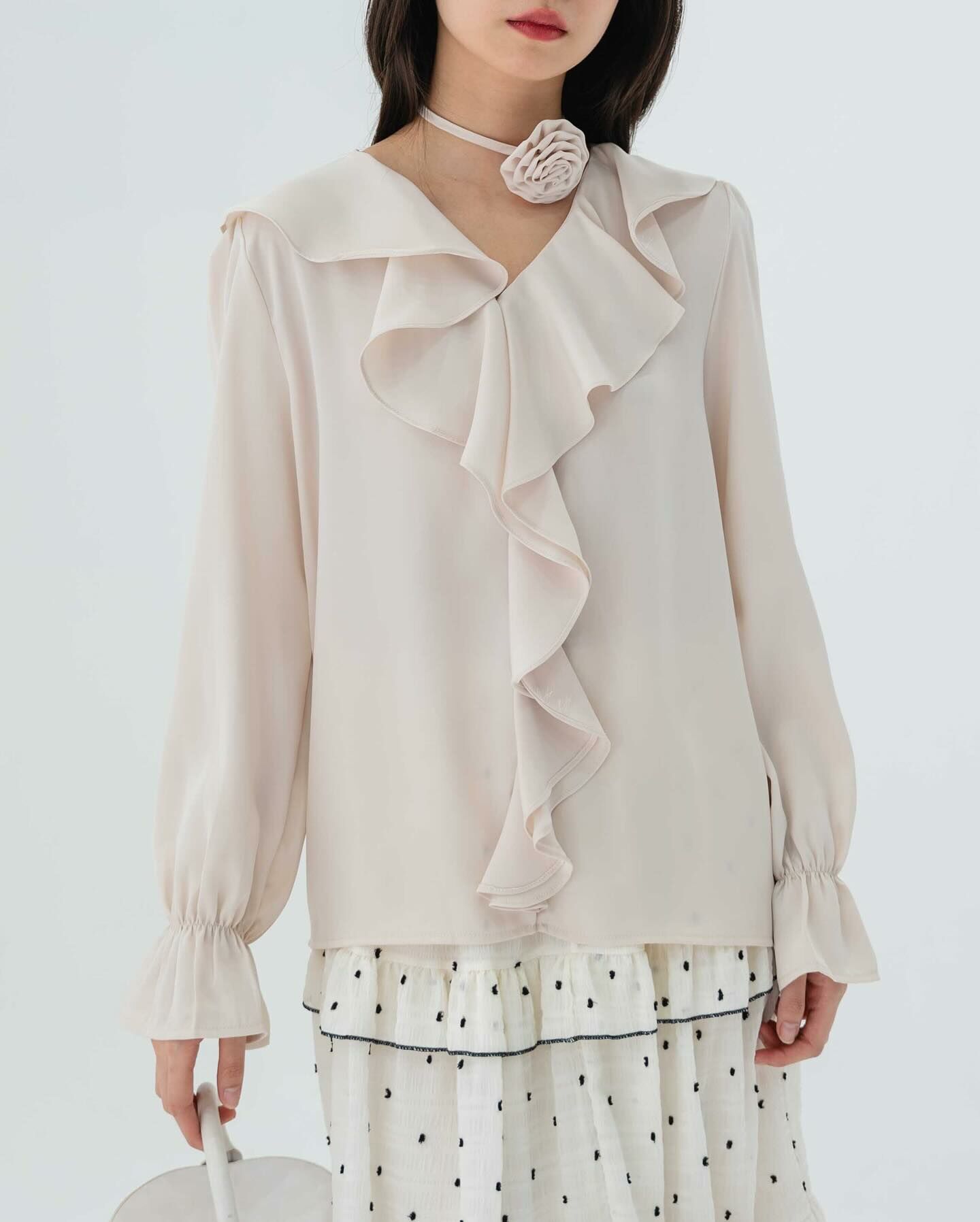 長袖絲緞襯衫,非常舒適涼爽,前面有荷葉邊下擺,配有胸針和玫瑰繩,可繫在脖子上