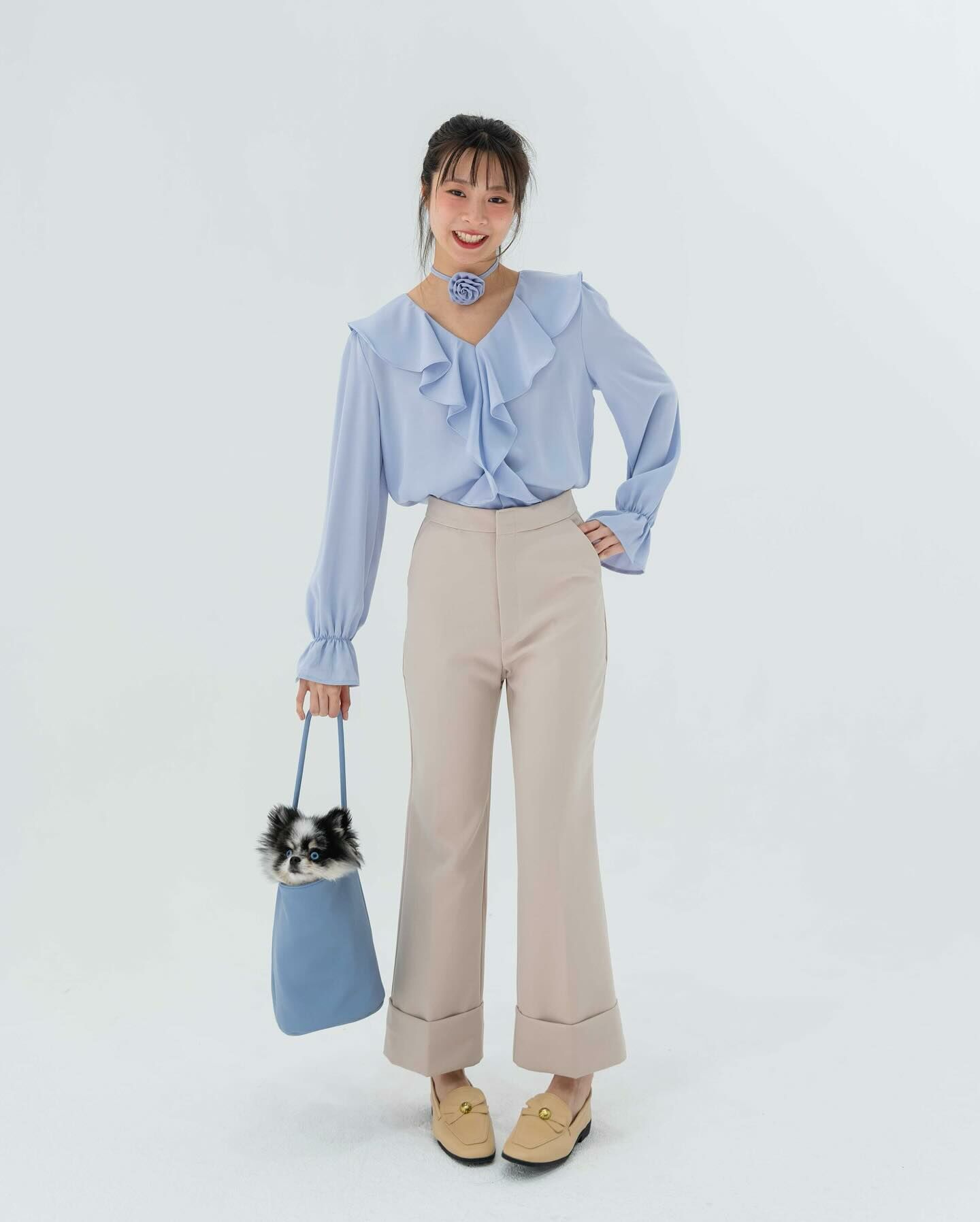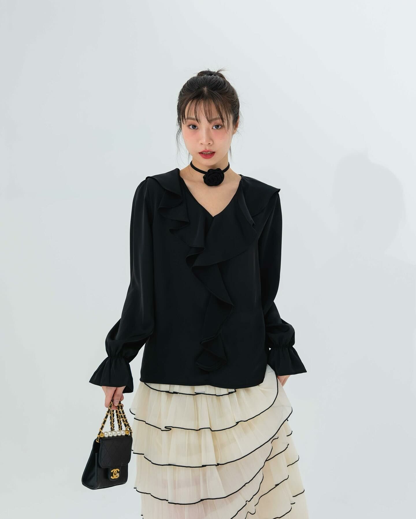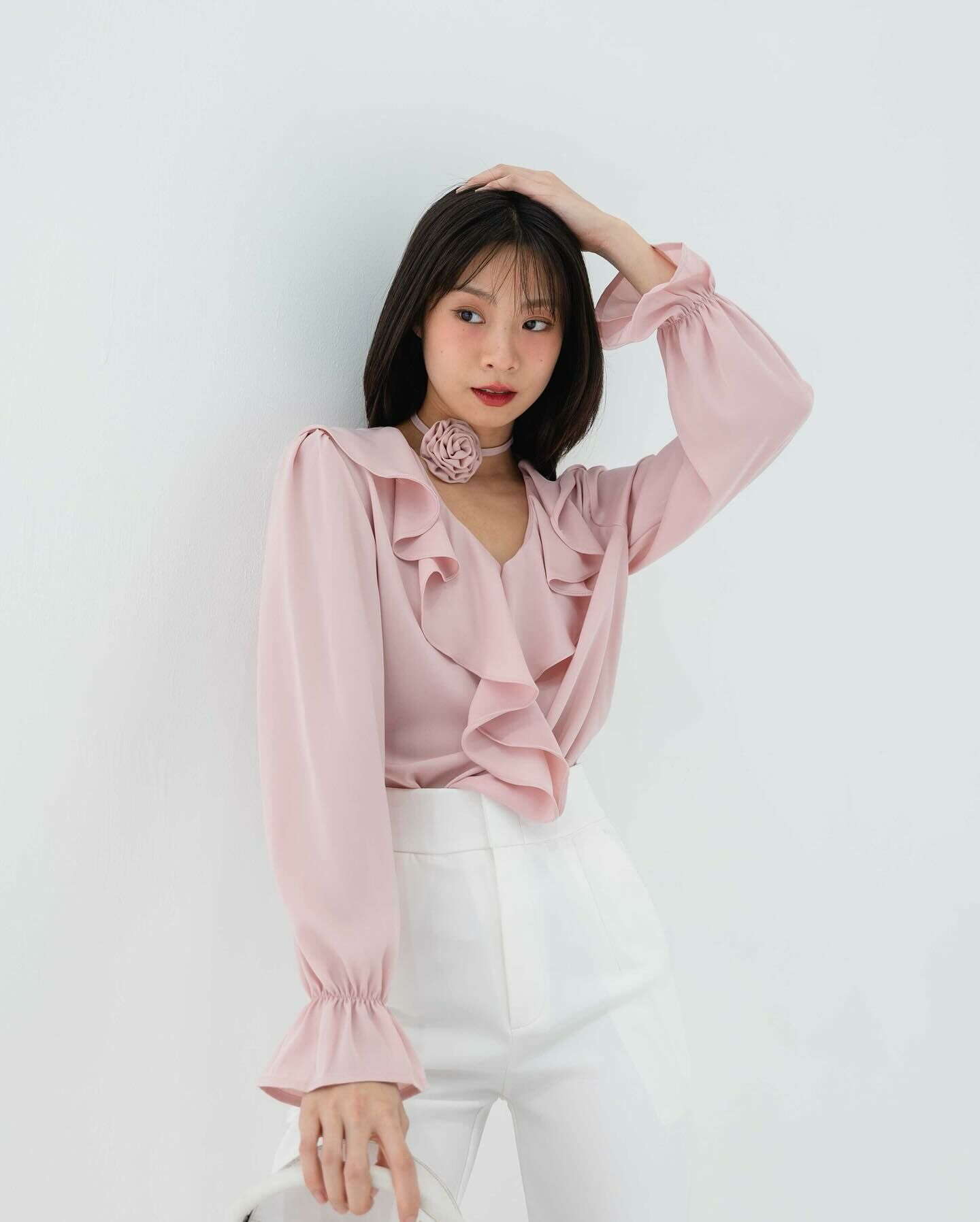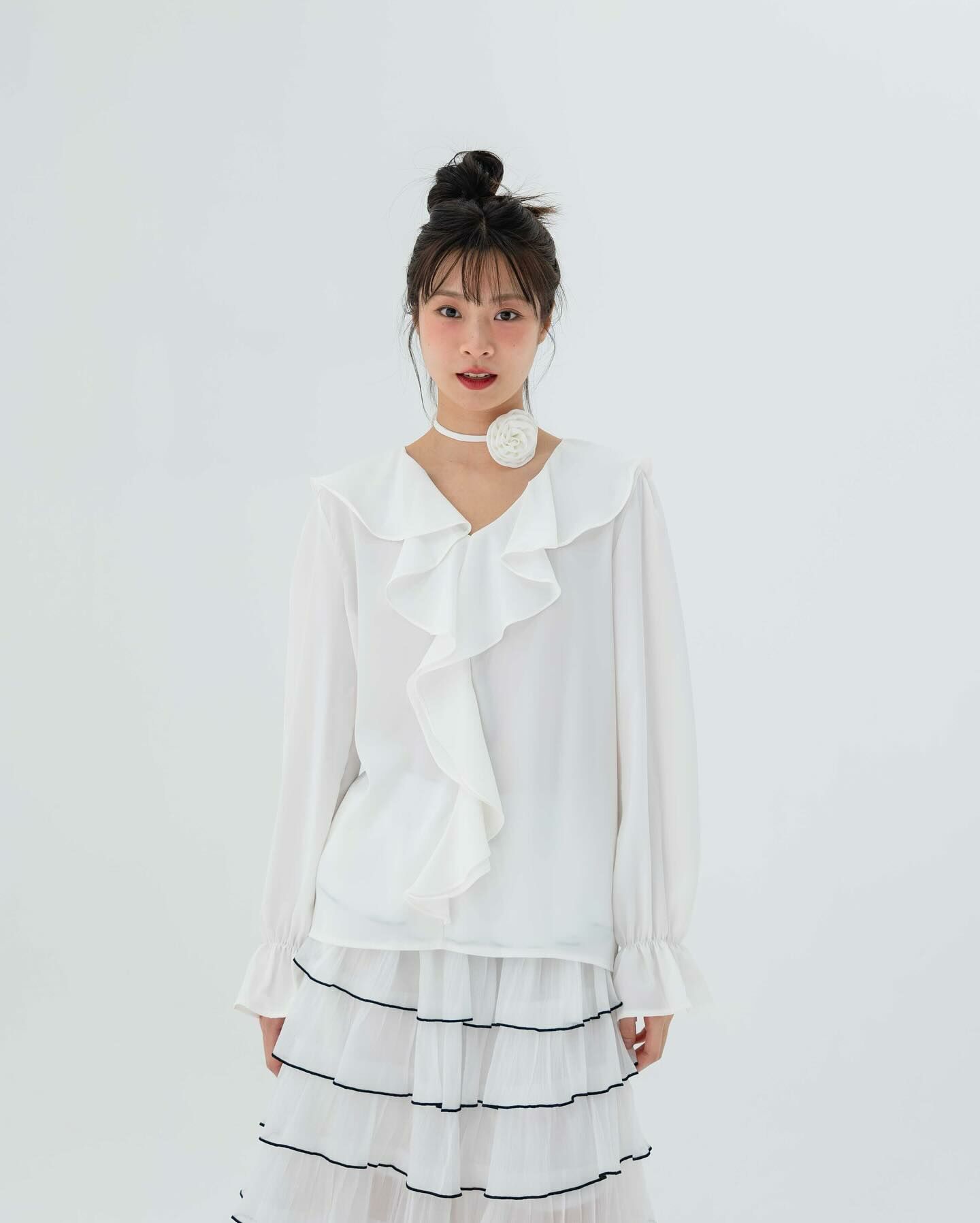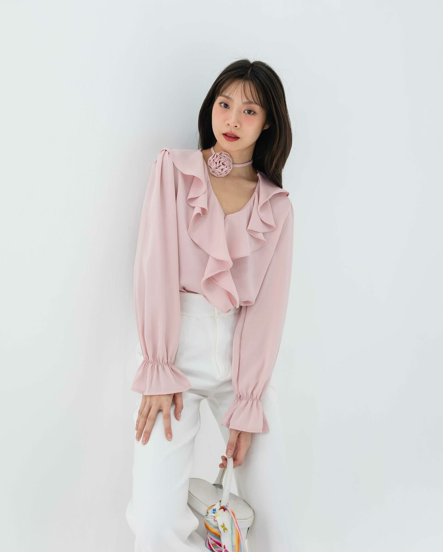長袖絲緞襯衫,非常舒適涼爽,前面有荷葉邊下擺,配有胸針和玫瑰繩,可繫在脖子上