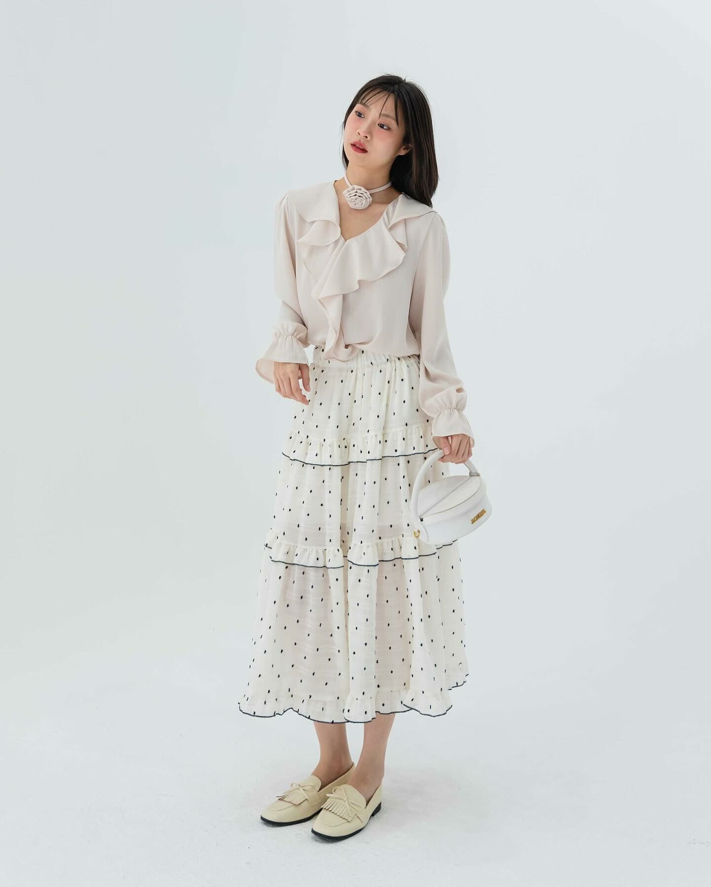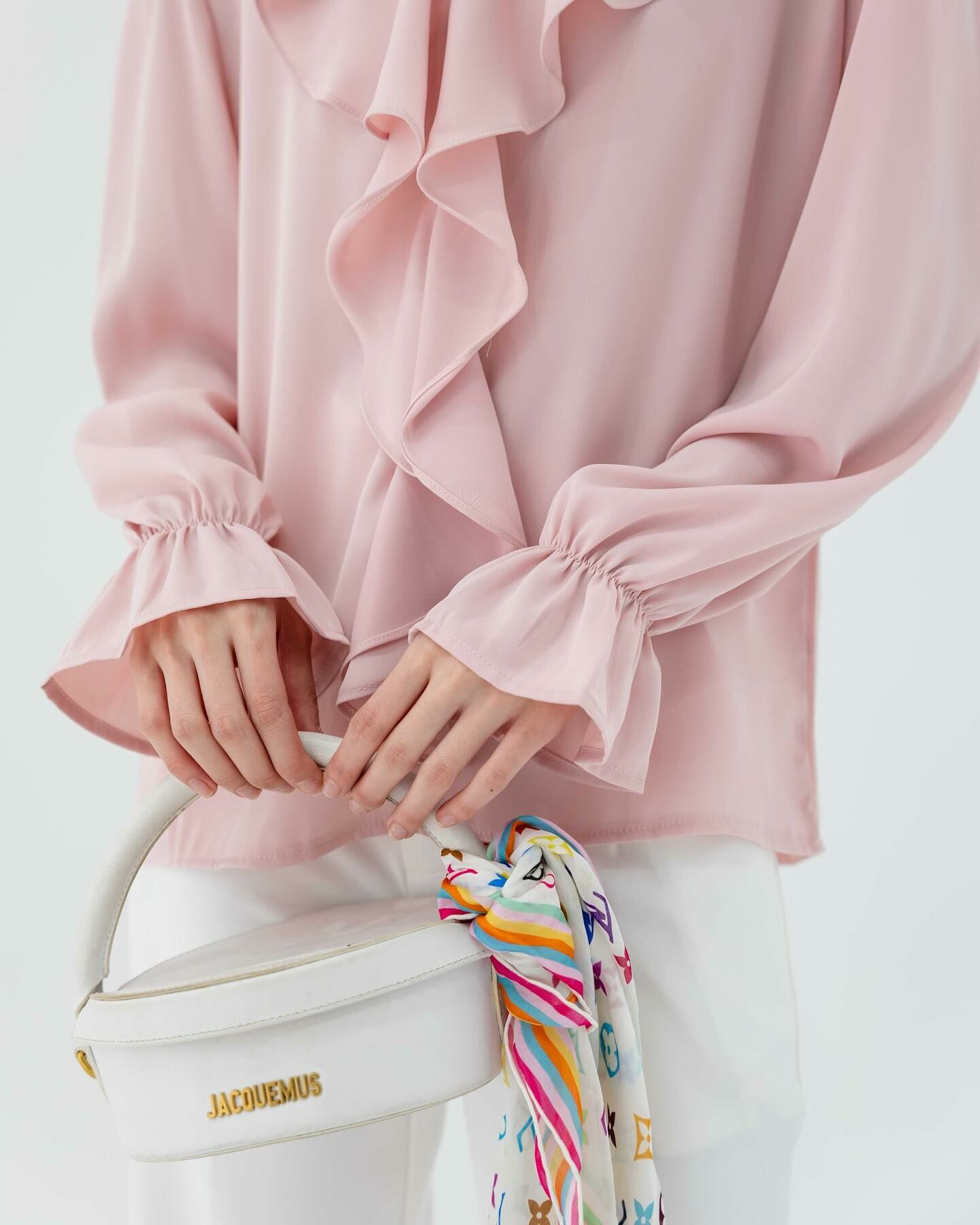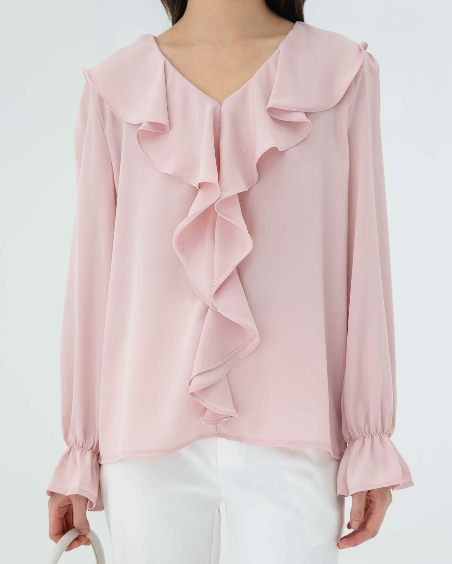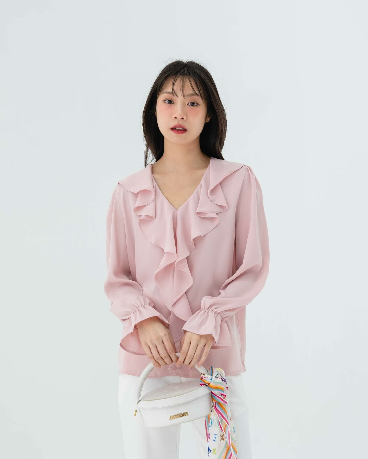 長袖絲緞襯衫,非常舒適涼爽,前面有荷葉邊下擺,配有胸針和玫瑰繩,可繫在脖子上