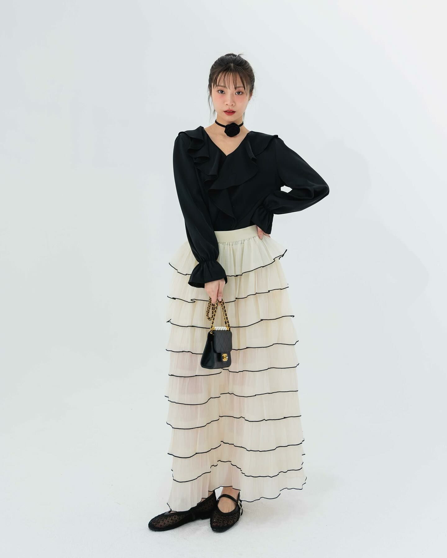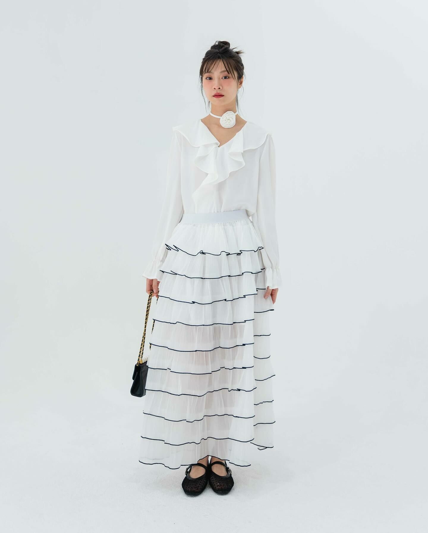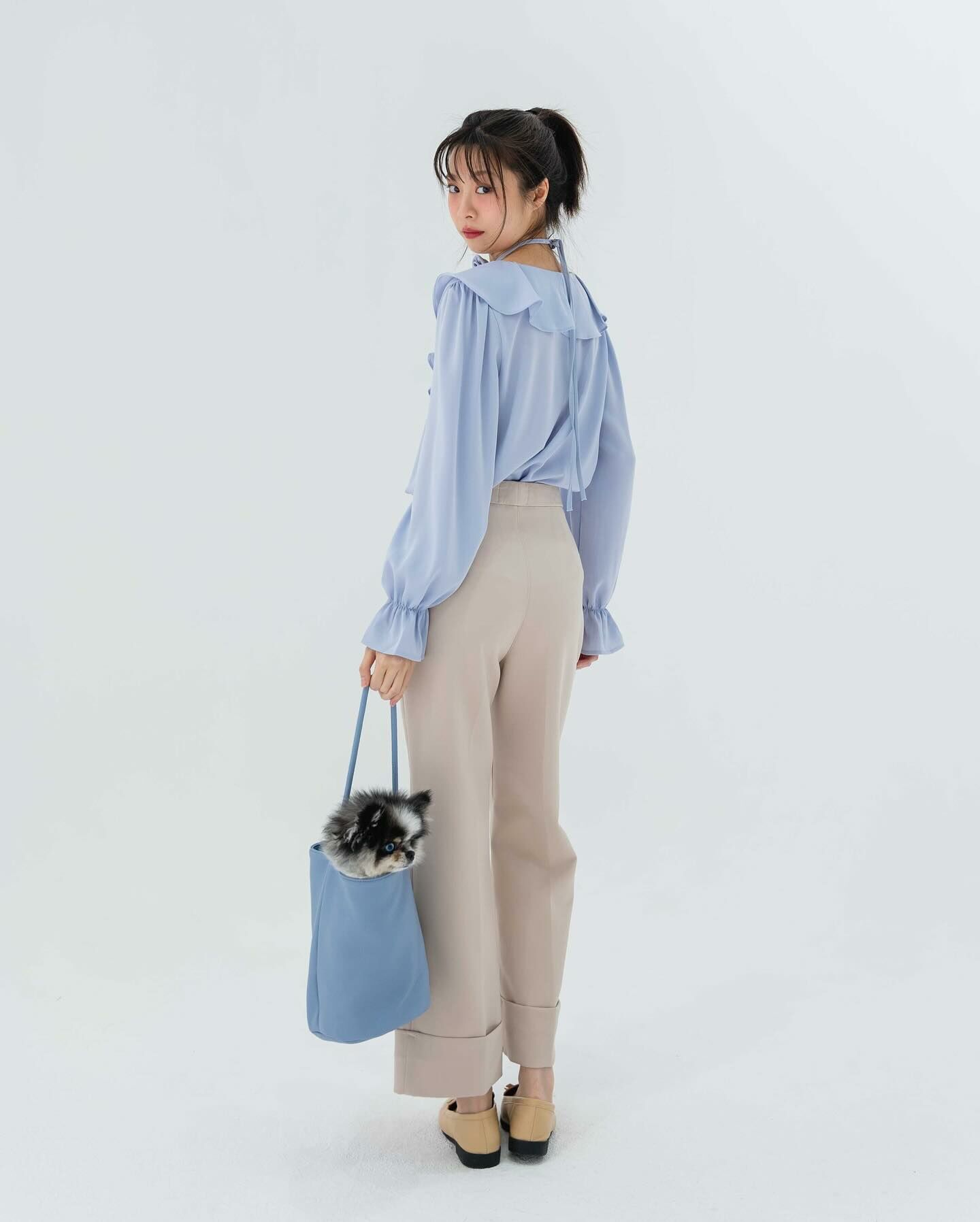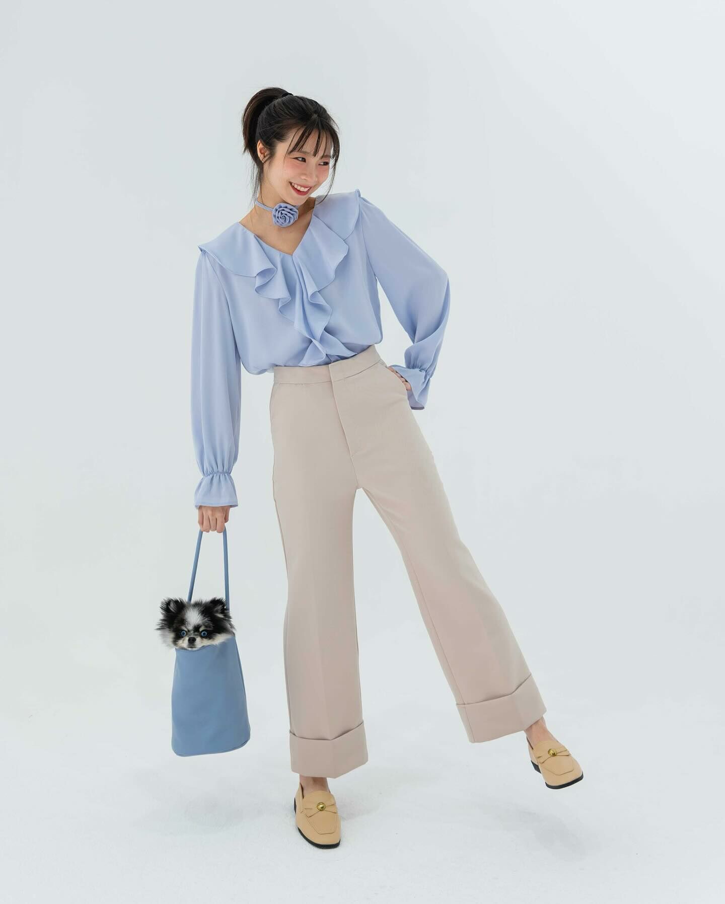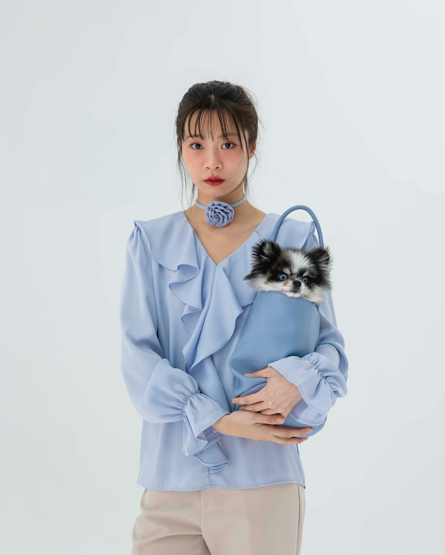 長袖絲緞襯衫,非常舒適涼爽,前面有荷葉邊下擺,配有胸針和玫瑰繩,可繫在脖子上