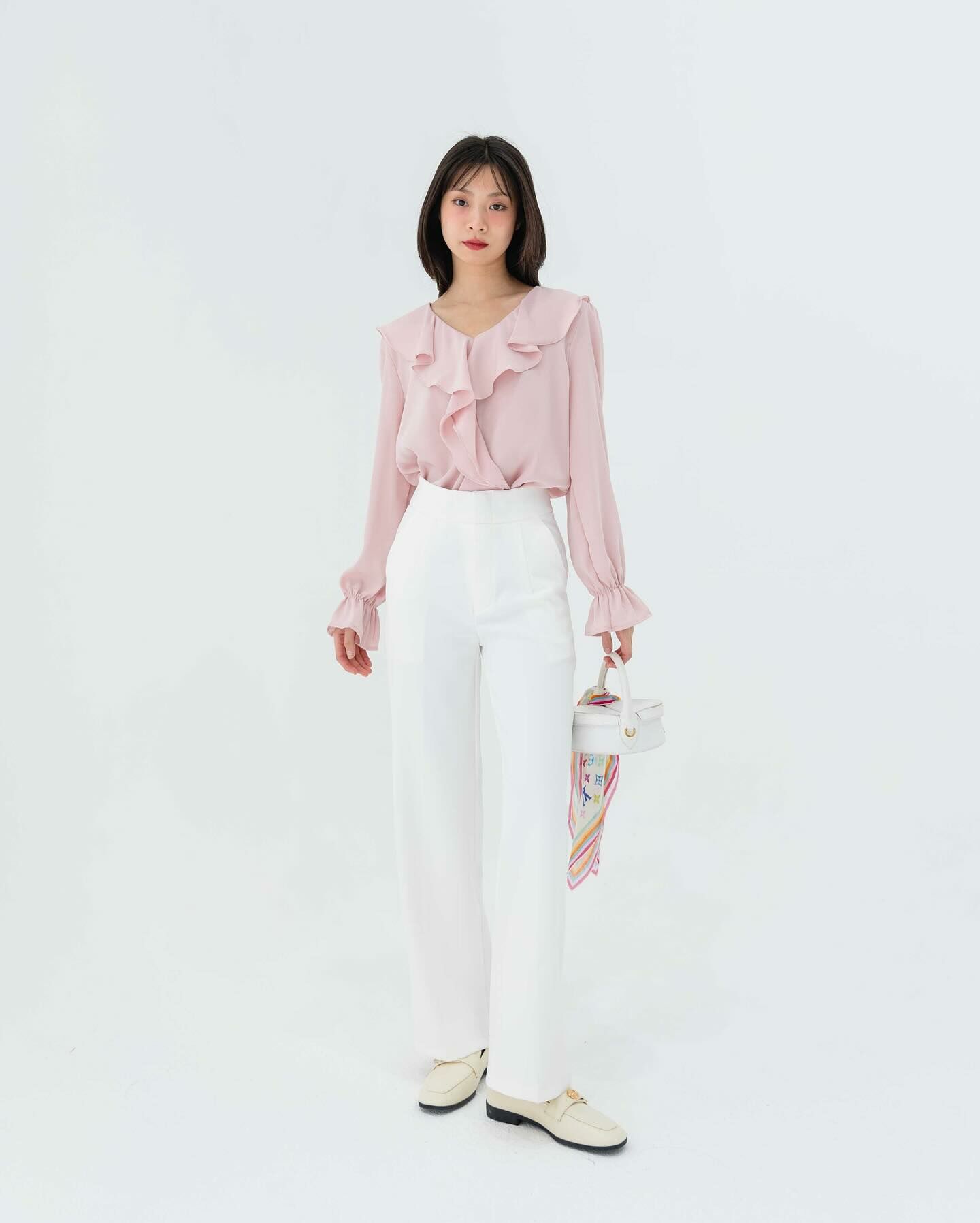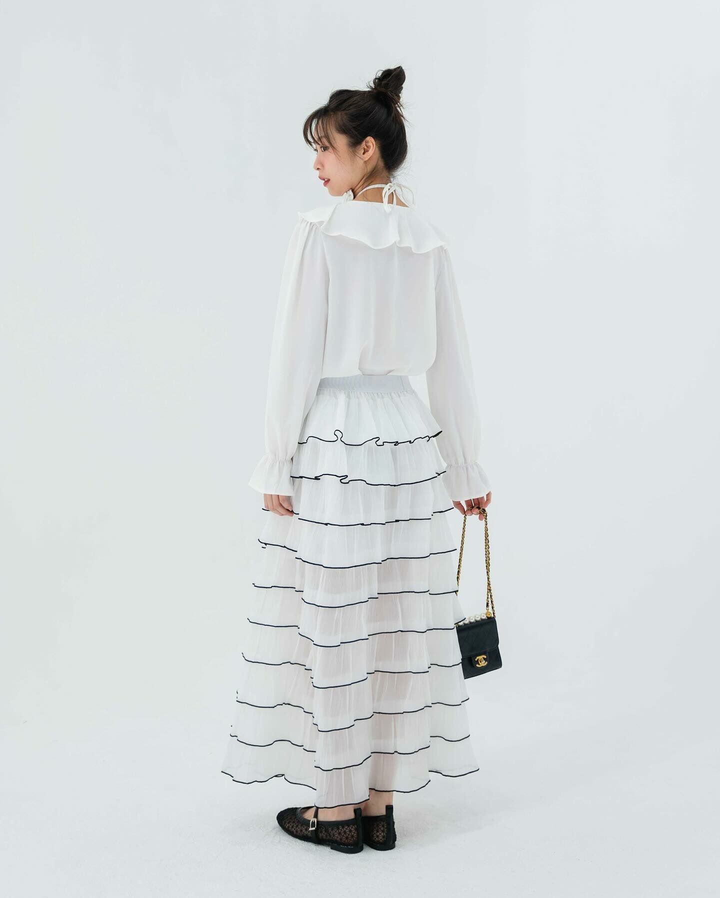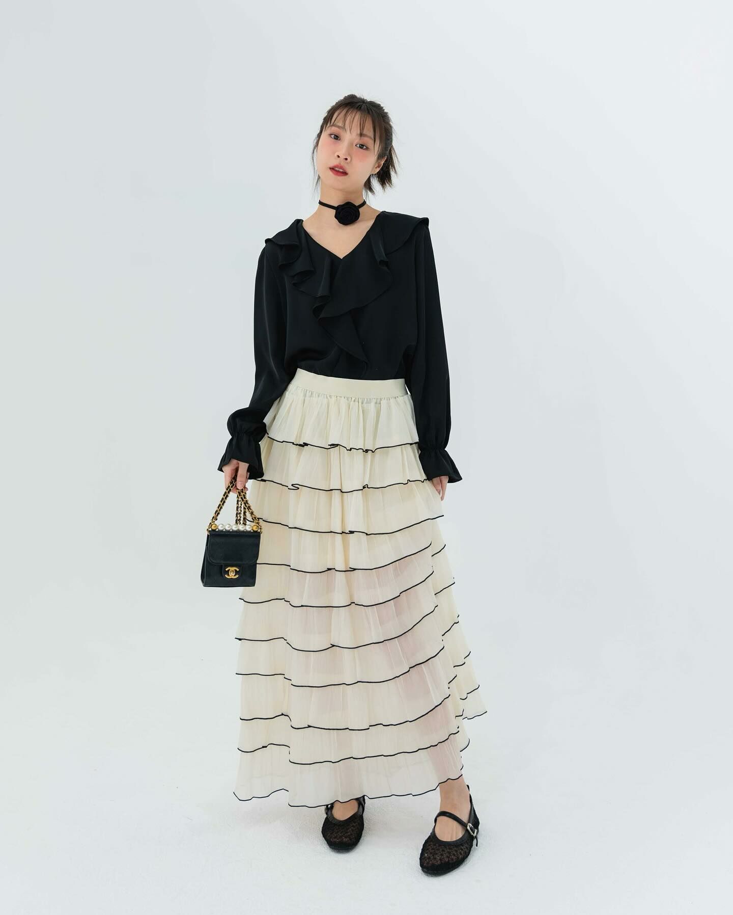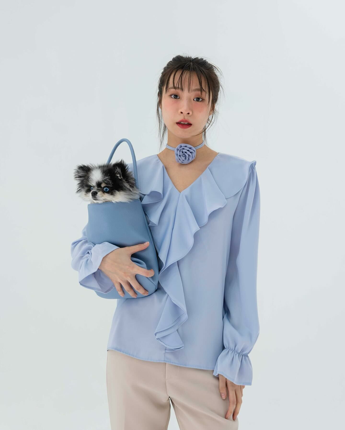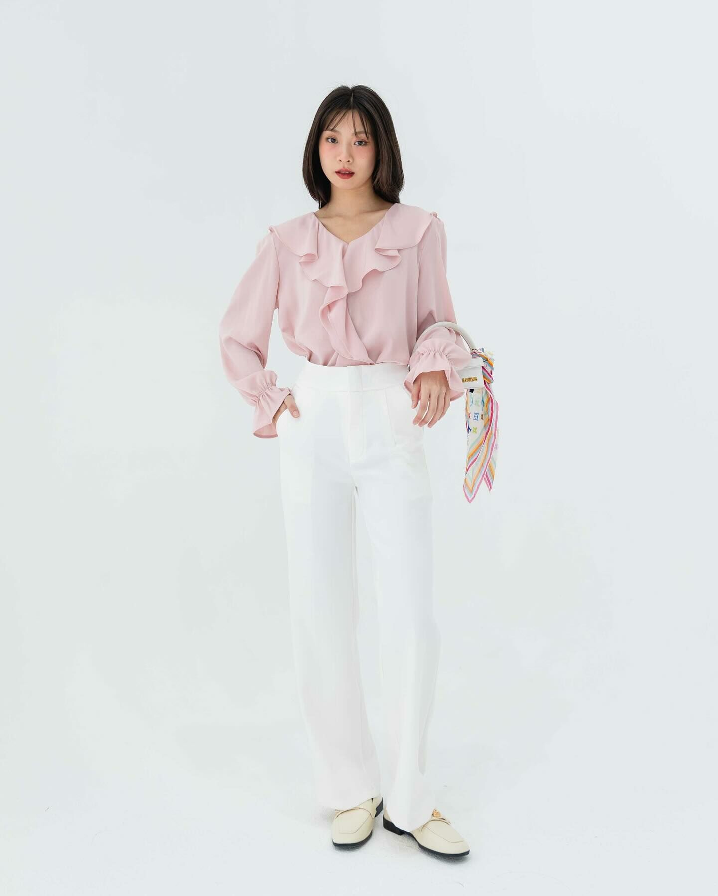 長袖絲緞襯衫,非常舒適涼爽,前面有荷葉邊下擺,配有胸針和玫瑰繩,可繫在脖子上