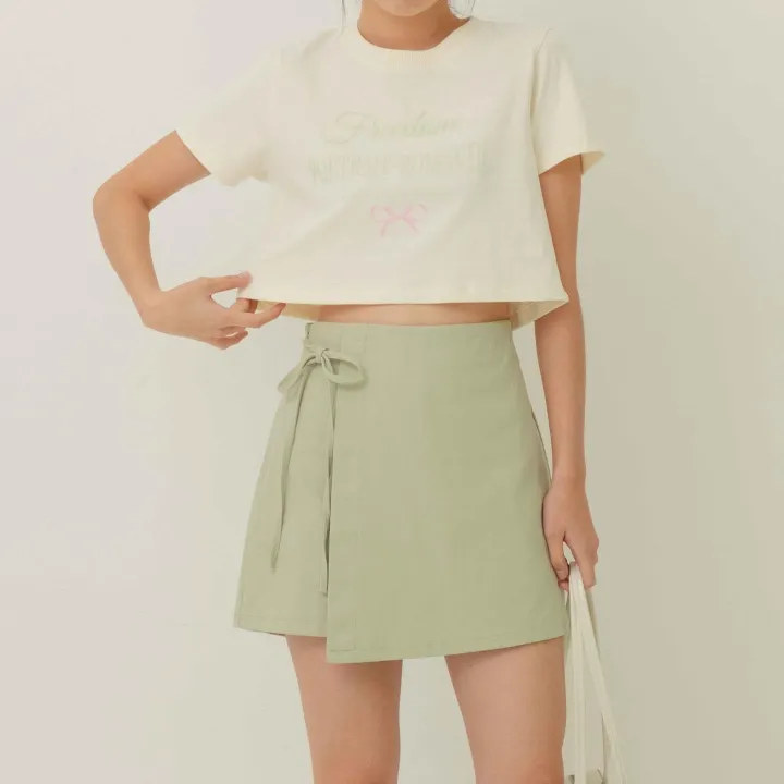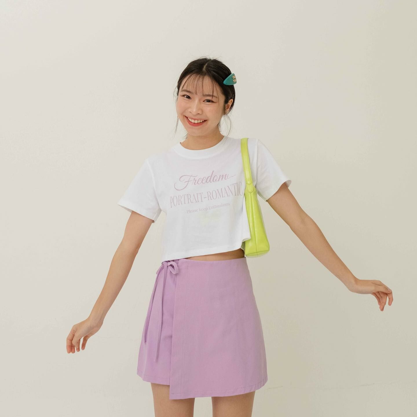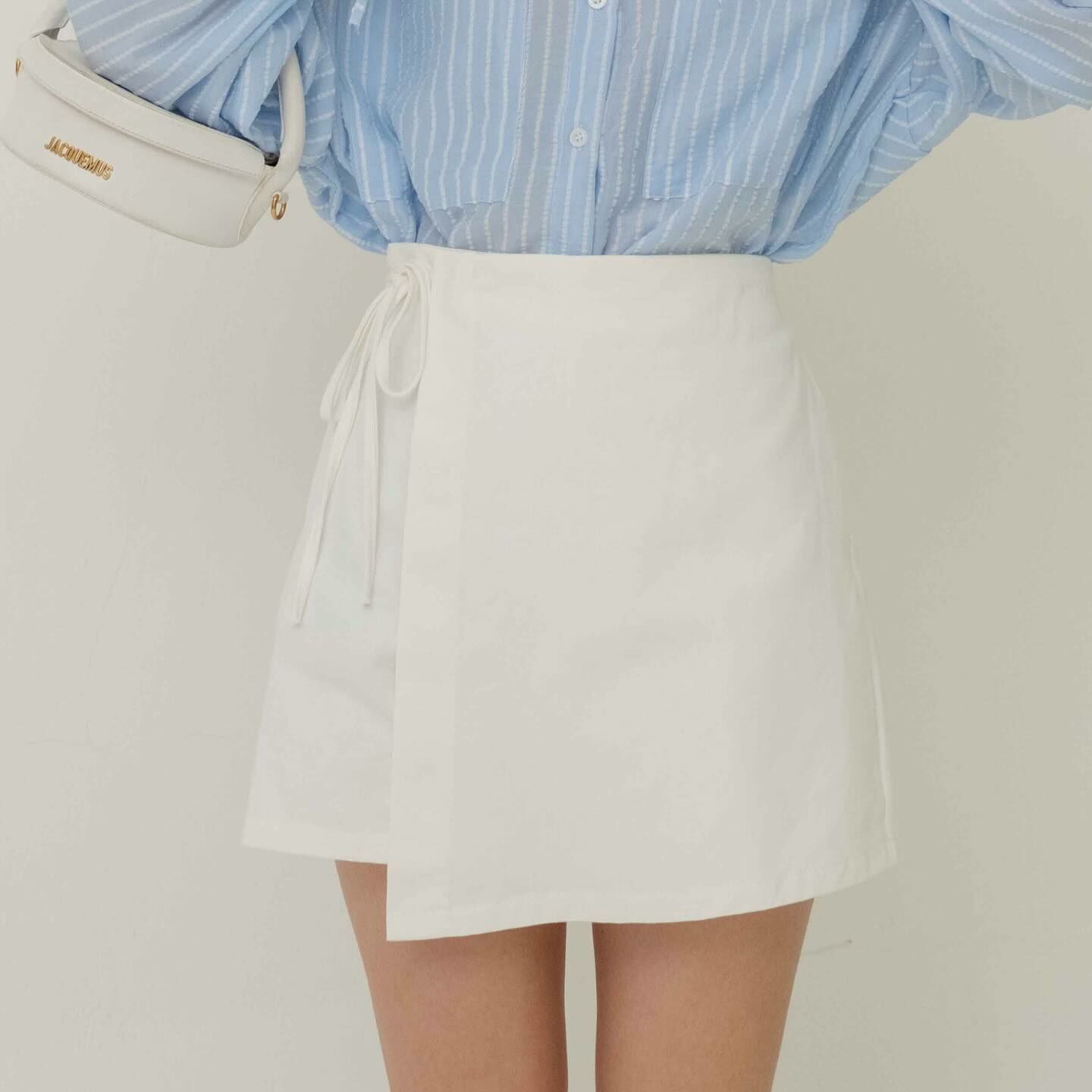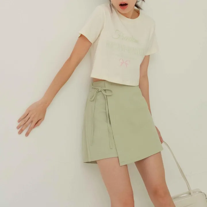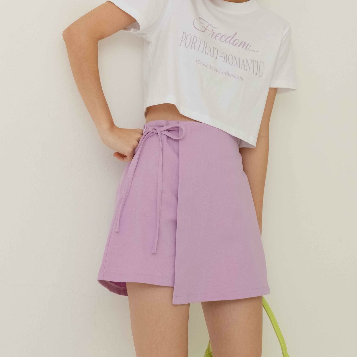 裙褲款,西點布料,繫上蝴蝶結,適合甜美女孩穿著舒適,不用擔心不雅。正面有對角線細節,側面有拉鍊。