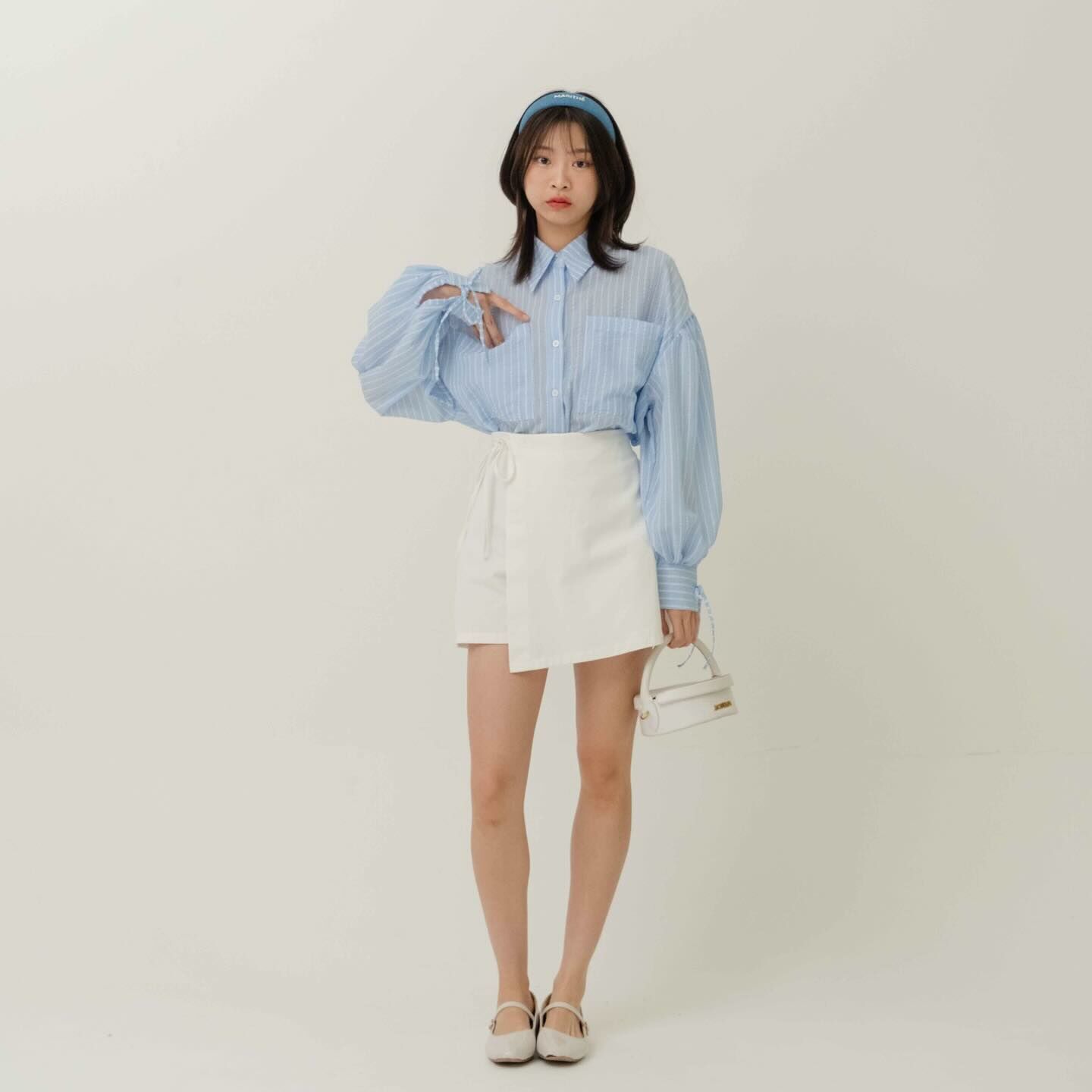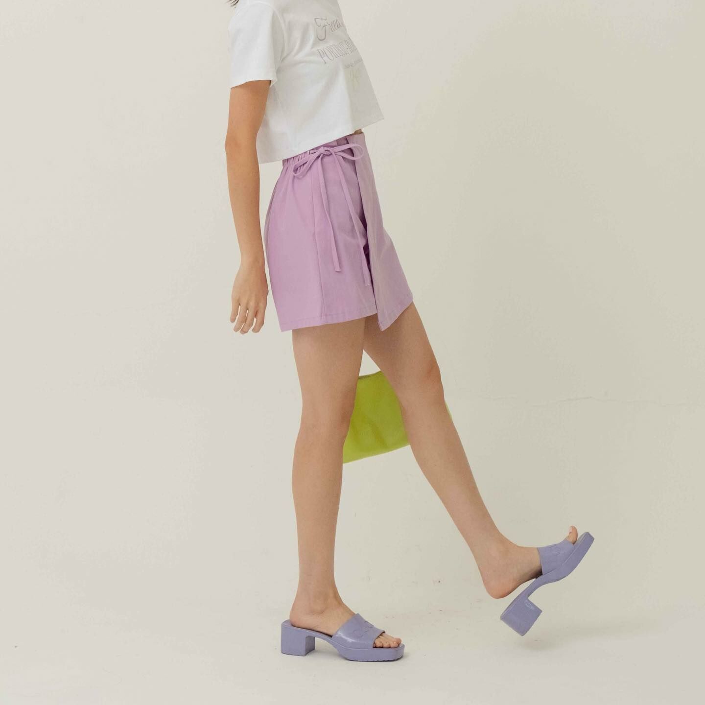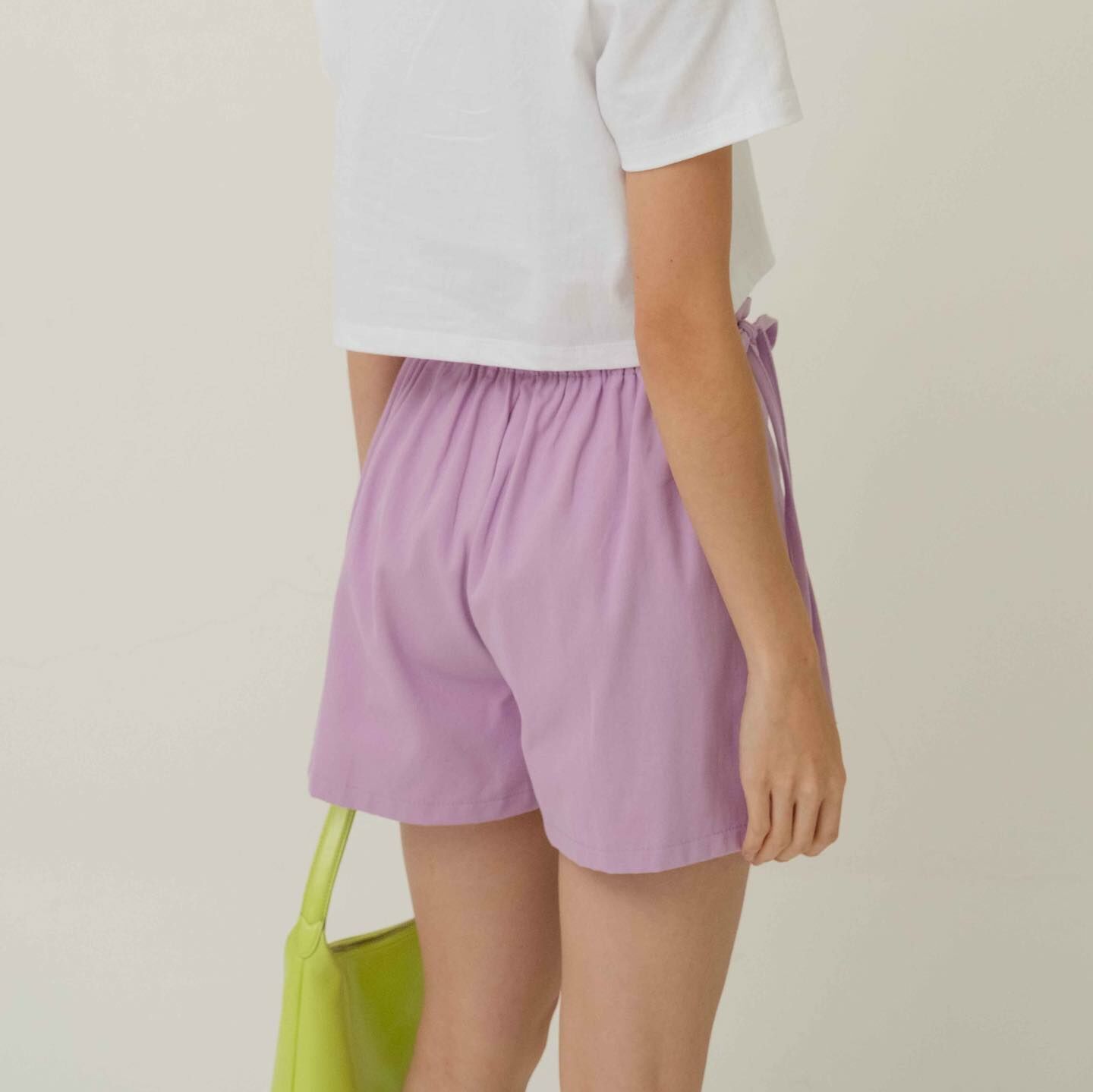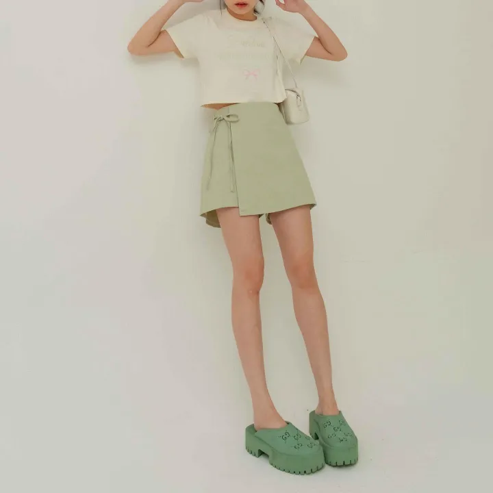 裙褲款,西點布料,繫上蝴蝶結,適合甜美女孩穿著舒適,不用擔心不雅。正面有對角線細節,側面有拉鍊。
