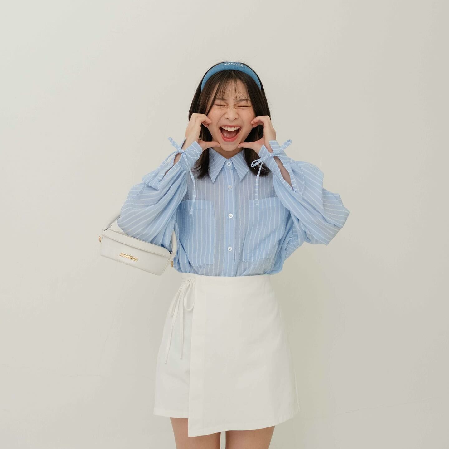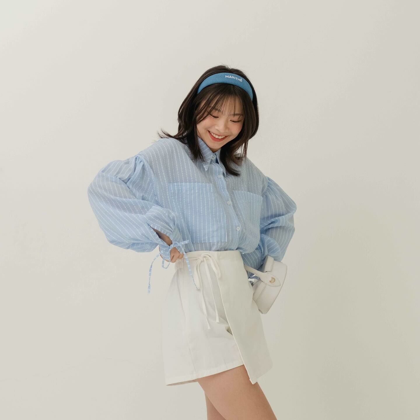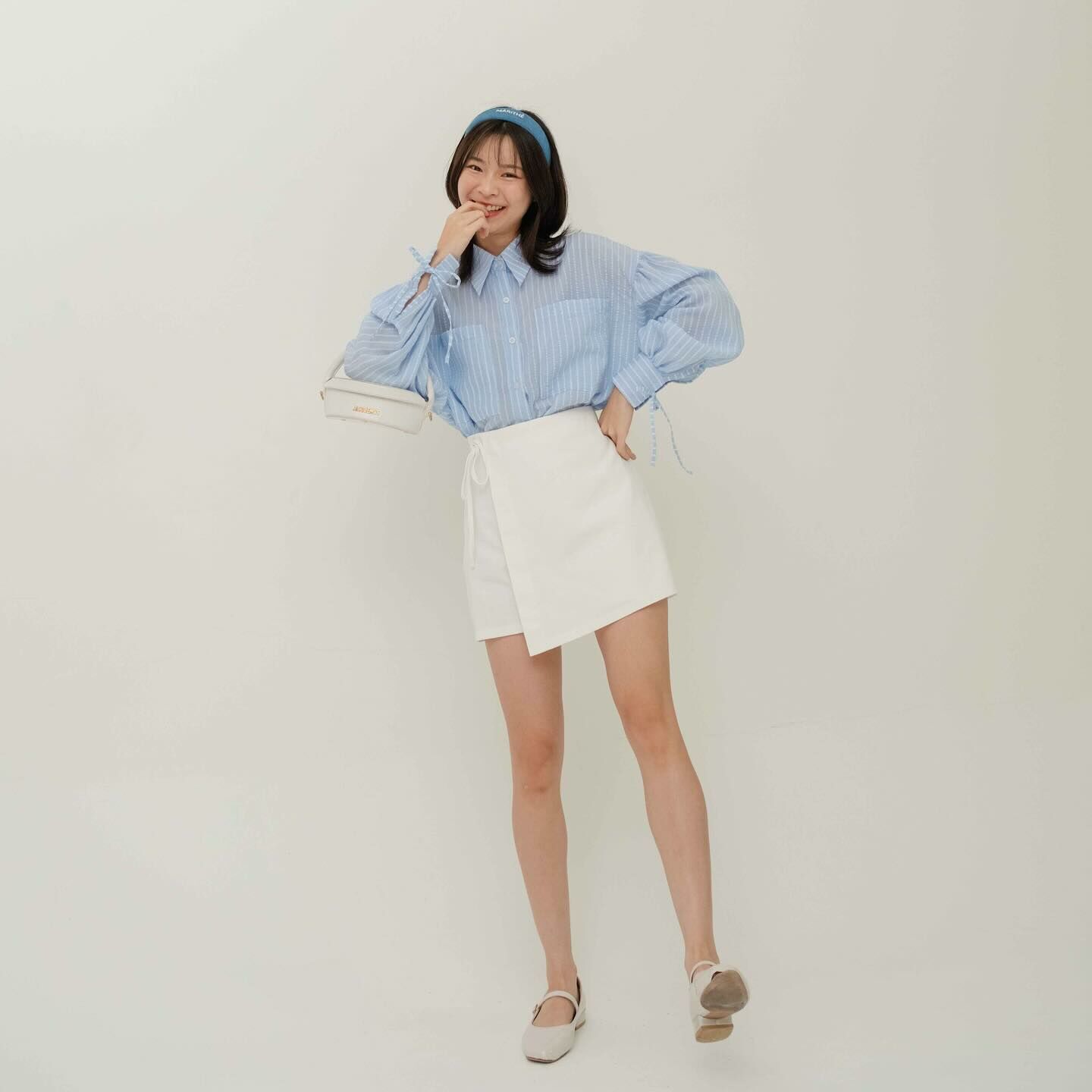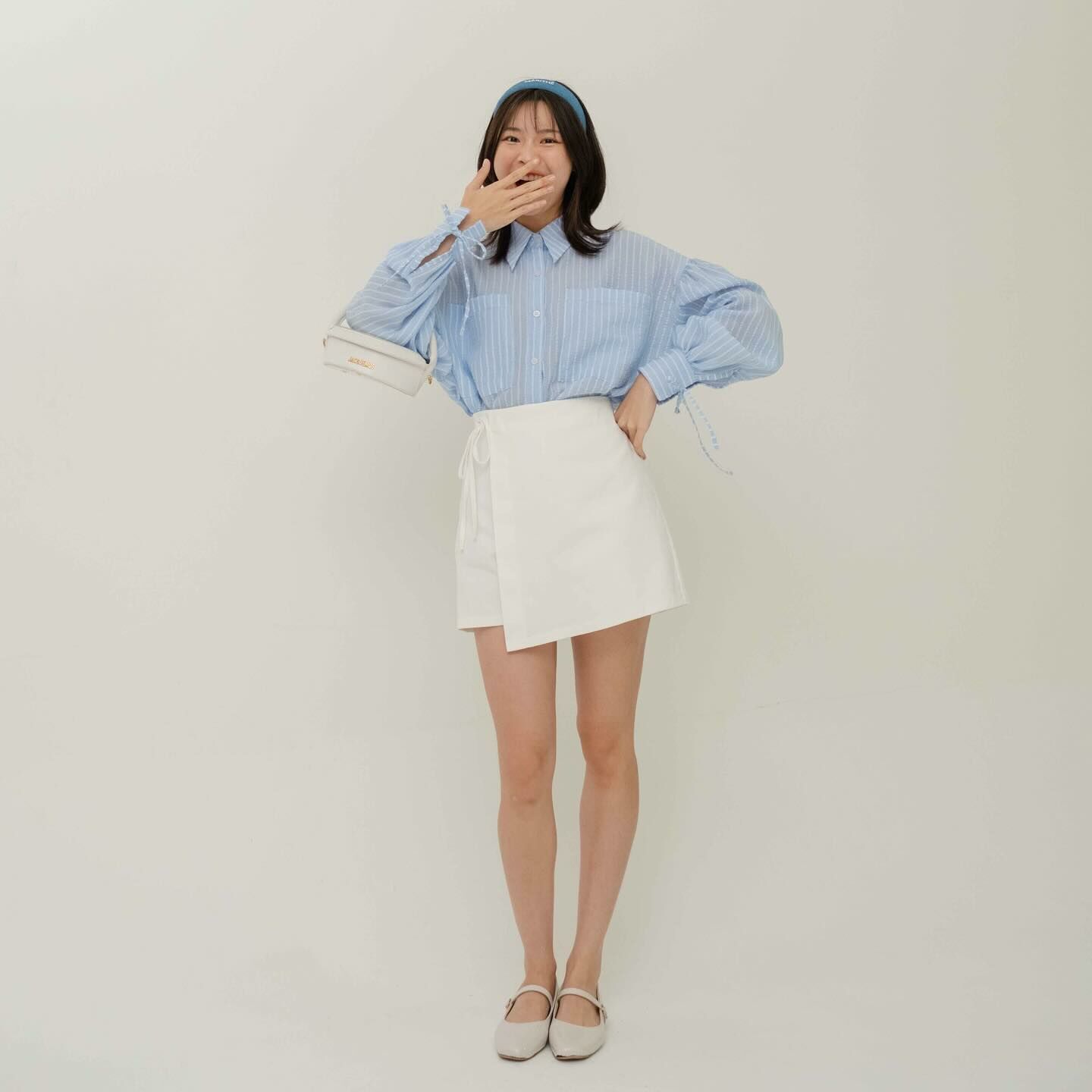 裙褲款,西點布料,繫上蝴蝶結,適合甜美女孩穿著舒適,不用擔心不雅。正面有對角線細節,側面有拉鍊。