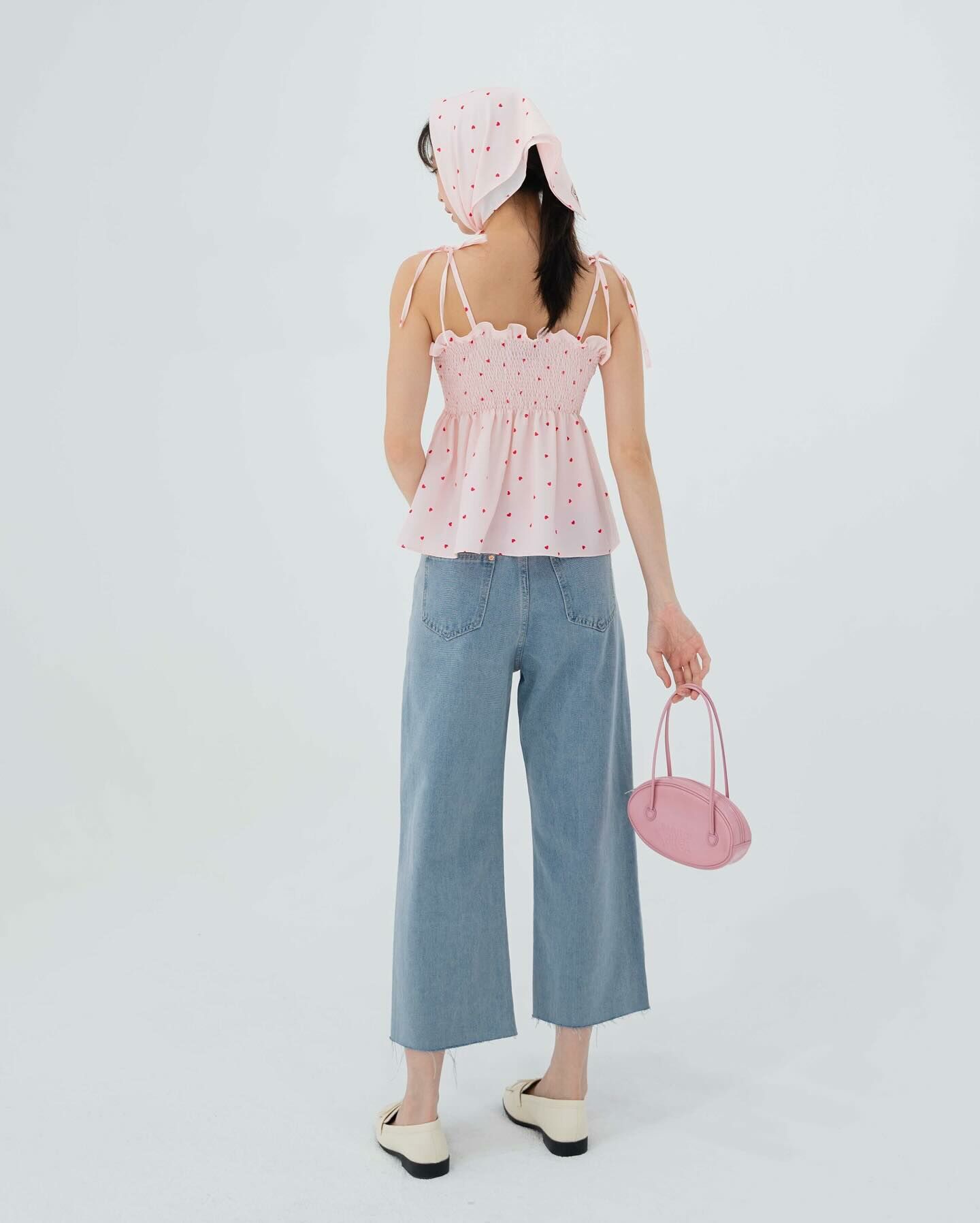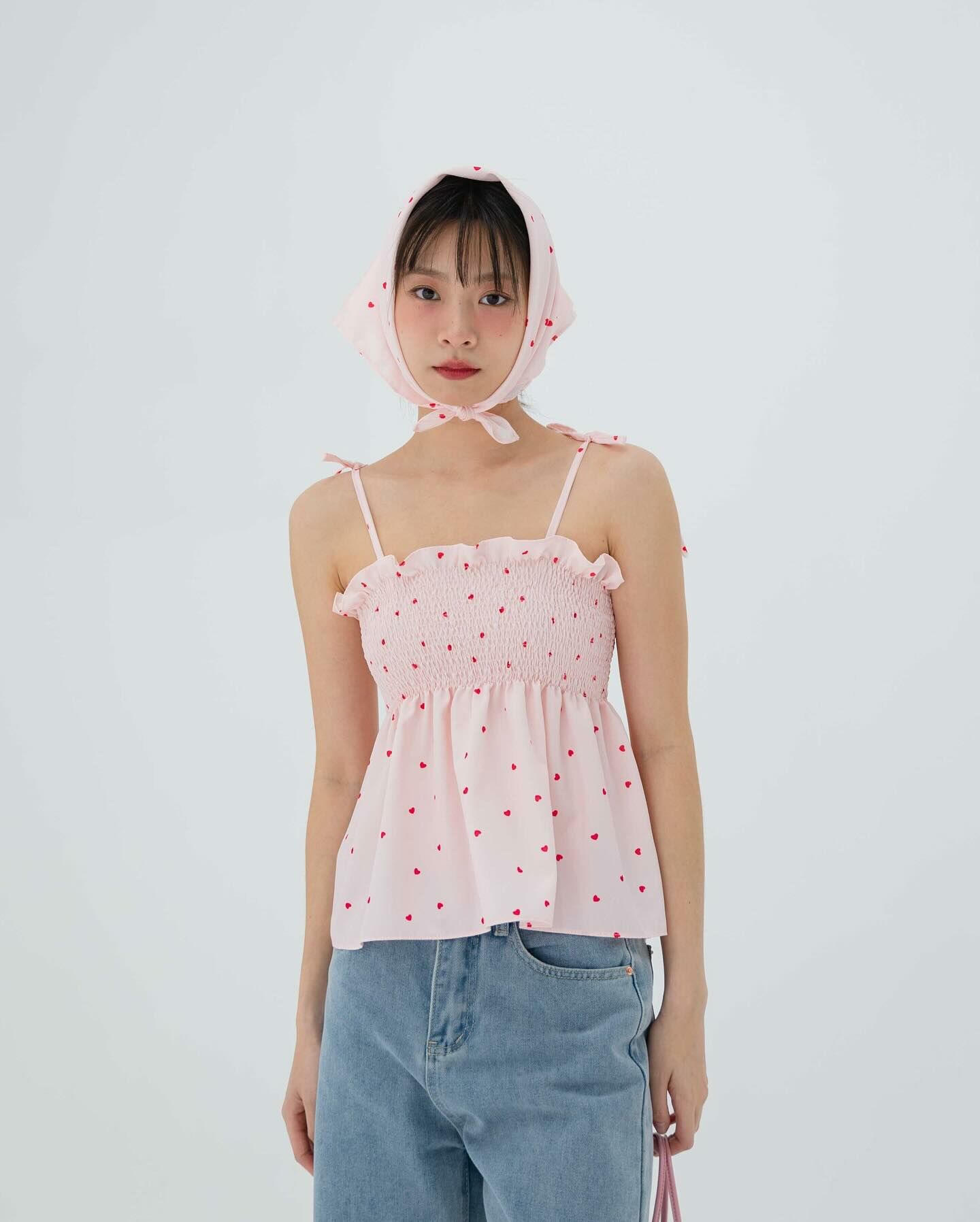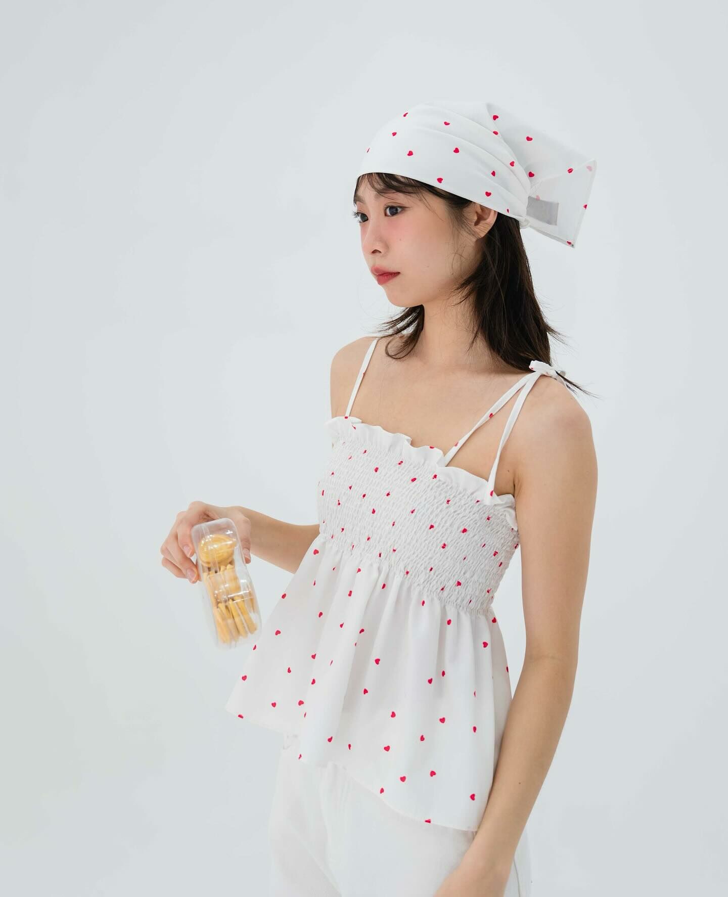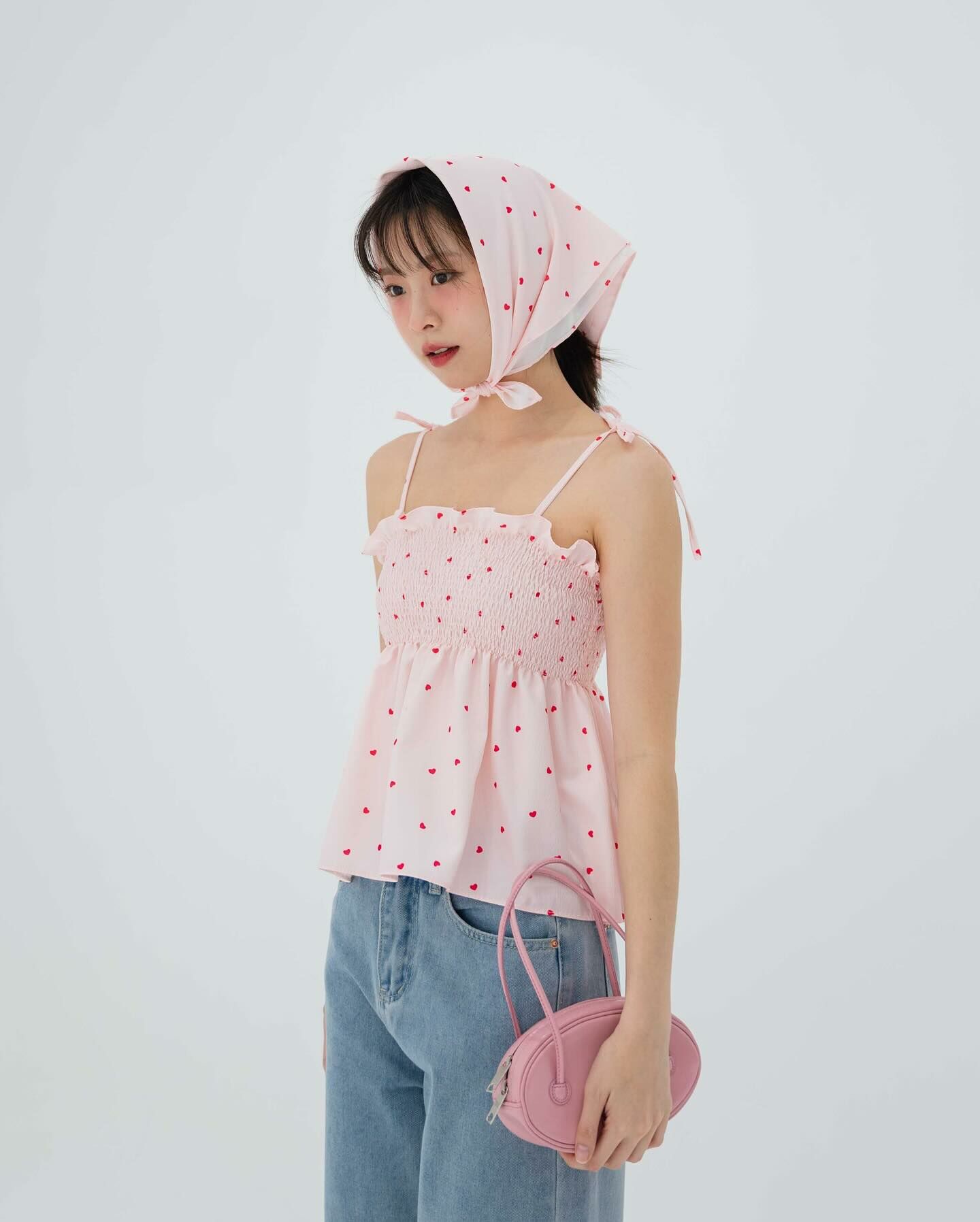 細肩帶上衣,手拿包布料,心形圖案,領結,褶飾胸部,超可愛