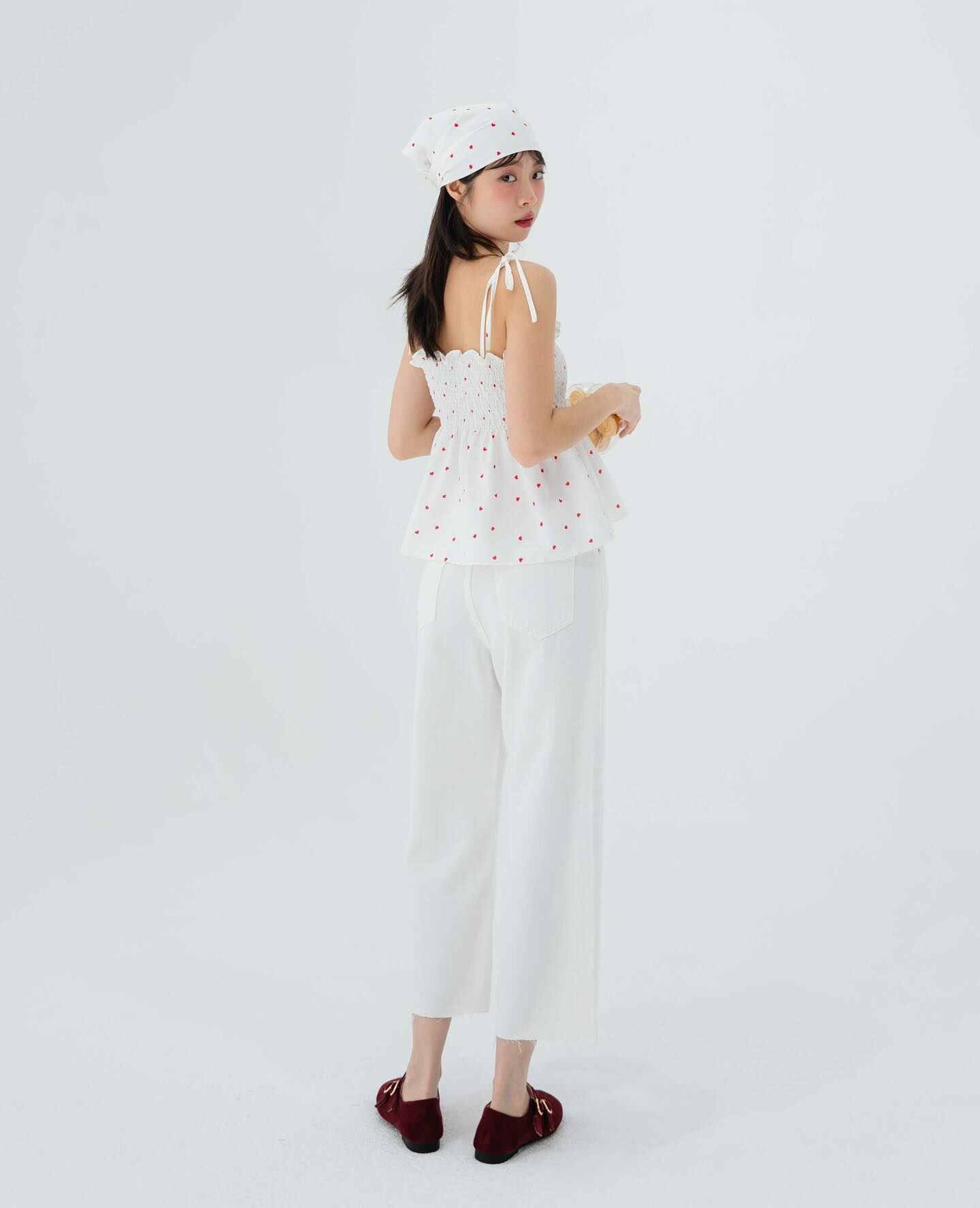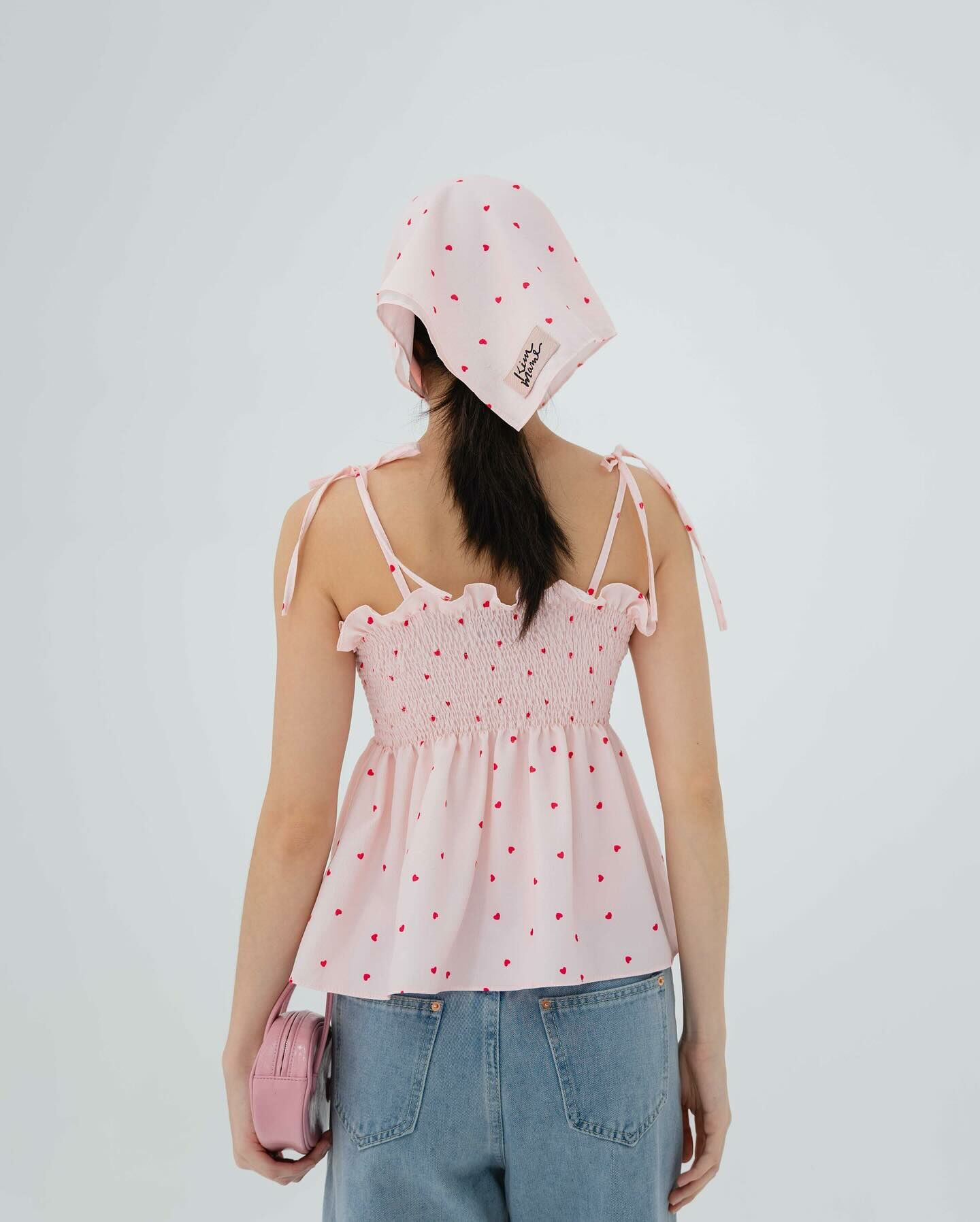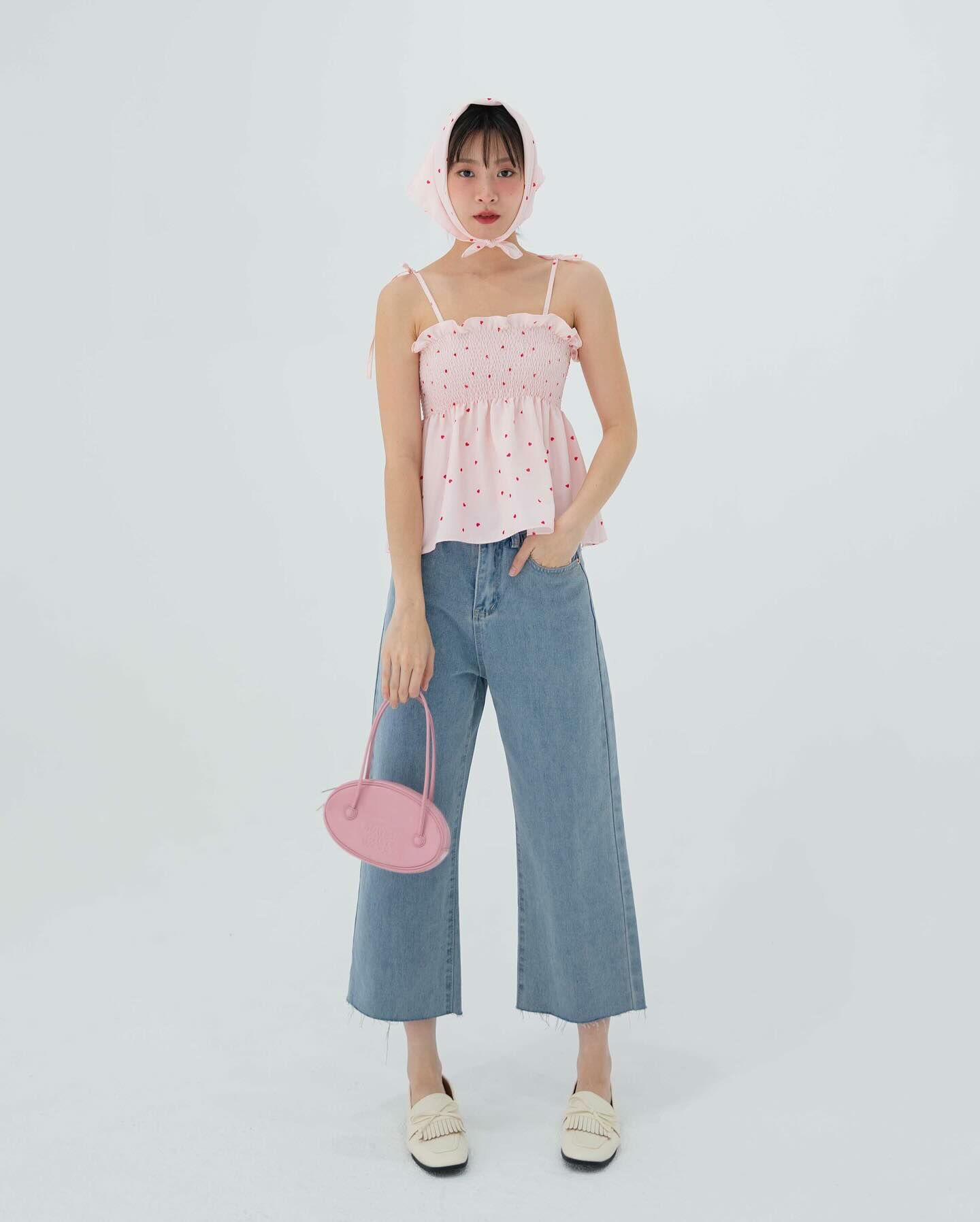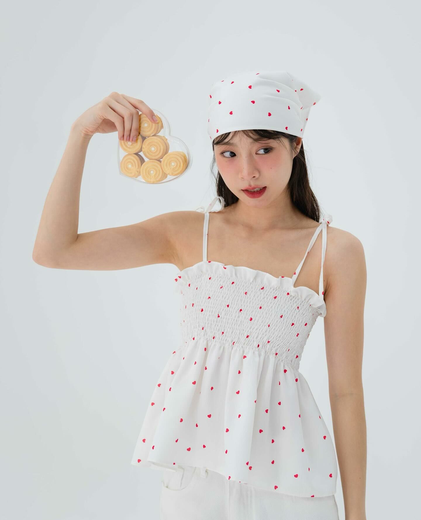 細肩帶上衣,手拿包布料,心形圖案,領結,褶飾胸部,超可愛