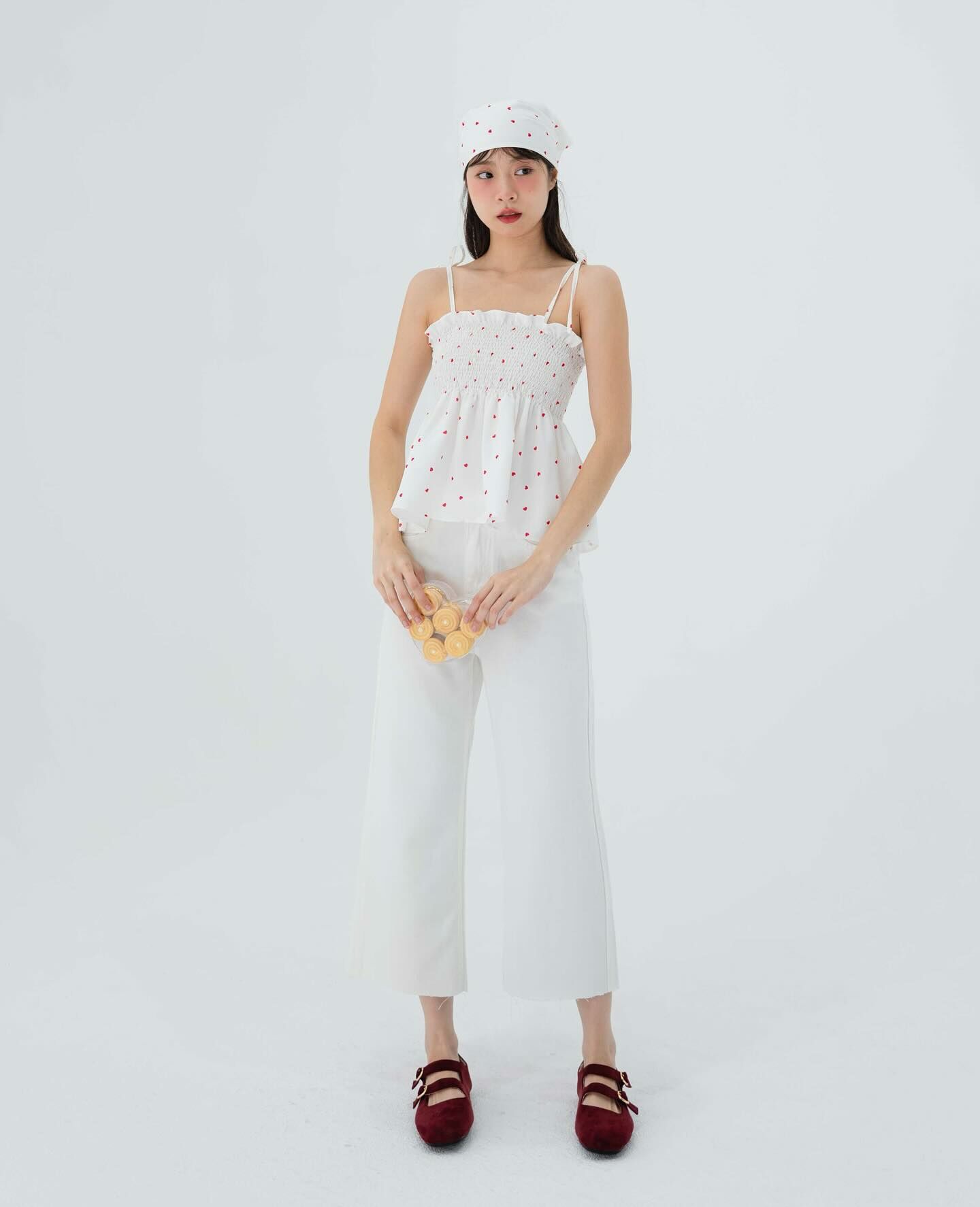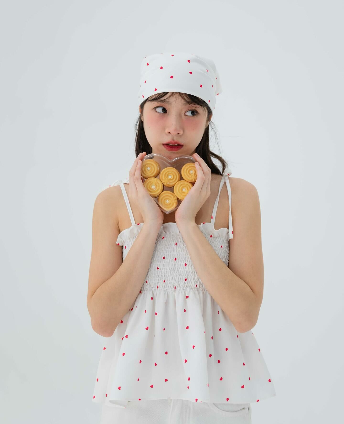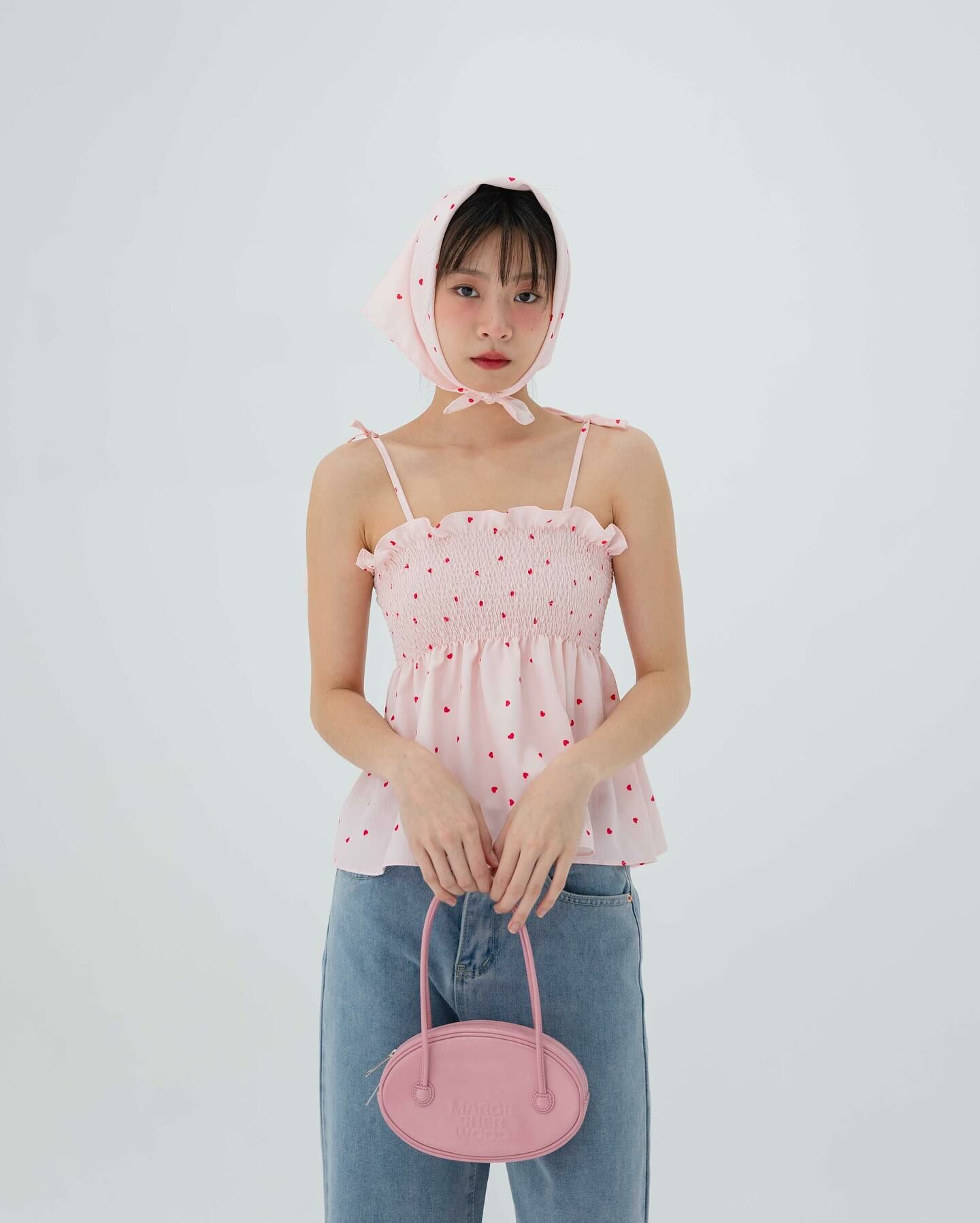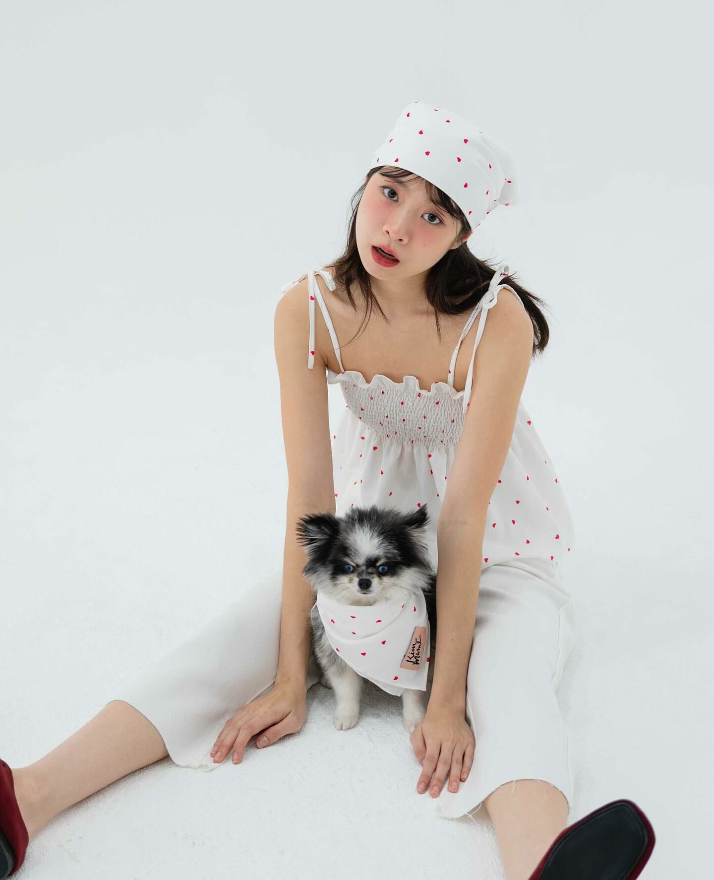 細肩帶上衣,手拿包布料,心形圖案,領結,褶飾胸部,超可愛