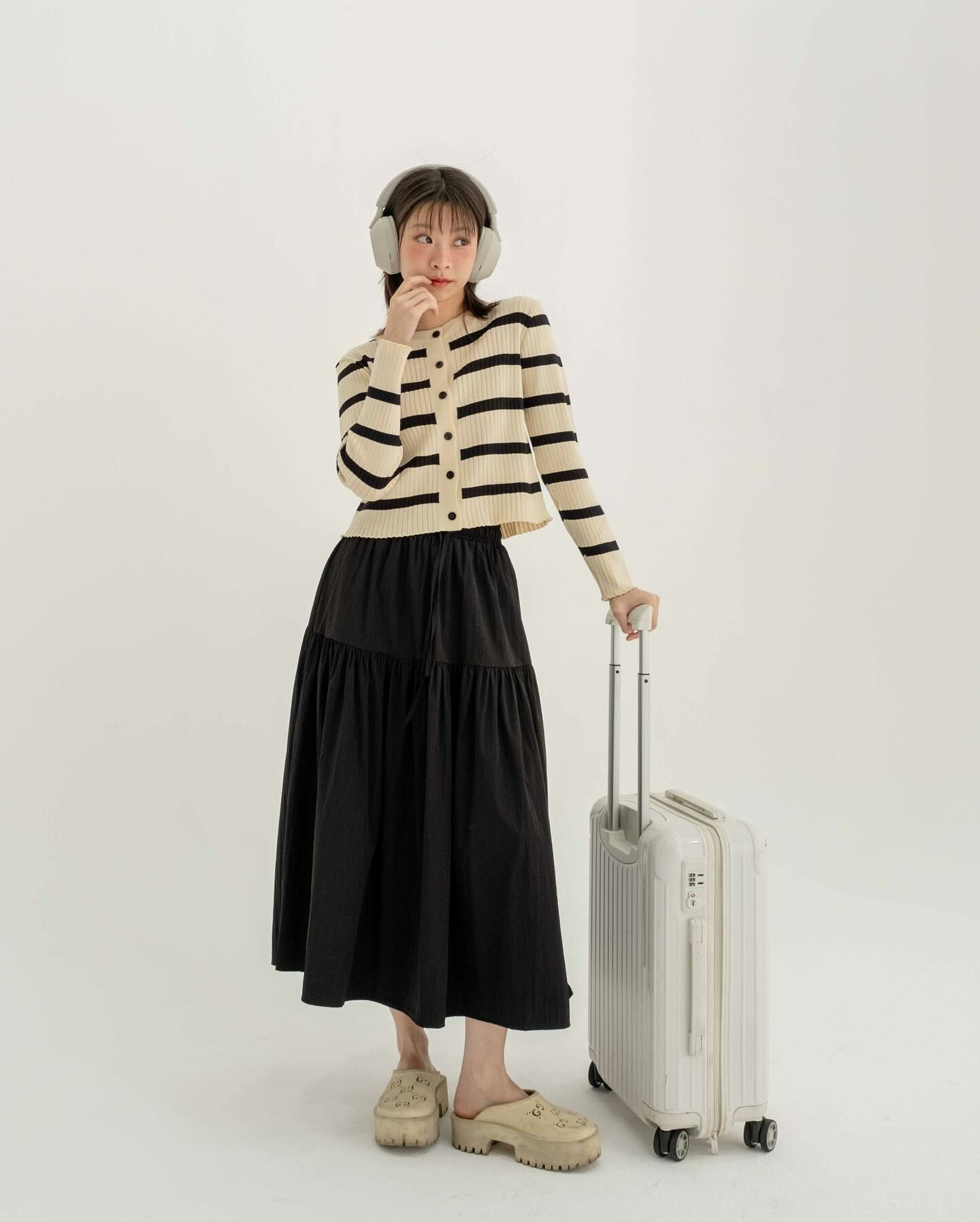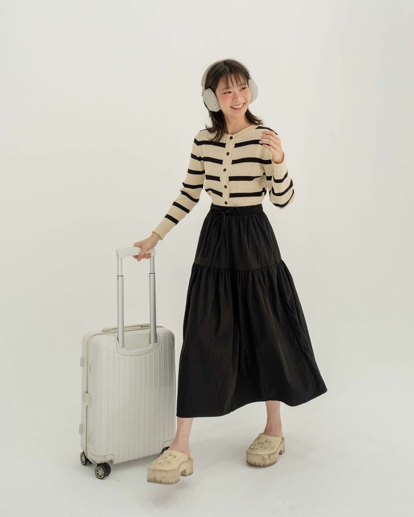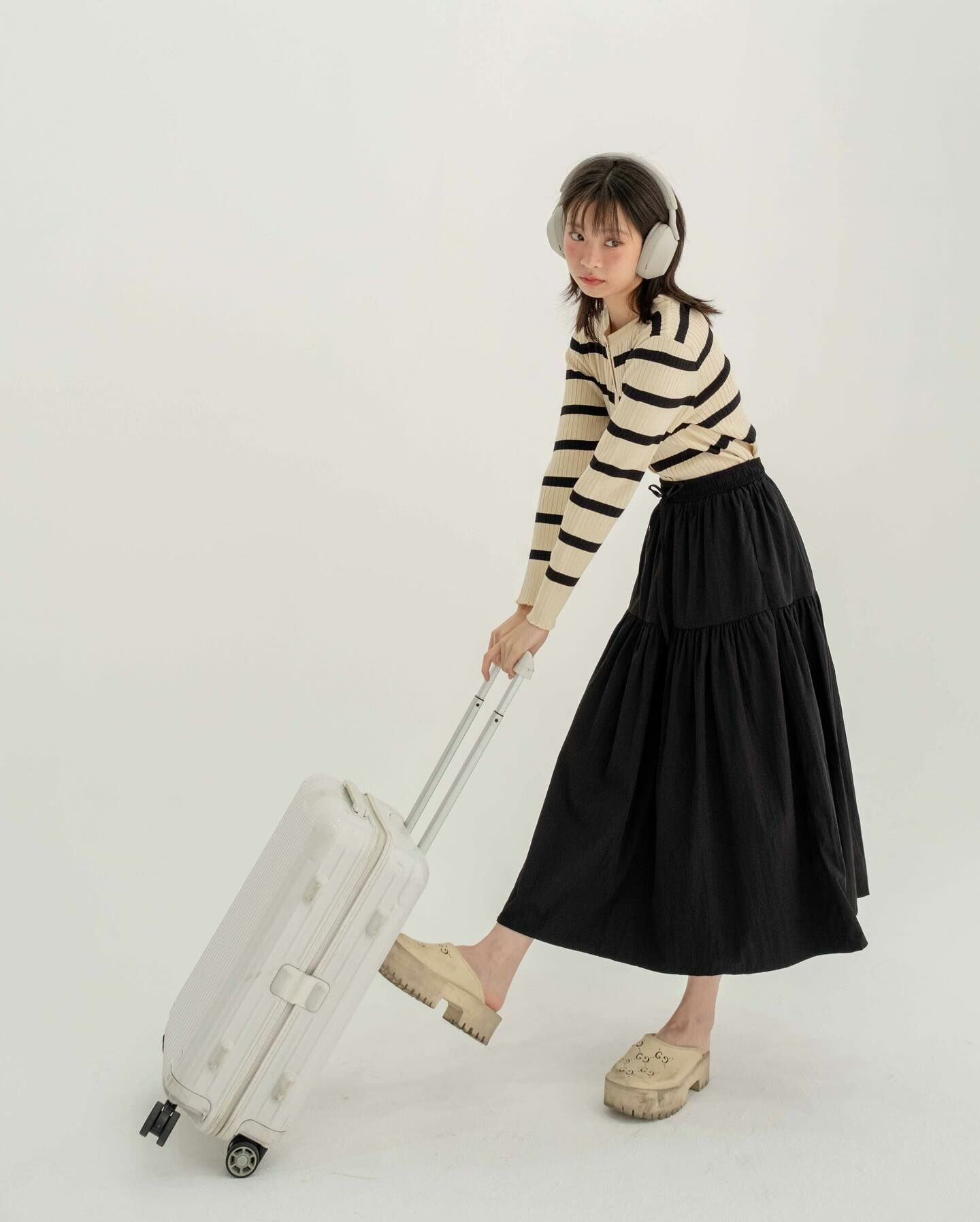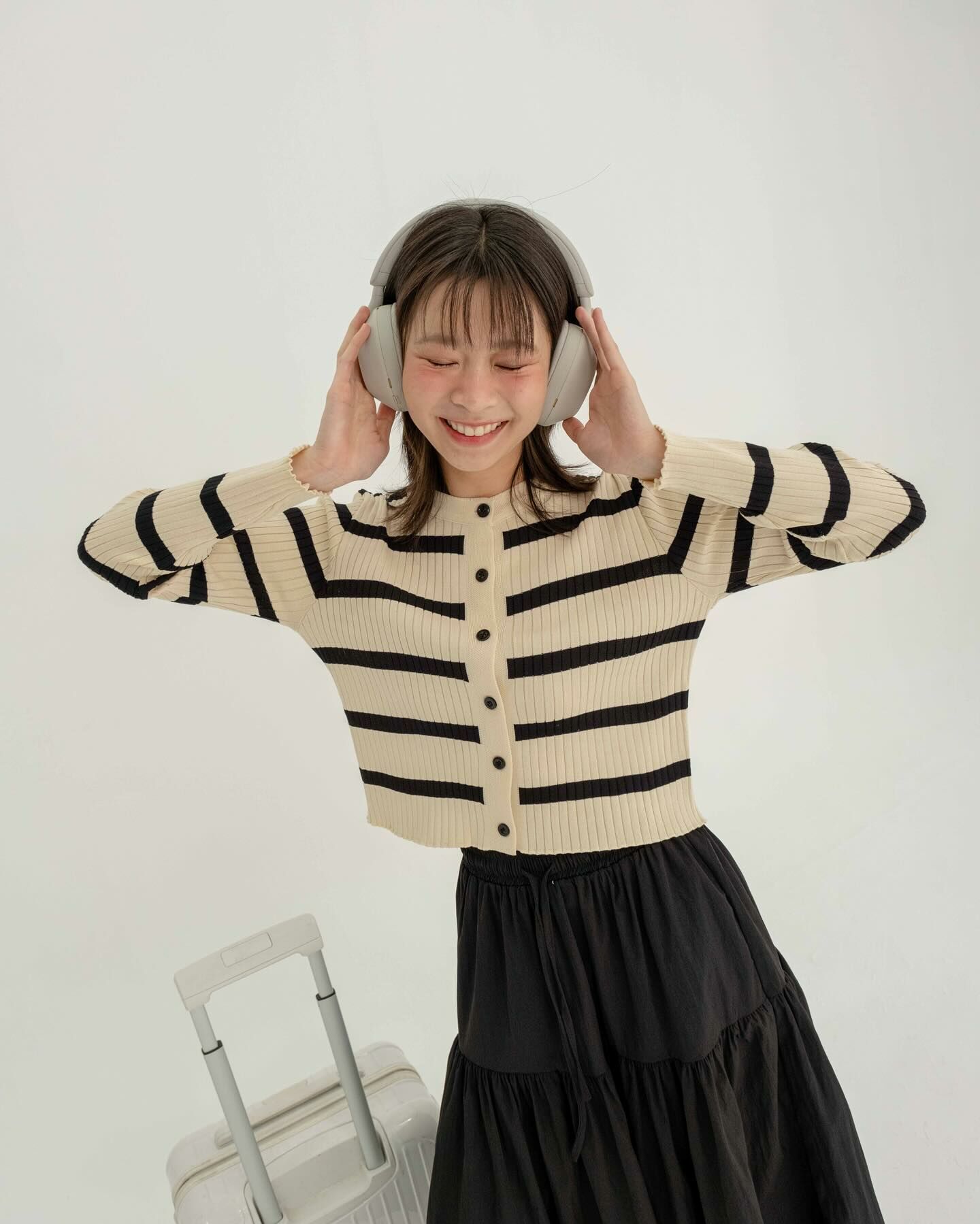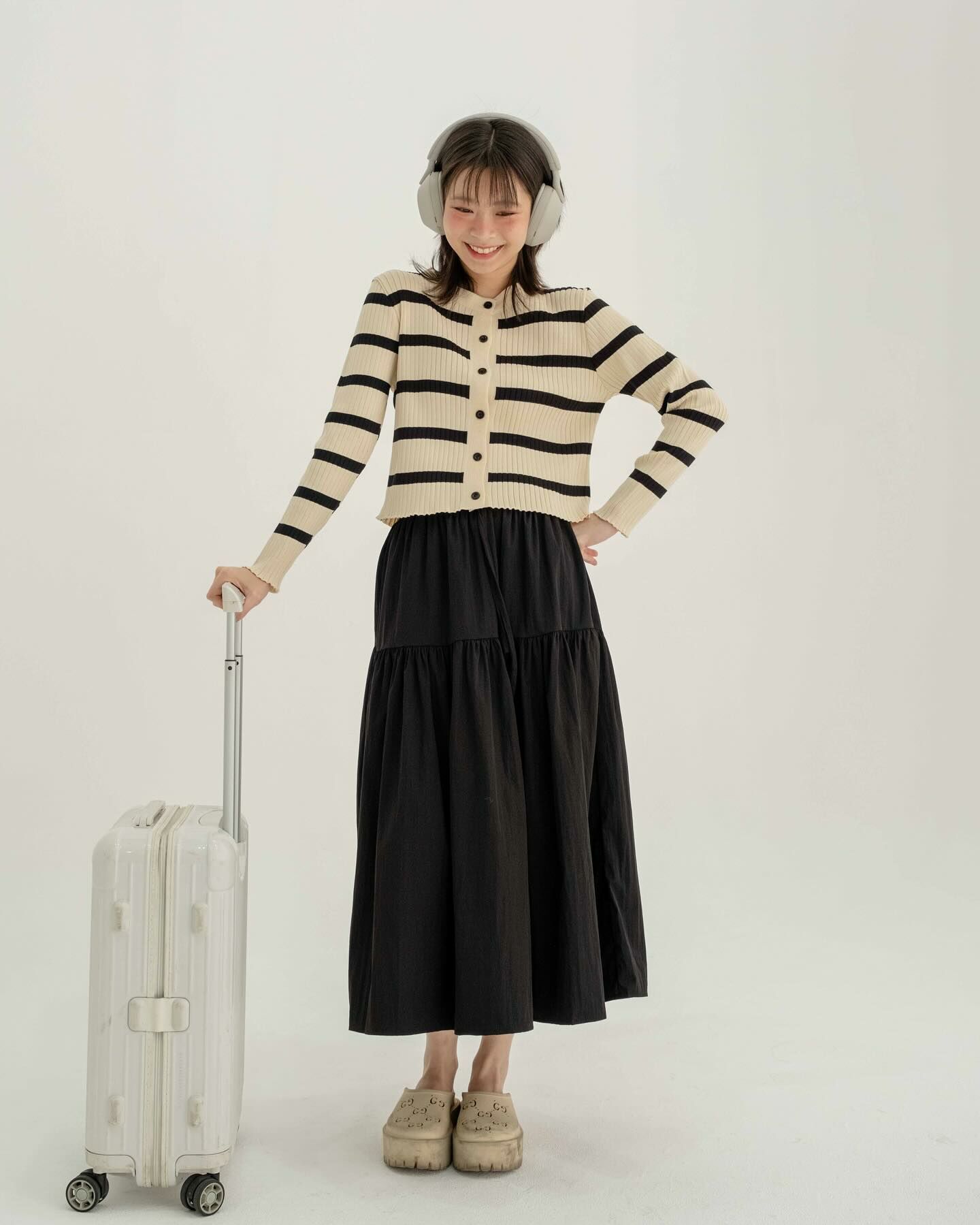 長袖厚針織面料長袖襯衫將它作為日常/機場造型穿著,以抵禦寒冷。