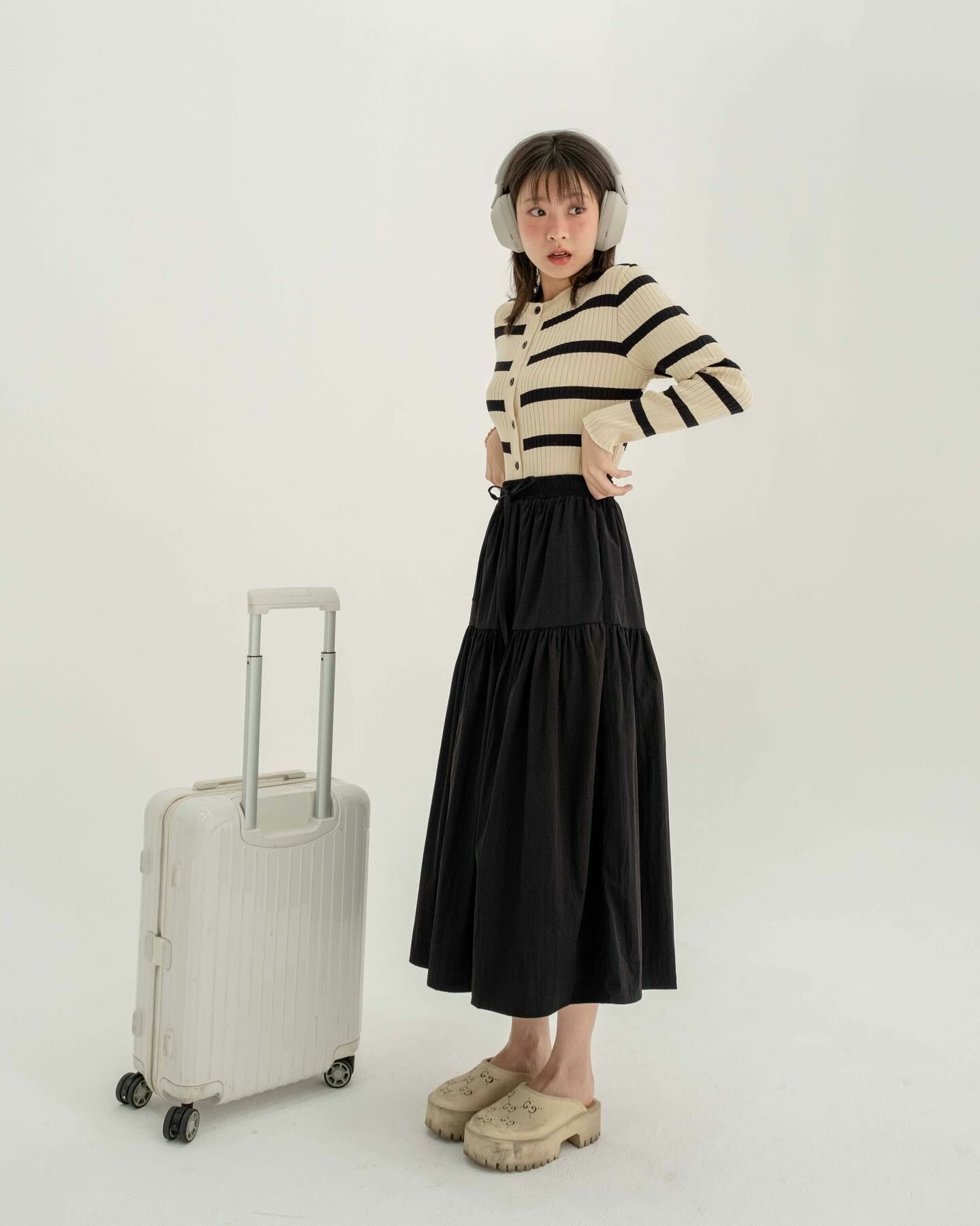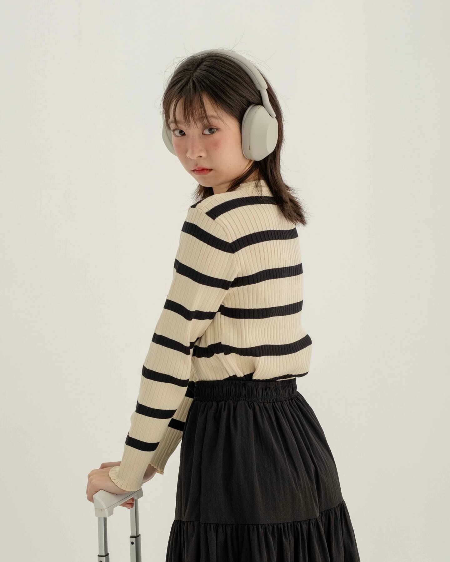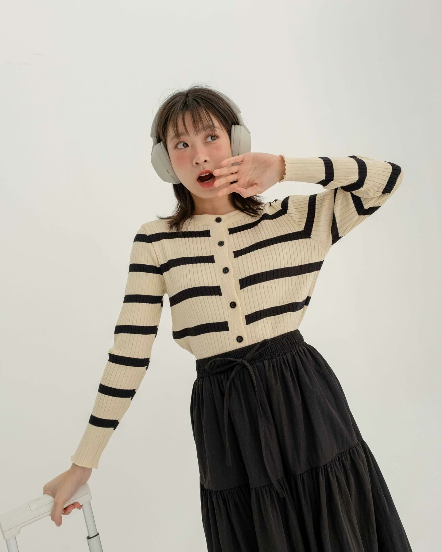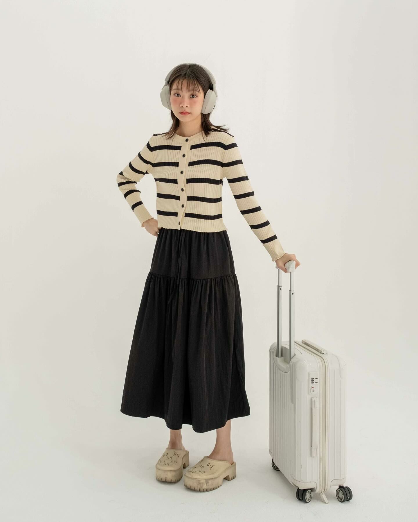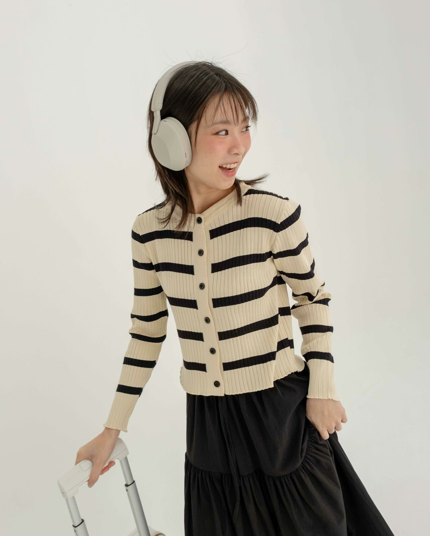 長袖厚針織面料長袖襯衫將它作為日常/機場造型穿著,以抵禦寒冷。