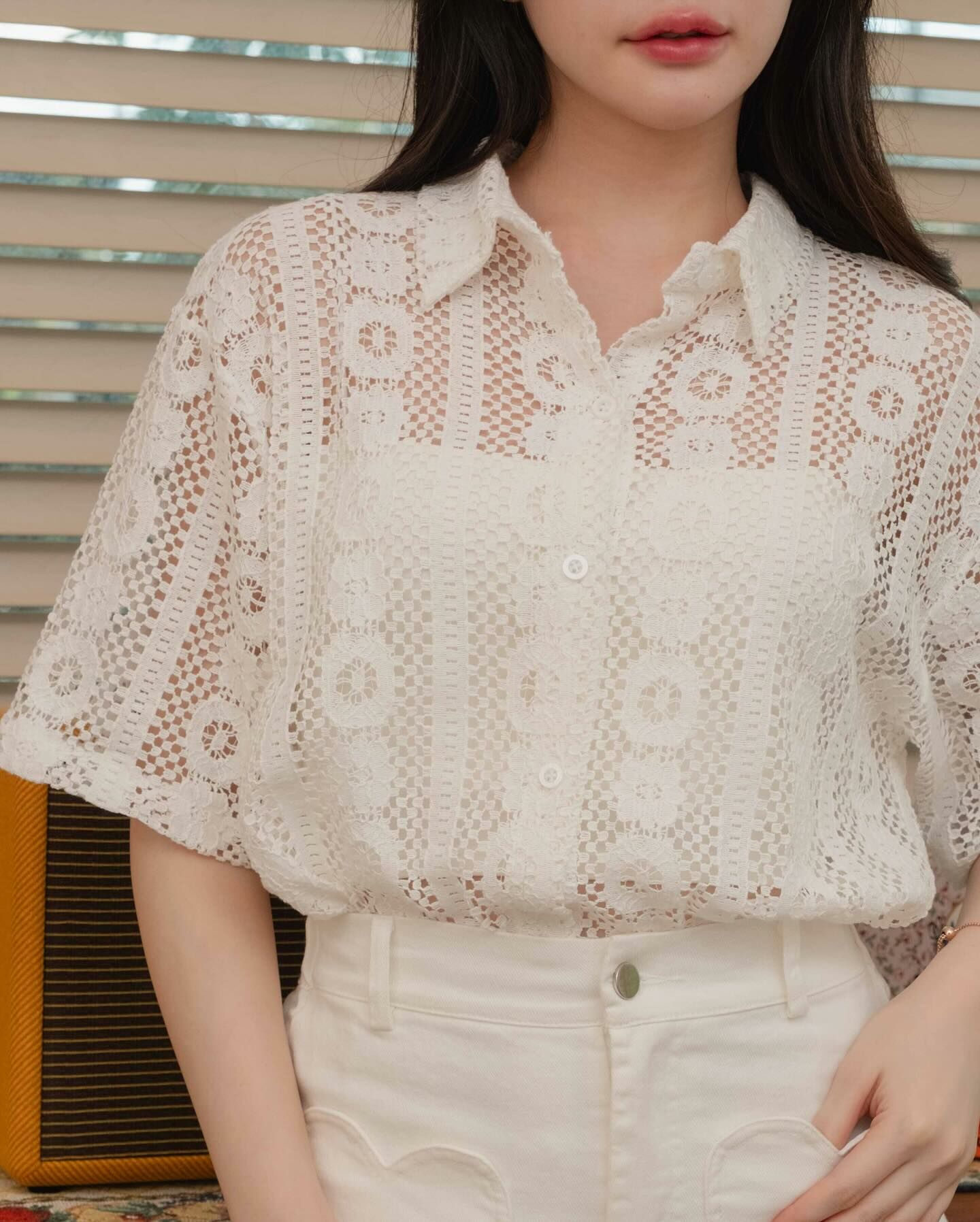 花卉蕾絲短袖襯衫搭配人造絲義大利面。