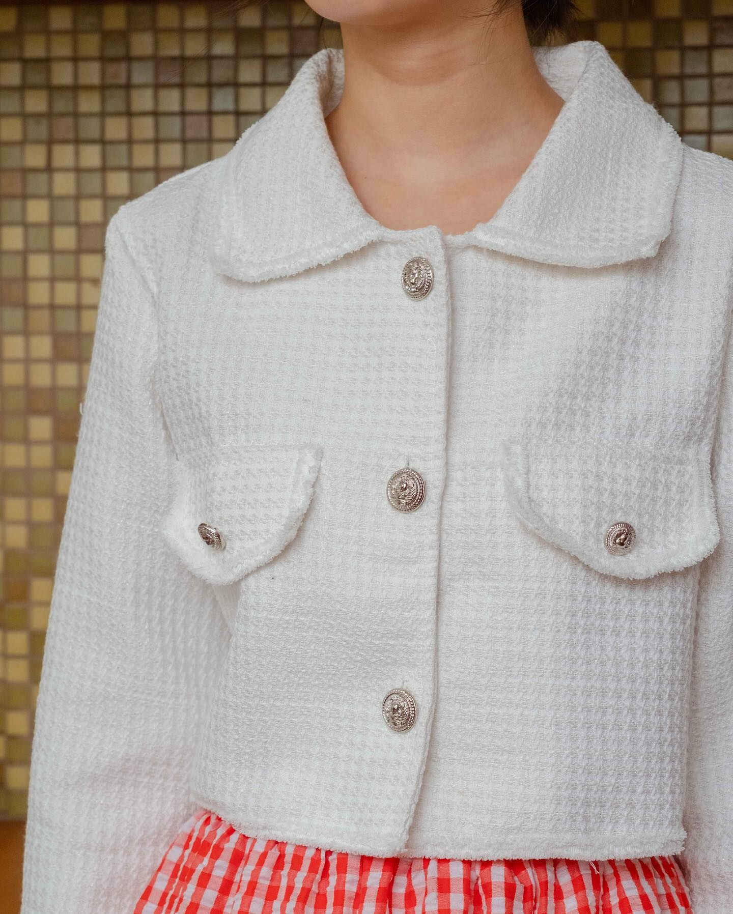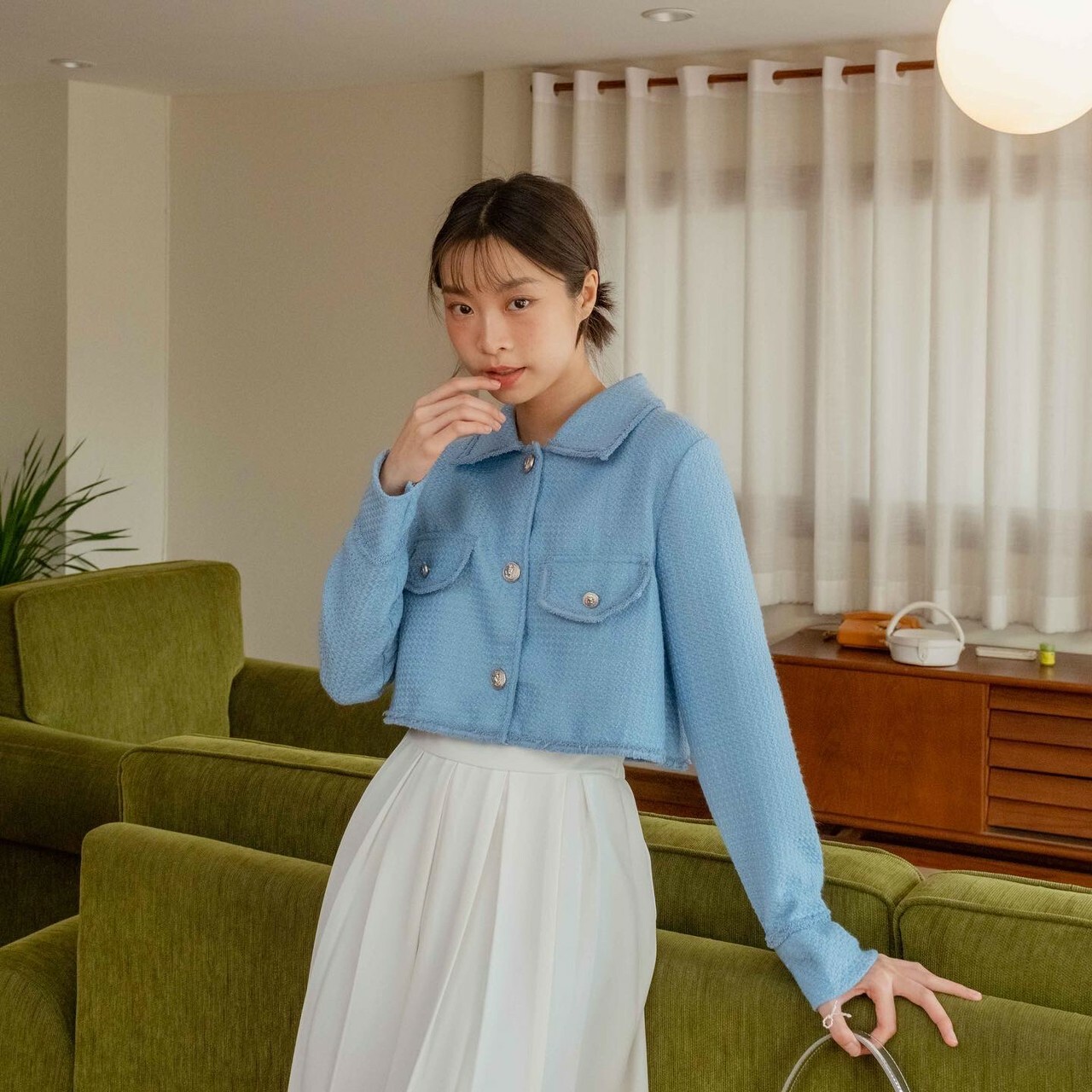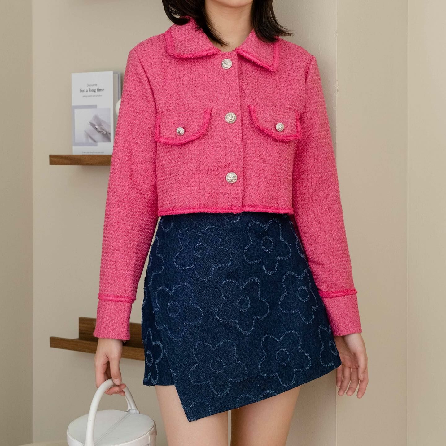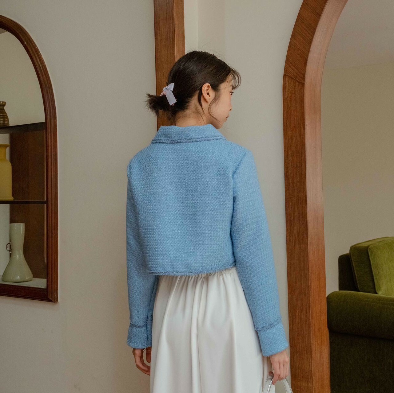長袖粗呢襯衫穿上時,無論扣上釦子還是解開釦子,都很可愛。