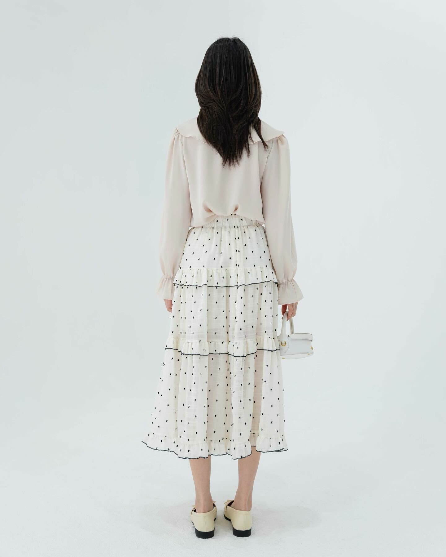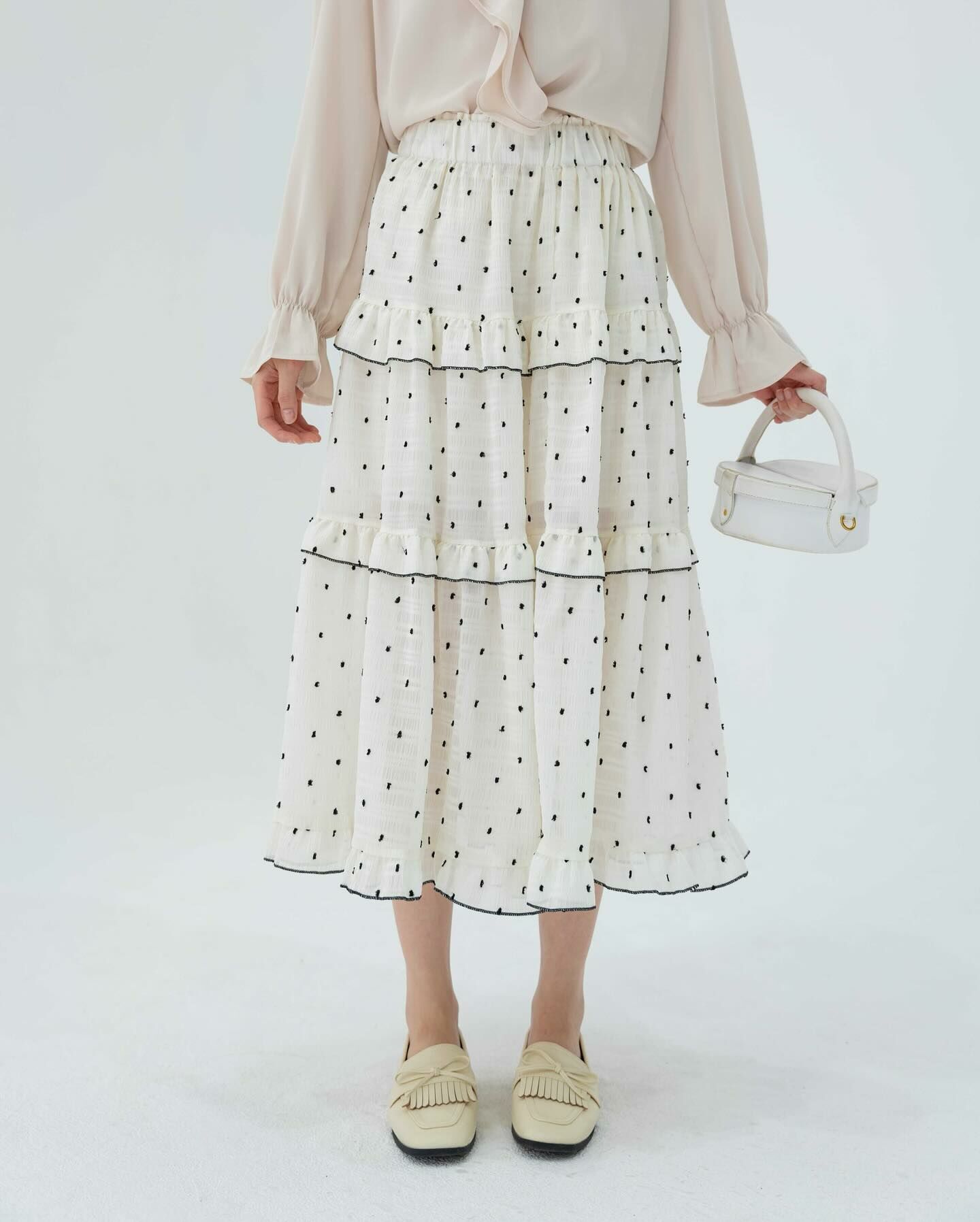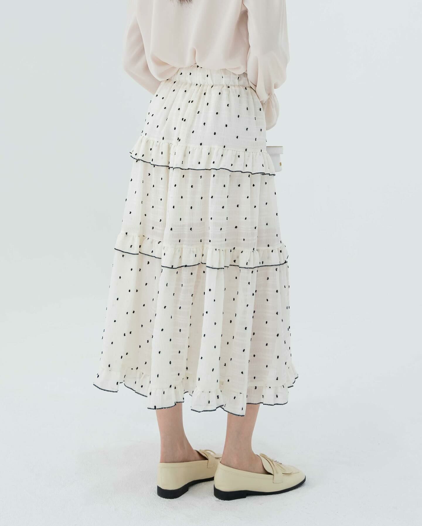棉質 + 聚酯纖維裙,圓點圖案,層疊荷葉邊,鬆緊腰帶
