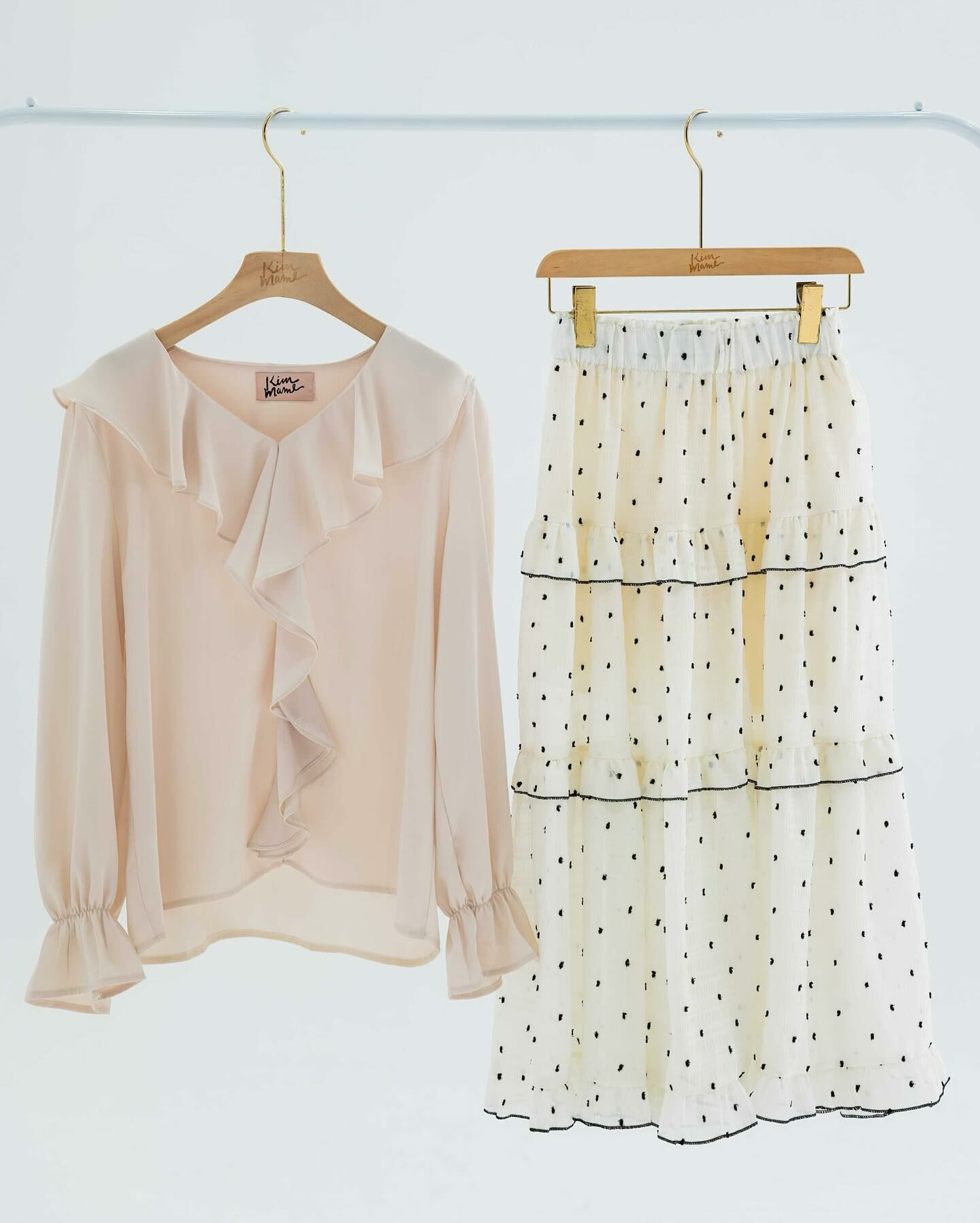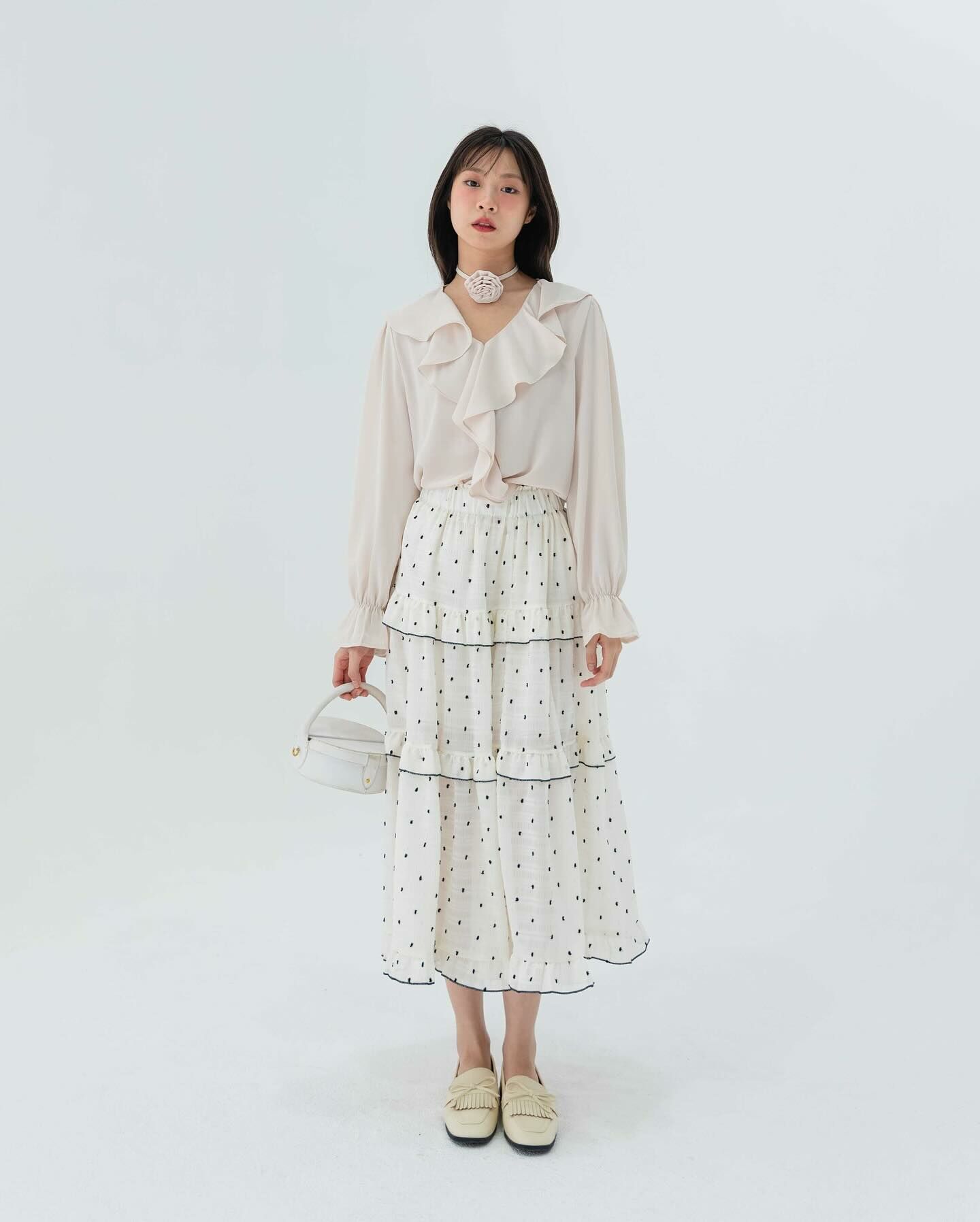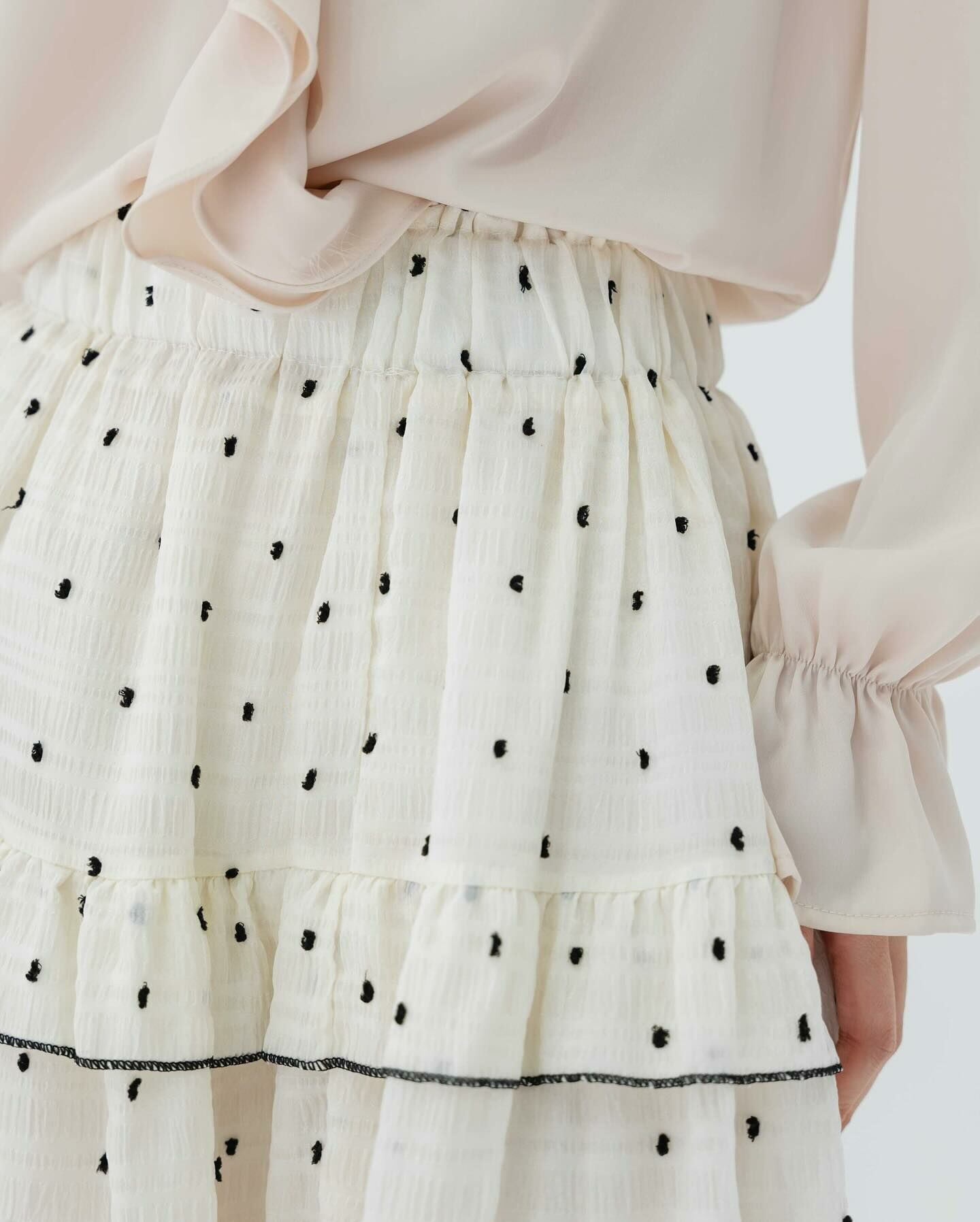 棉質 + 聚酯纖維裙,圓點圖案,層疊荷葉邊,鬆緊腰帶