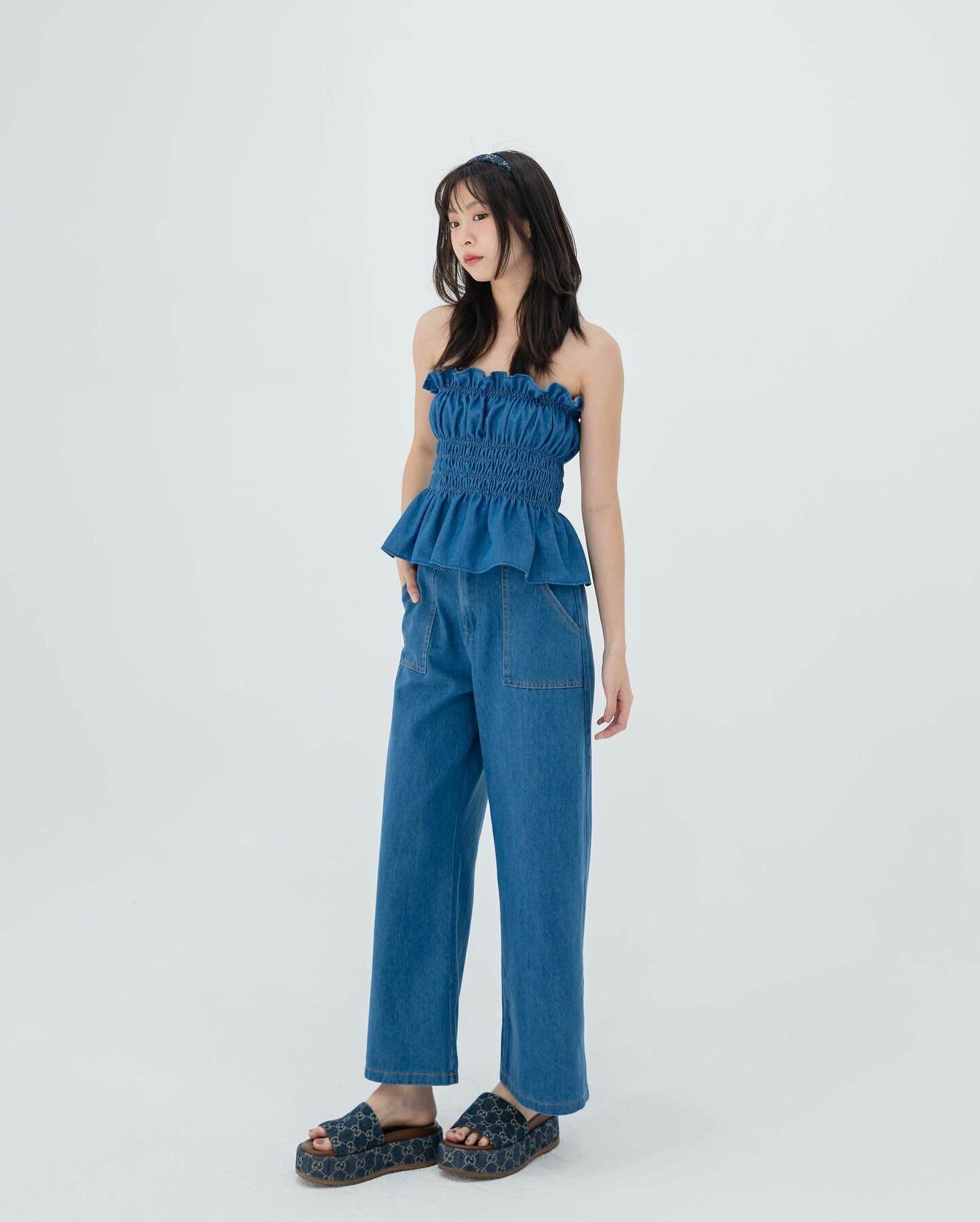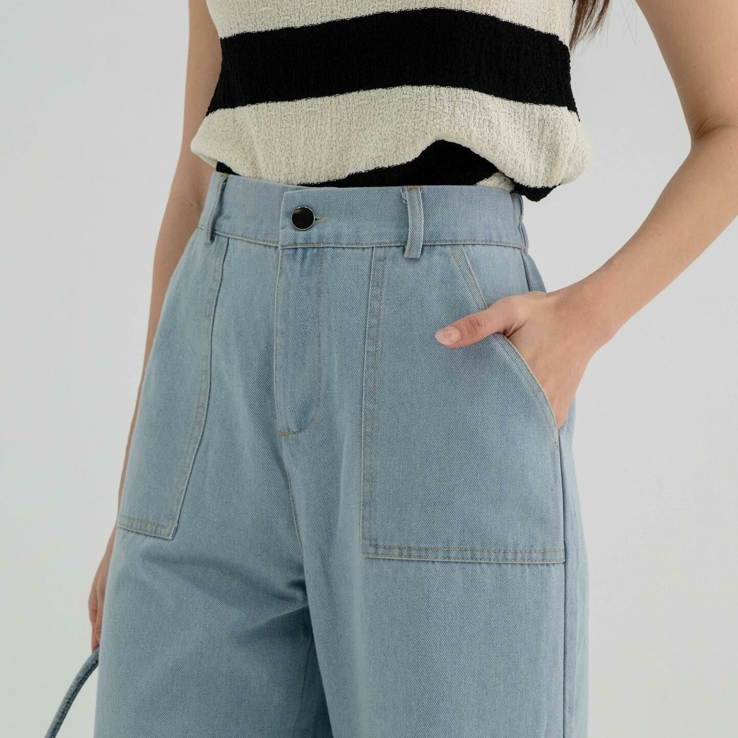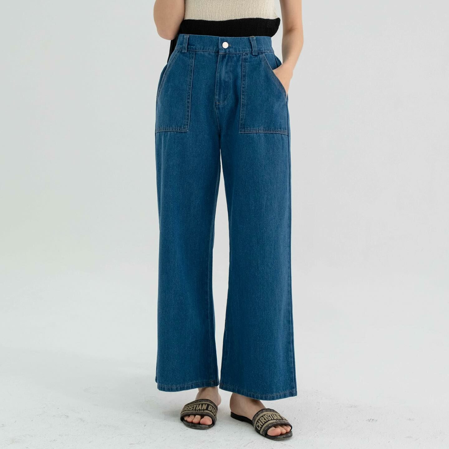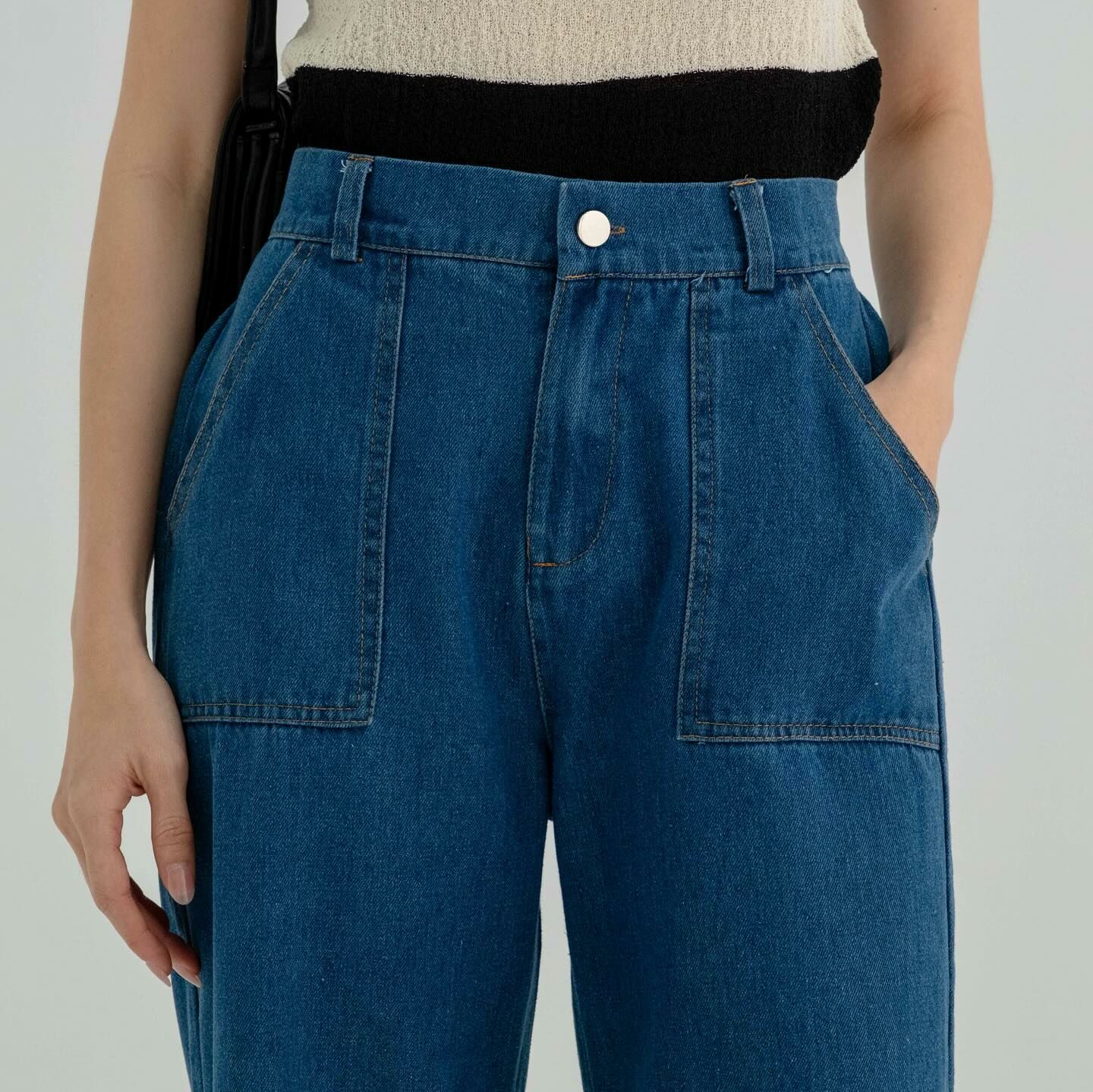 直腿牛仔褲,直線細節,前口袋,後背褶飾,高腰,襠長。