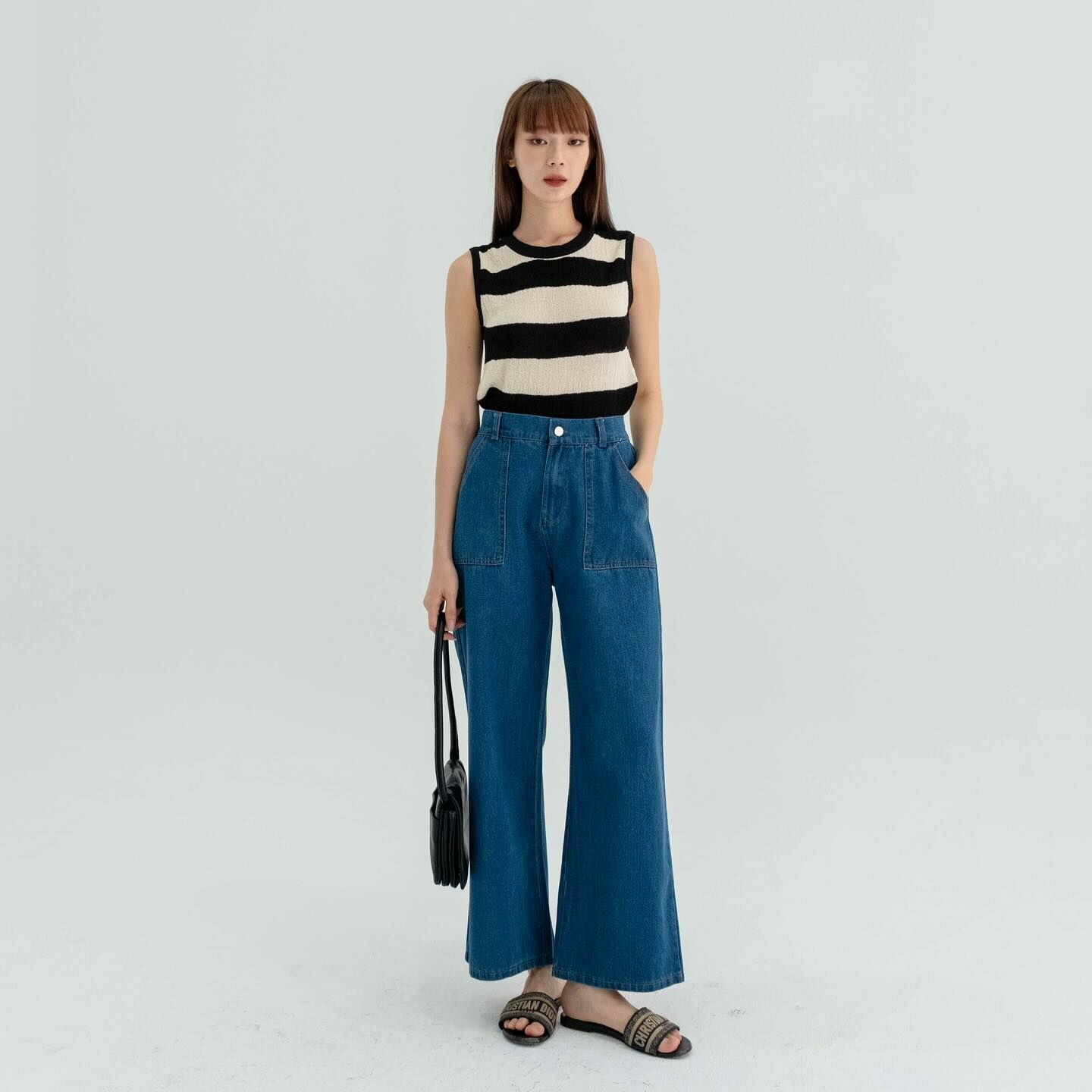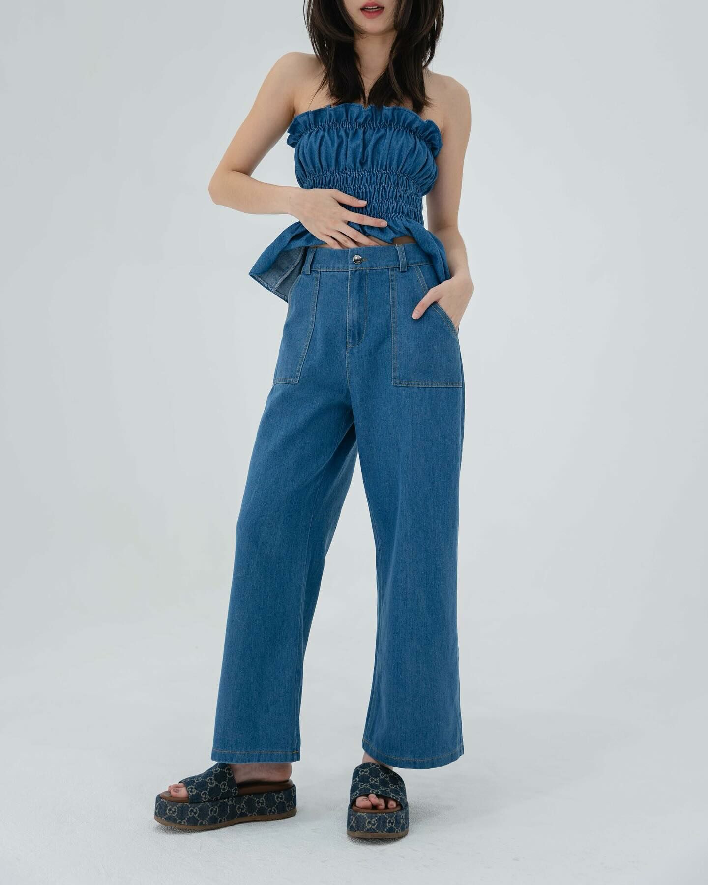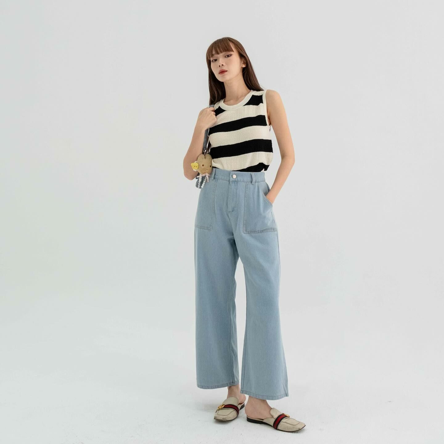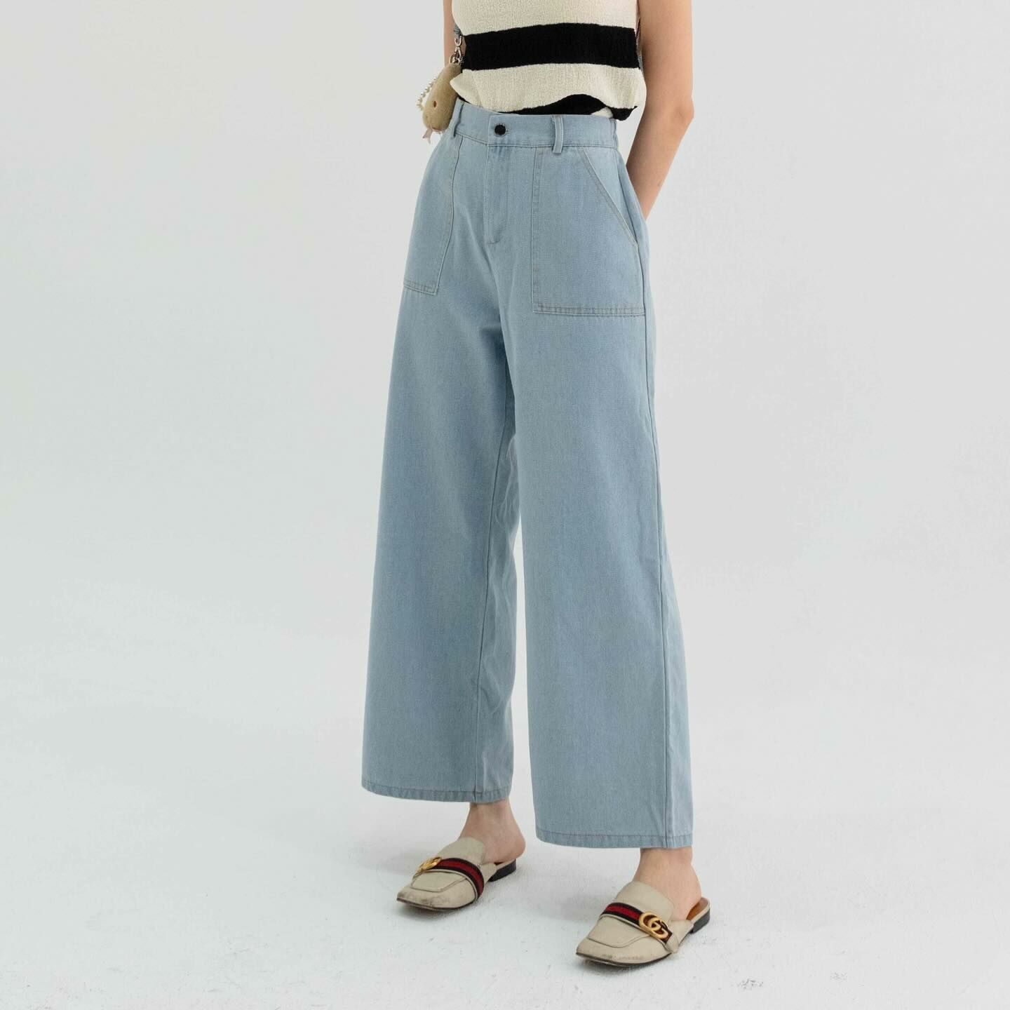 直腿牛仔褲,直線細節,前口袋,後背褶飾,高腰,襠長。
