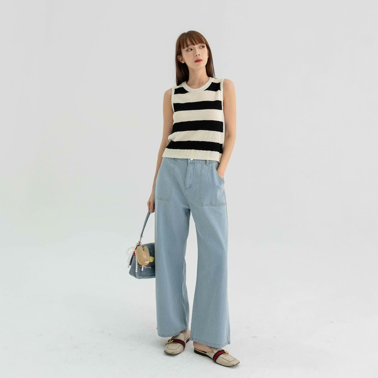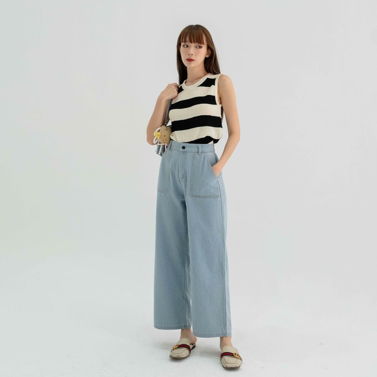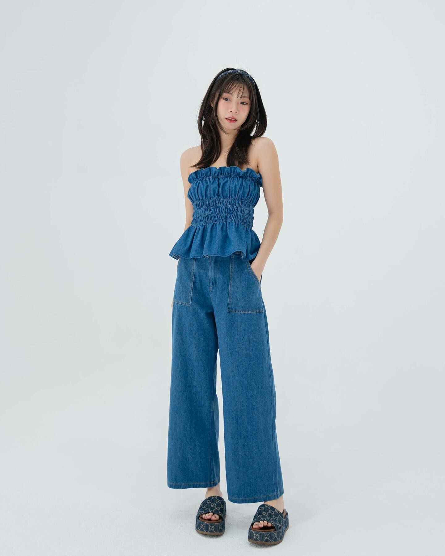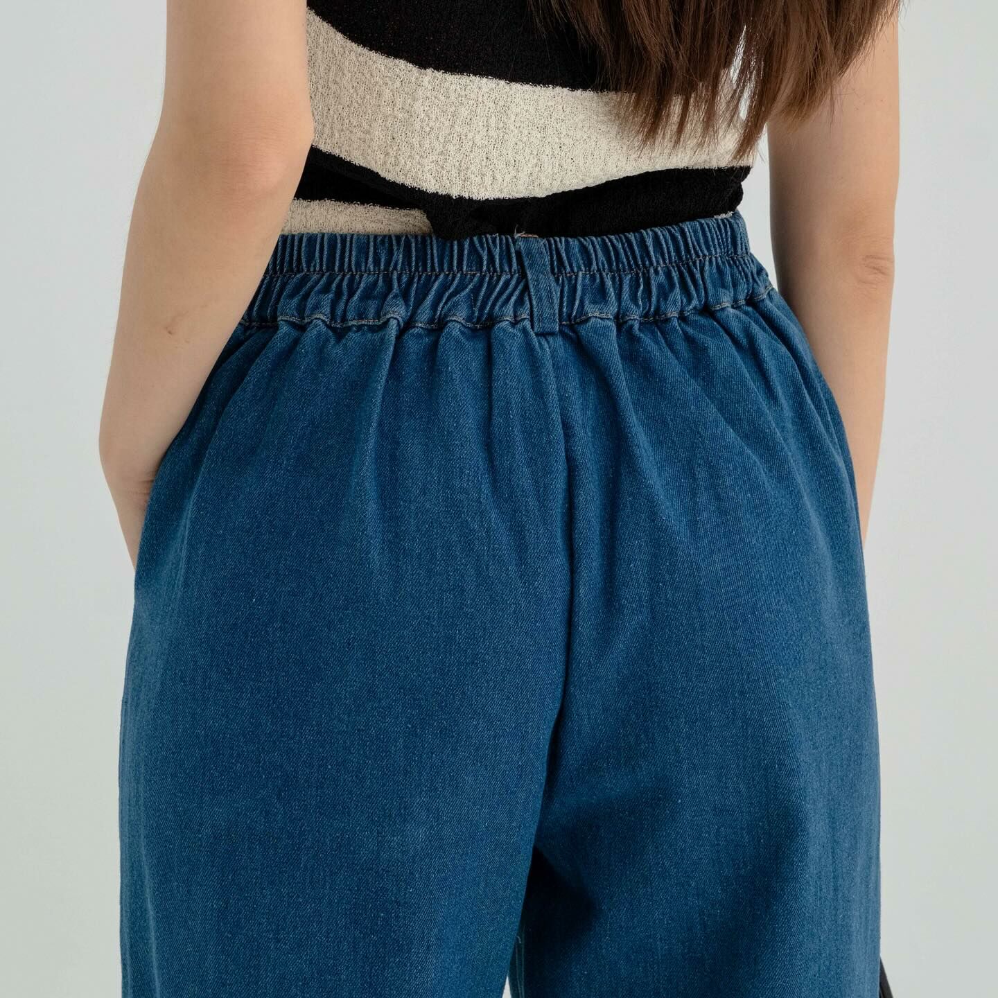 直腿牛仔褲,直線細節,前口袋,後背褶飾,高腰,襠長。