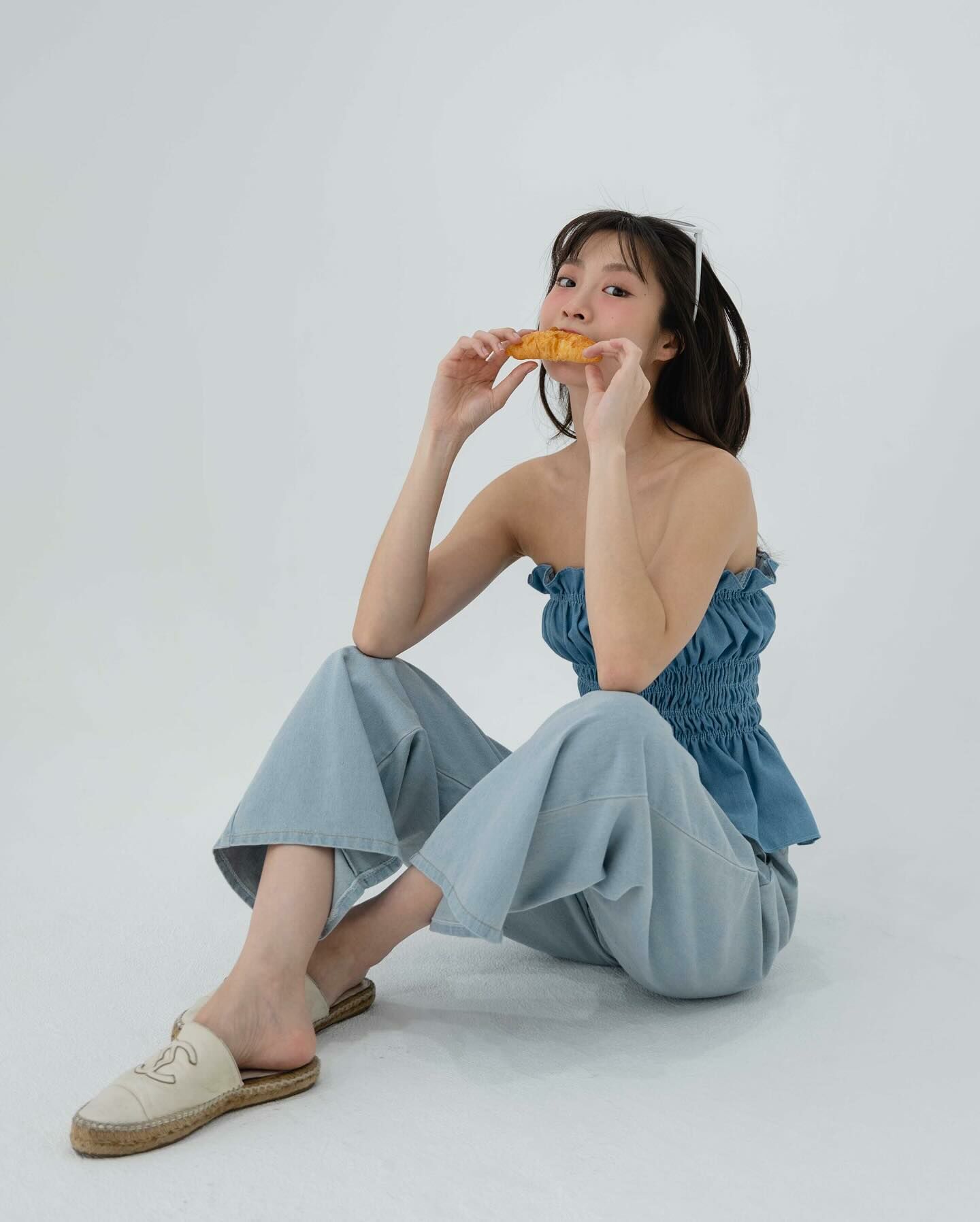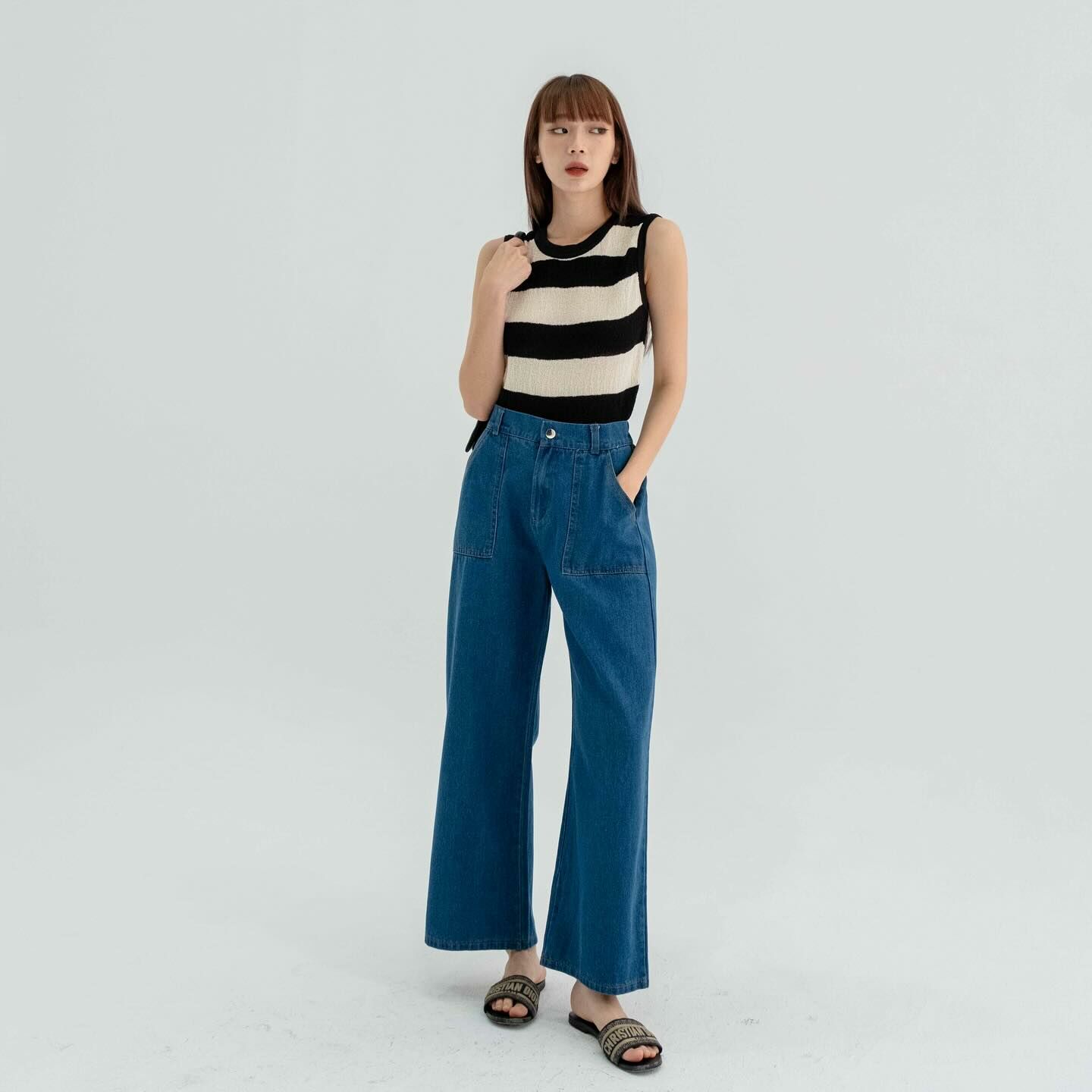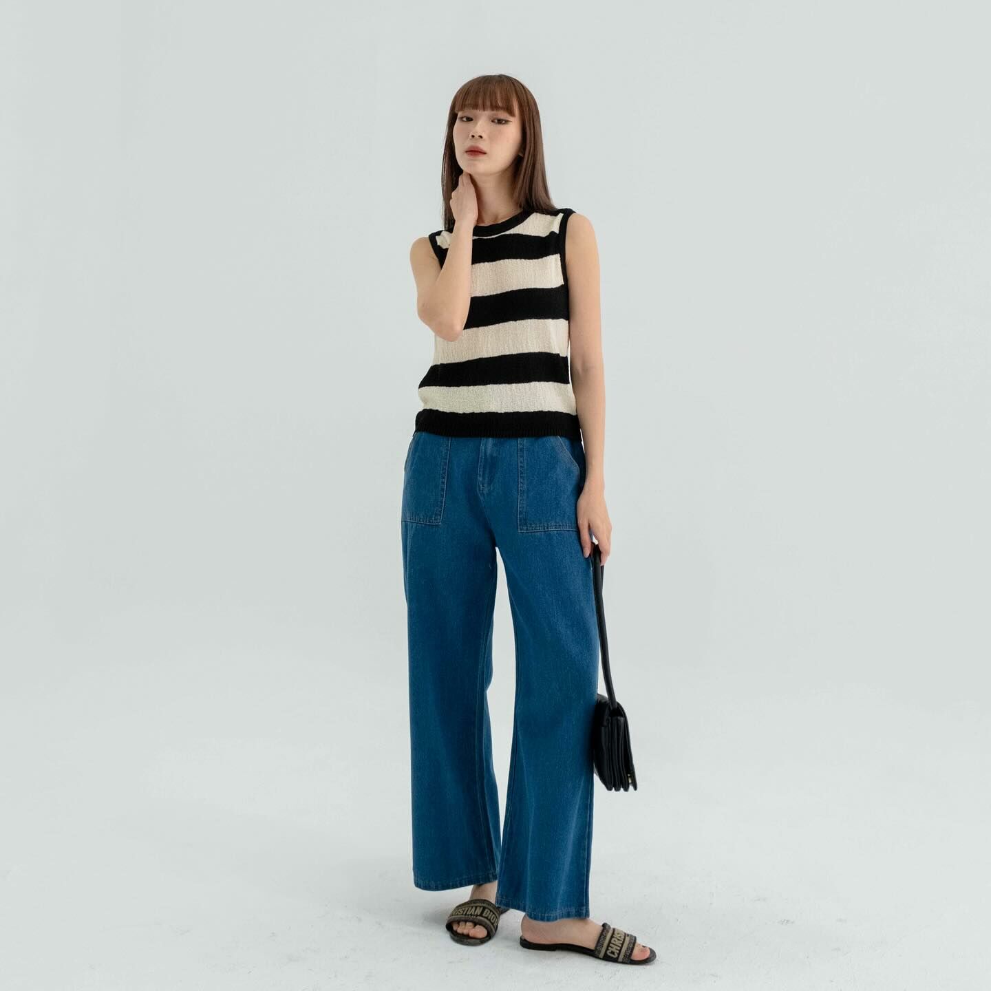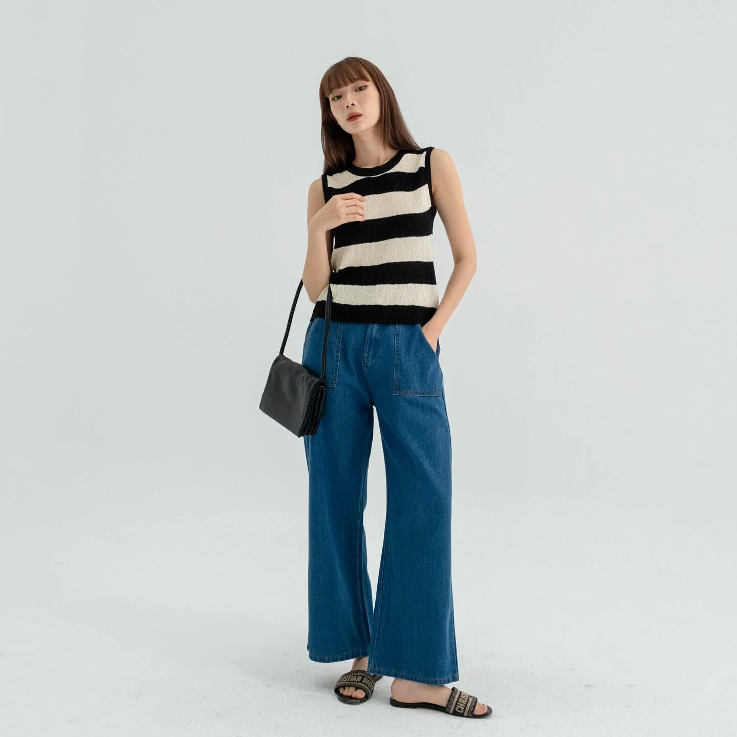 直腿牛仔褲,直線細節,前口袋,後背褶飾,高腰,襠長。