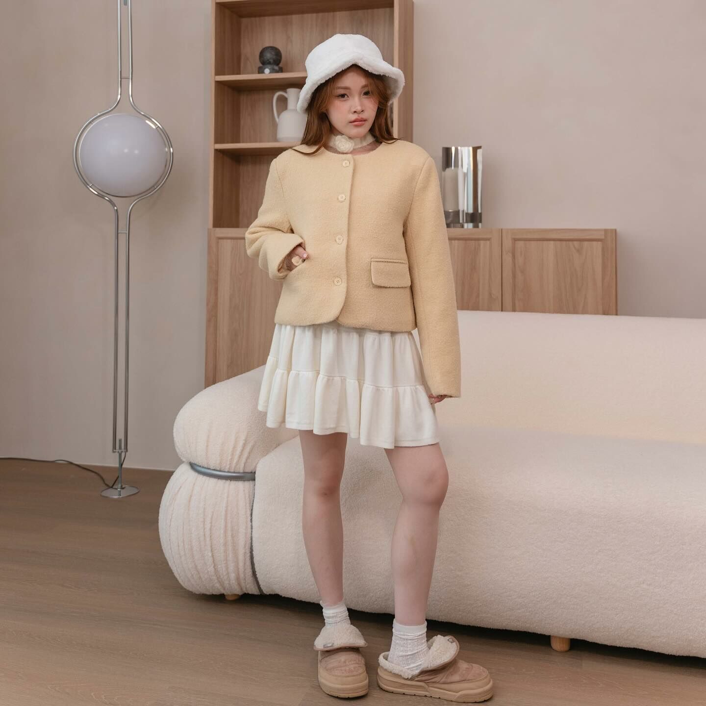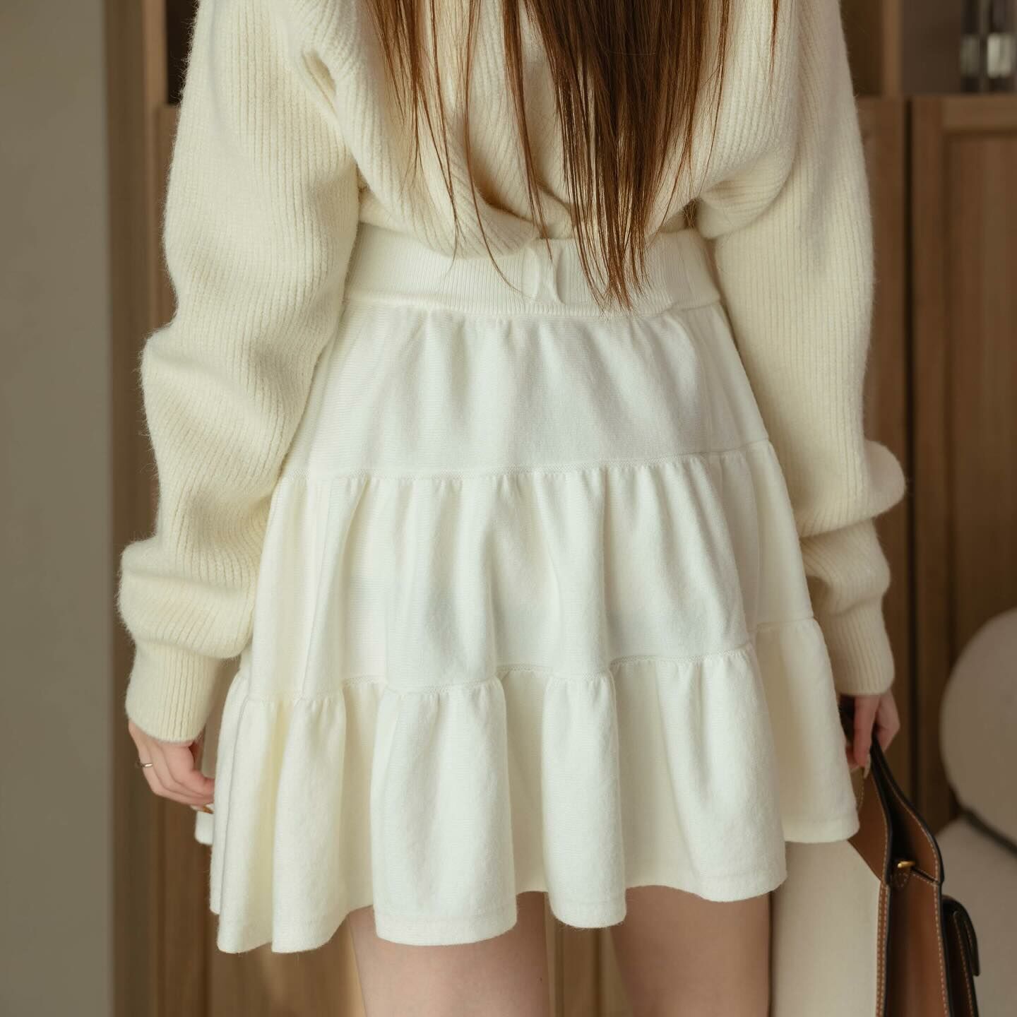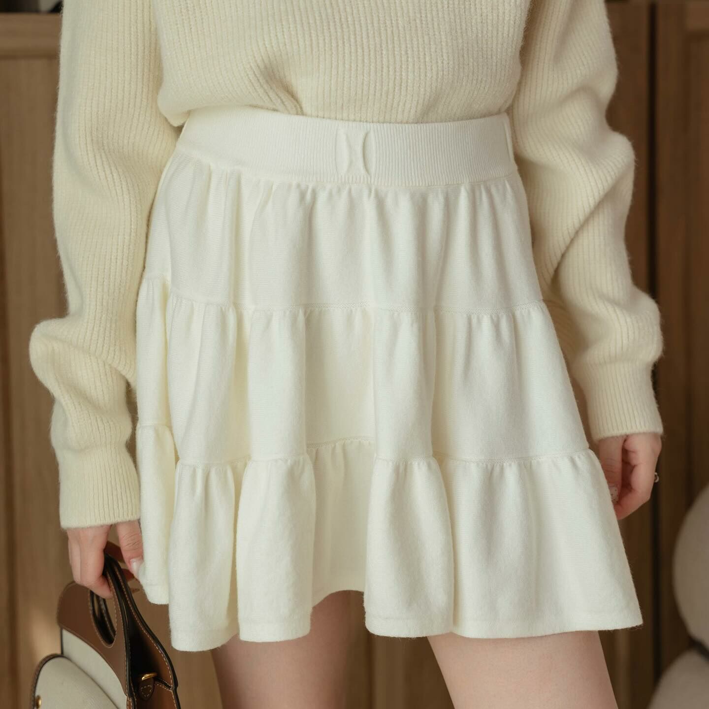 一件由絲綢面料製成的短款分層荷葉邊裙,配有鬆緊腰帶,穿著舒適,並配有腰帶環。