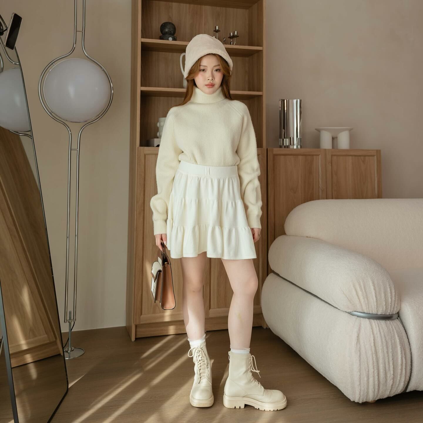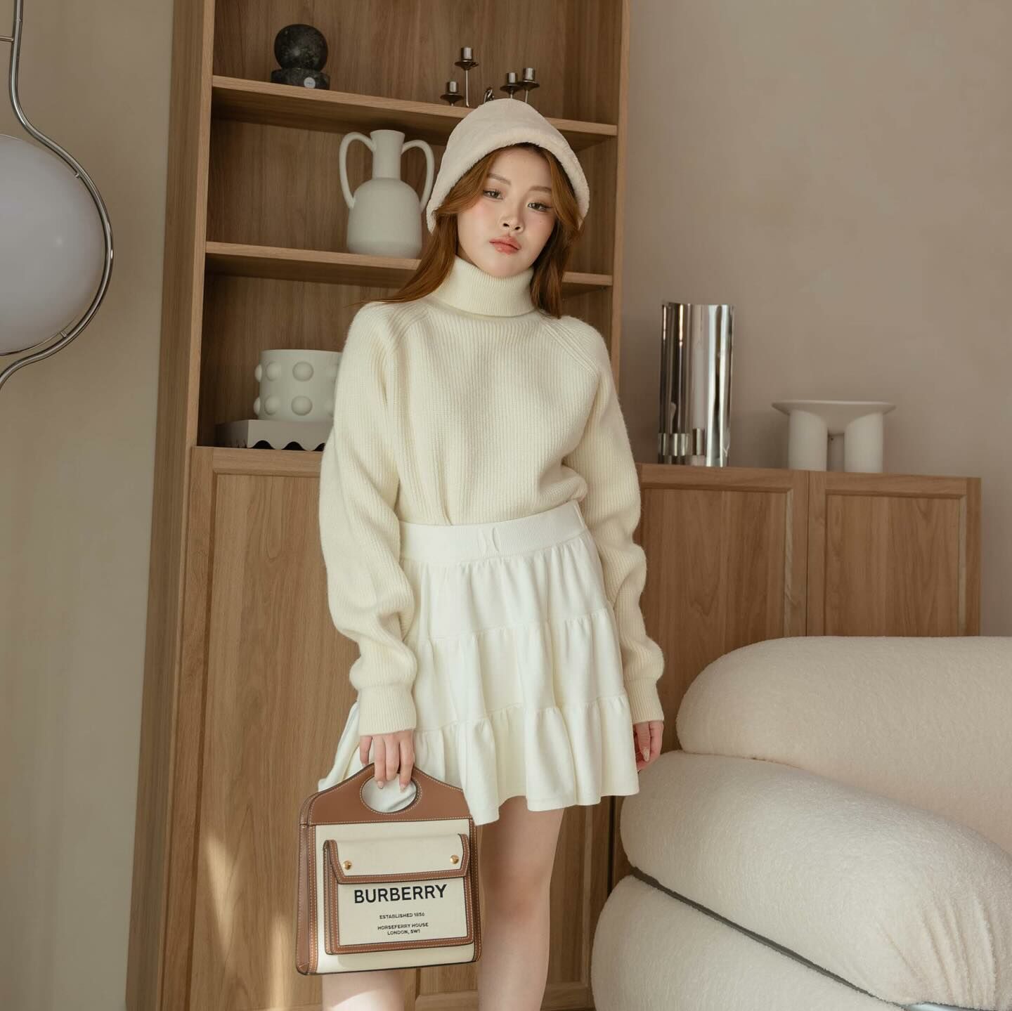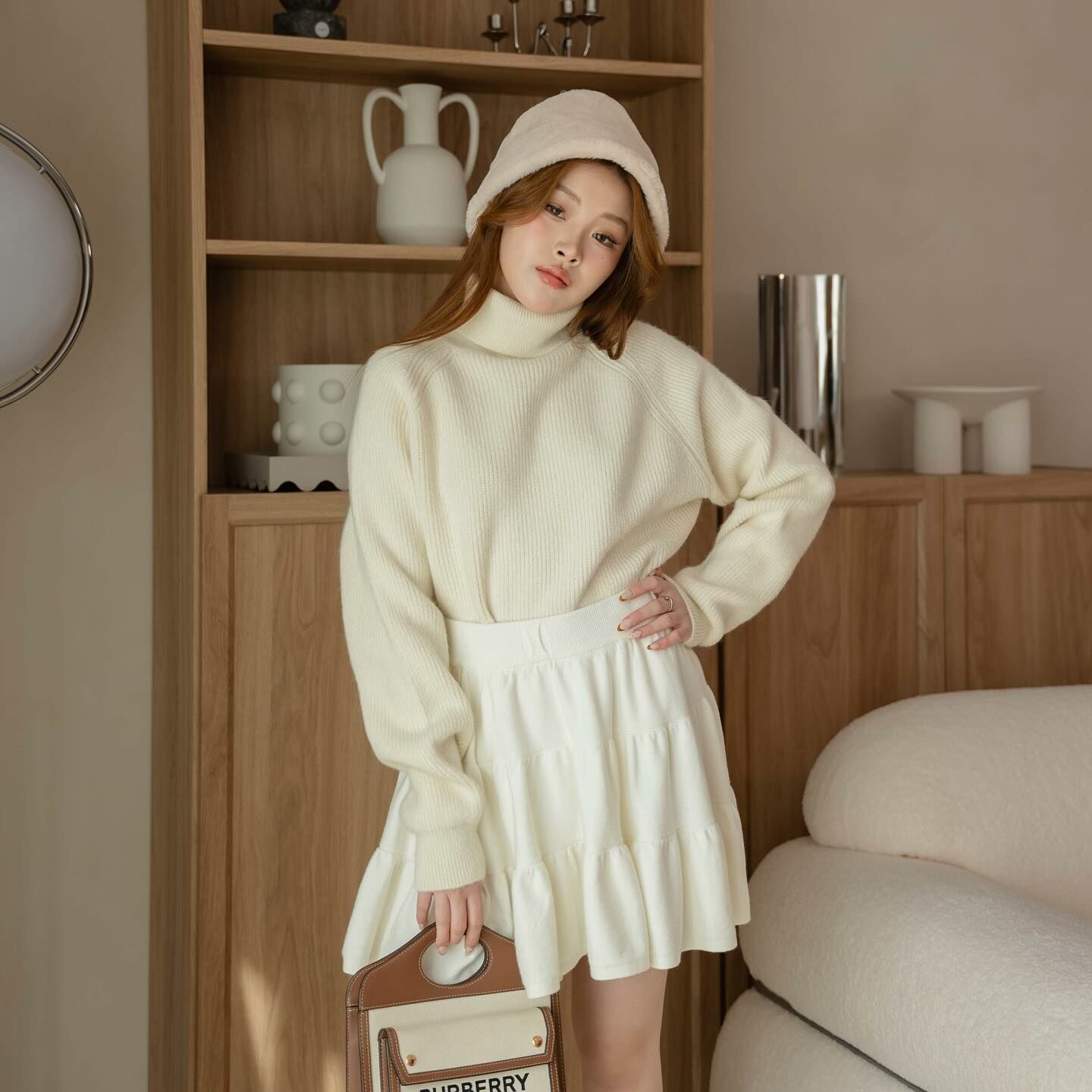一件由絲綢面料製成的短款分層荷葉邊裙,配有鬆緊腰帶,穿著舒適,並配有腰帶環。
