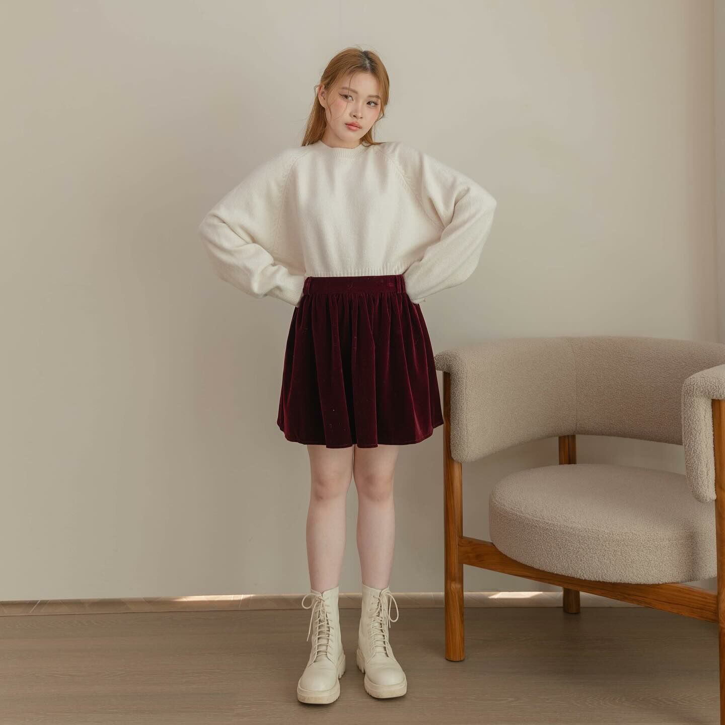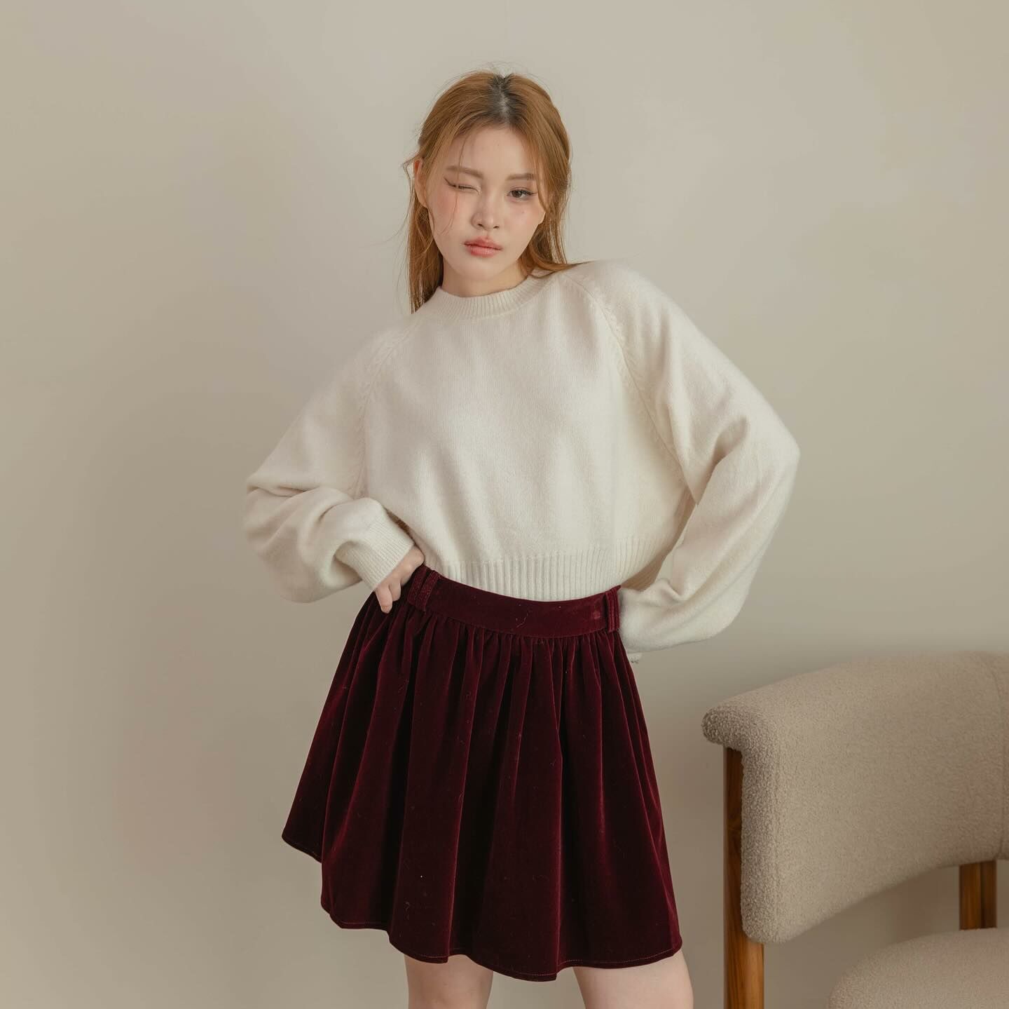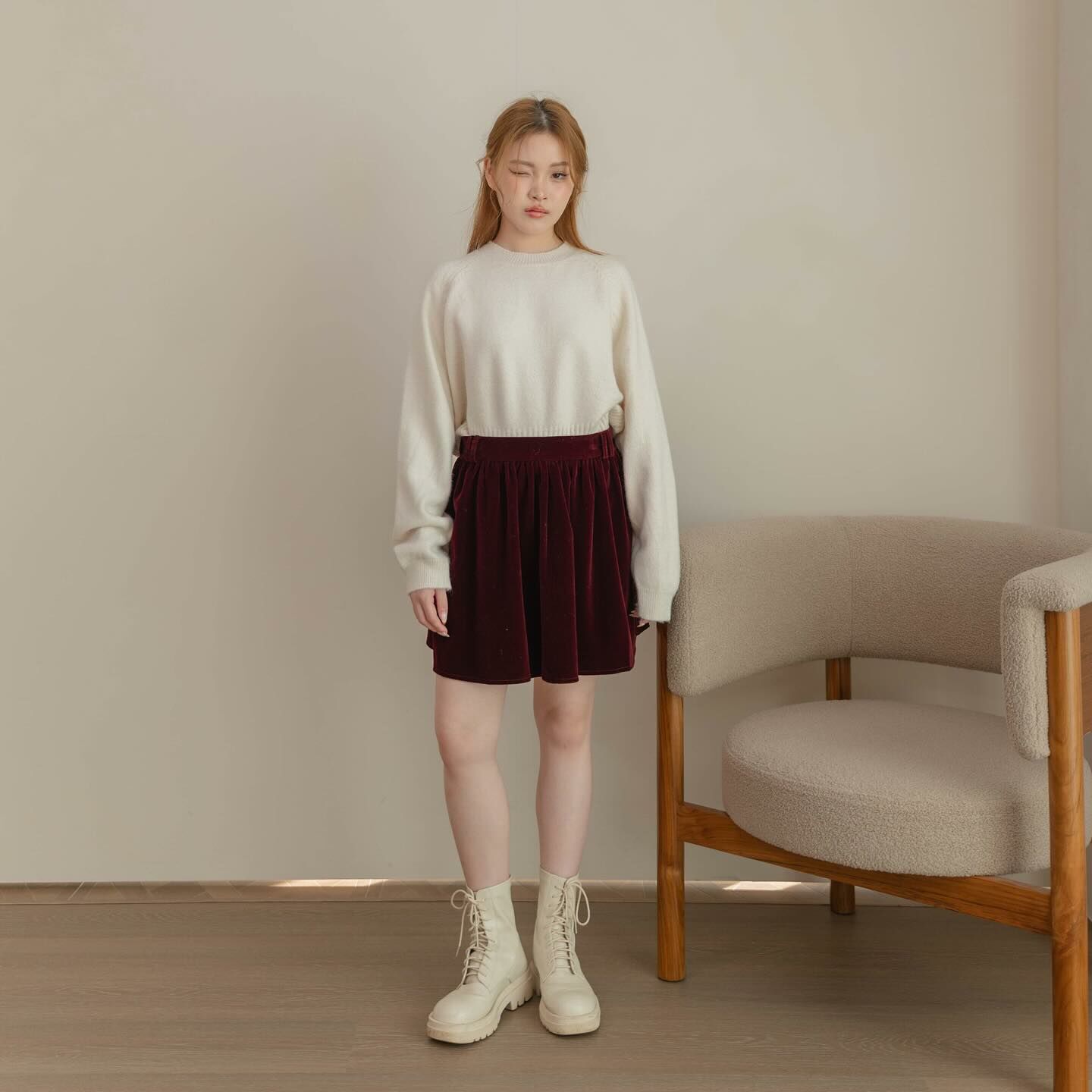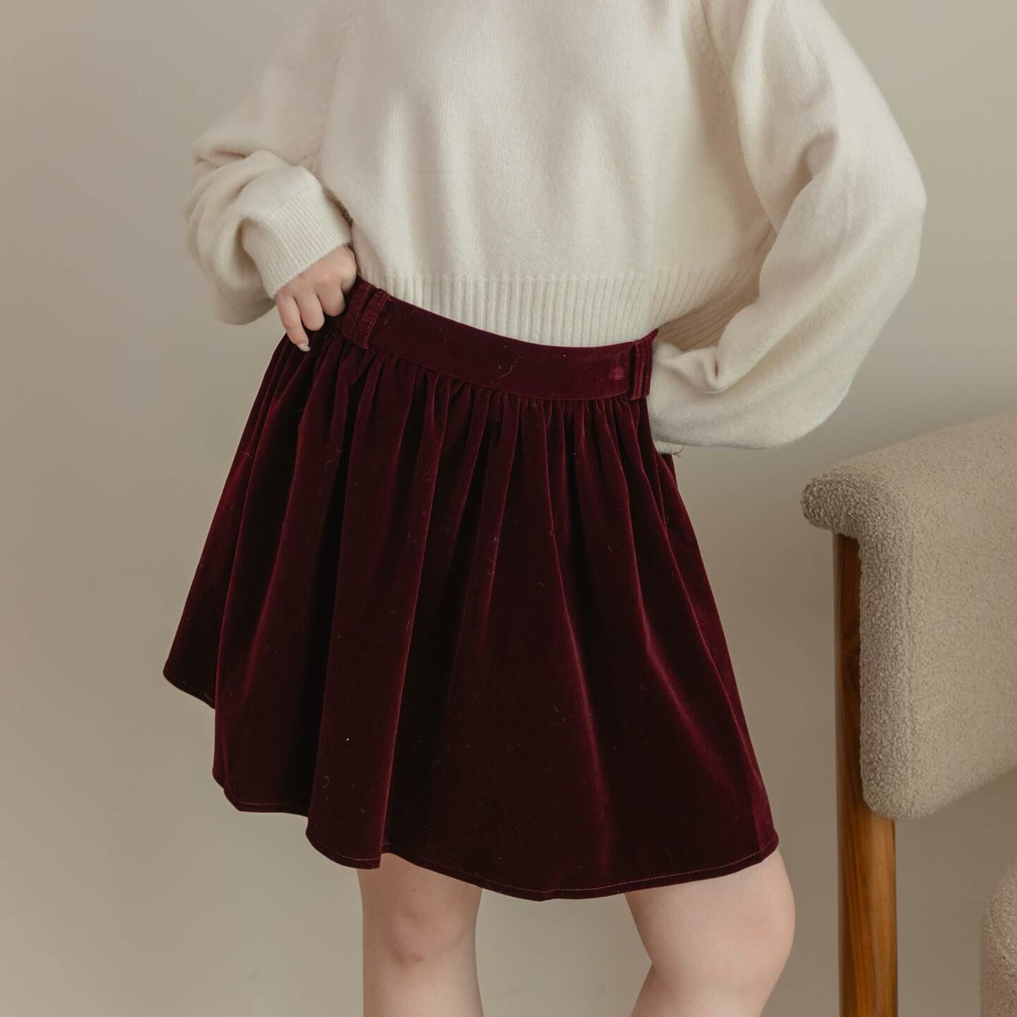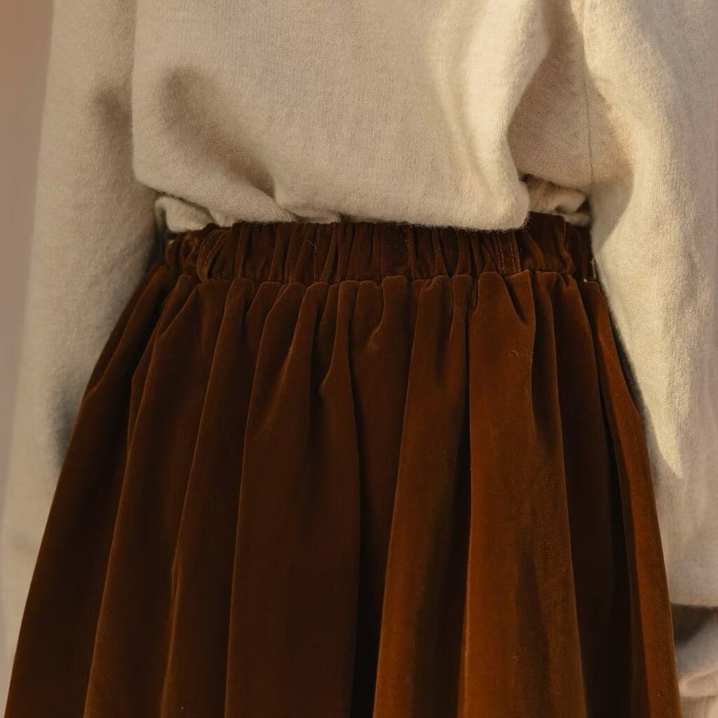 天鵝絨布料的短裙,後背有褶飾,內襯是褲子,很適合秋冬之季節。