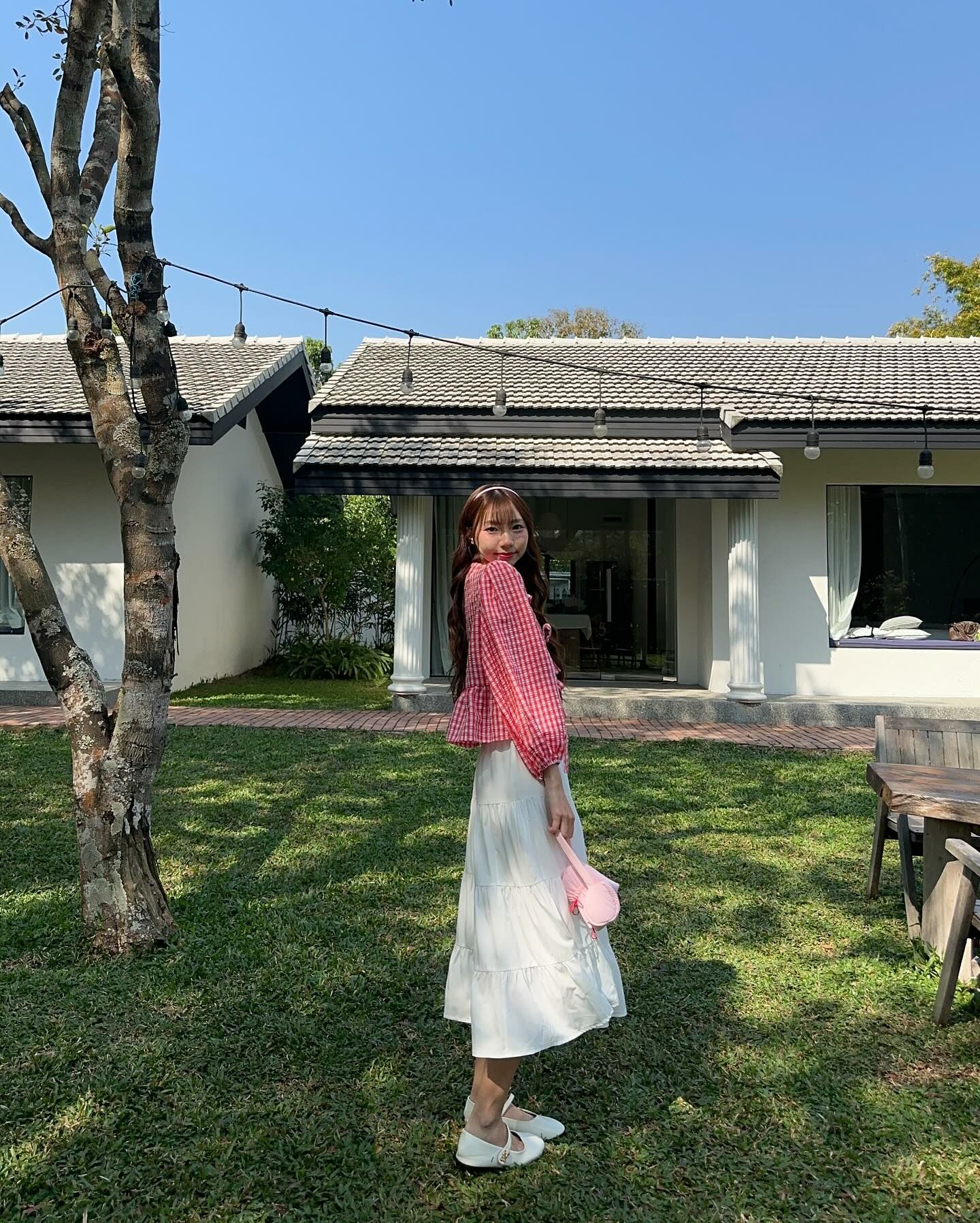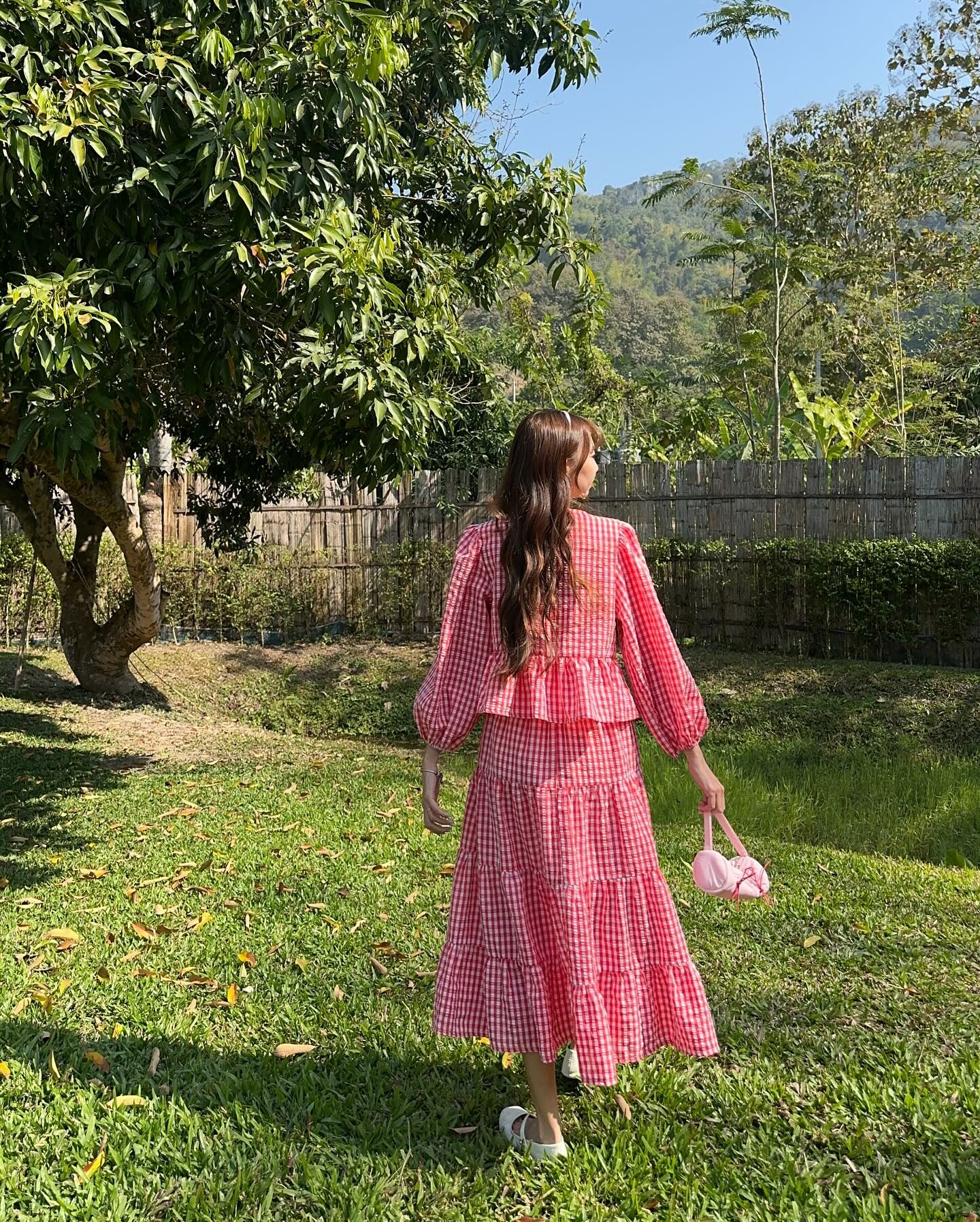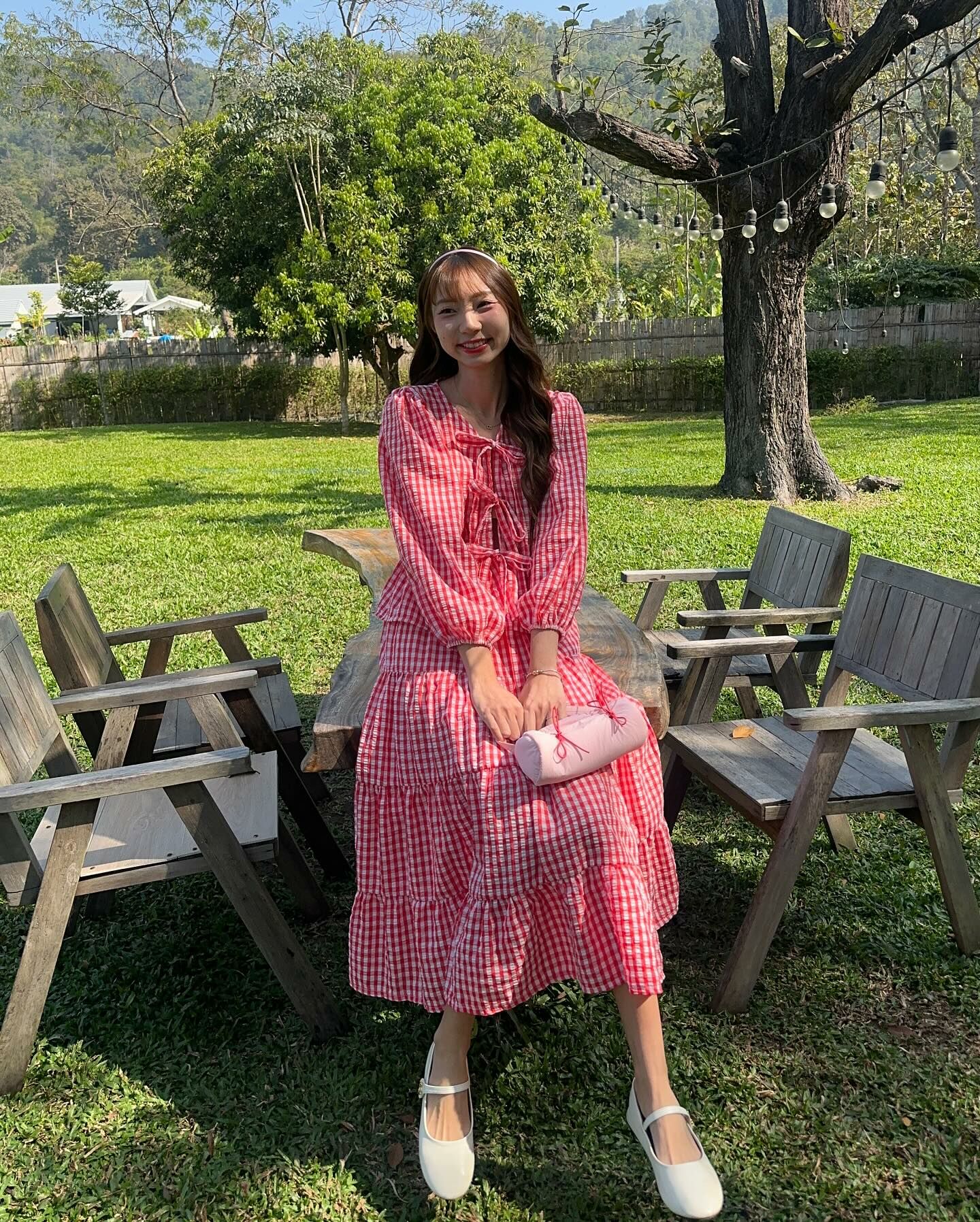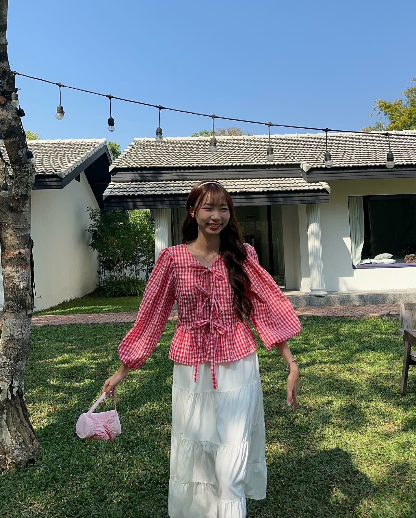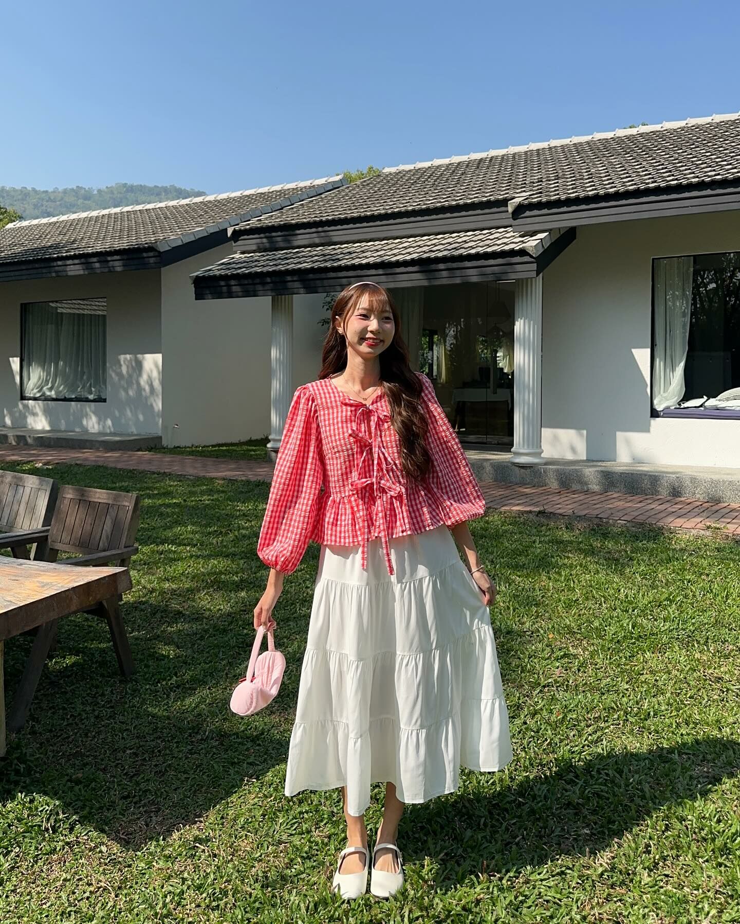 泡泡袖襯衫,聚酯纖維布料,正面繫蝴蝶結,荷葉邊下擺