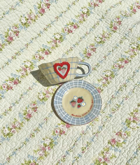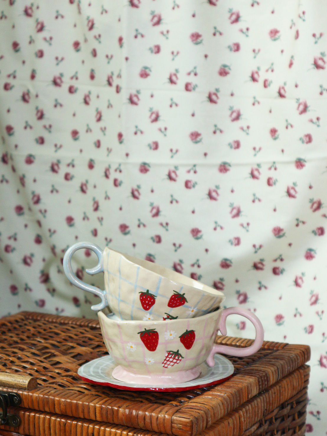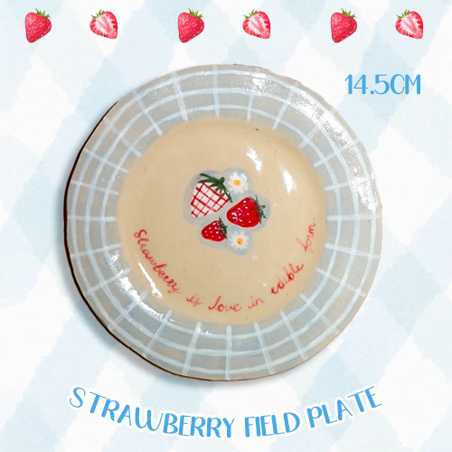 士多啤梨圖案,配襯淺藍格紋邊的陶瓷碟子,直徑約14.5cm